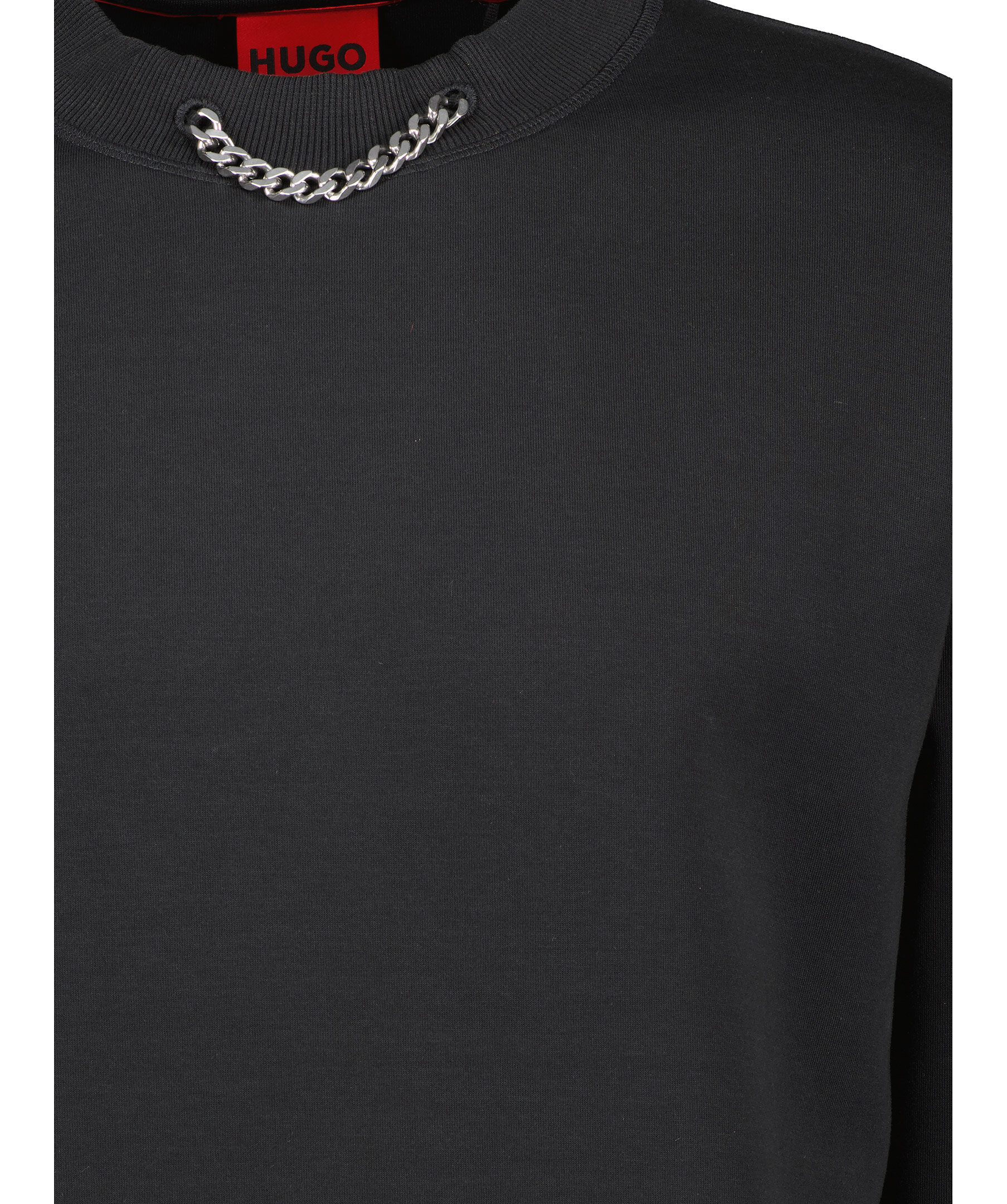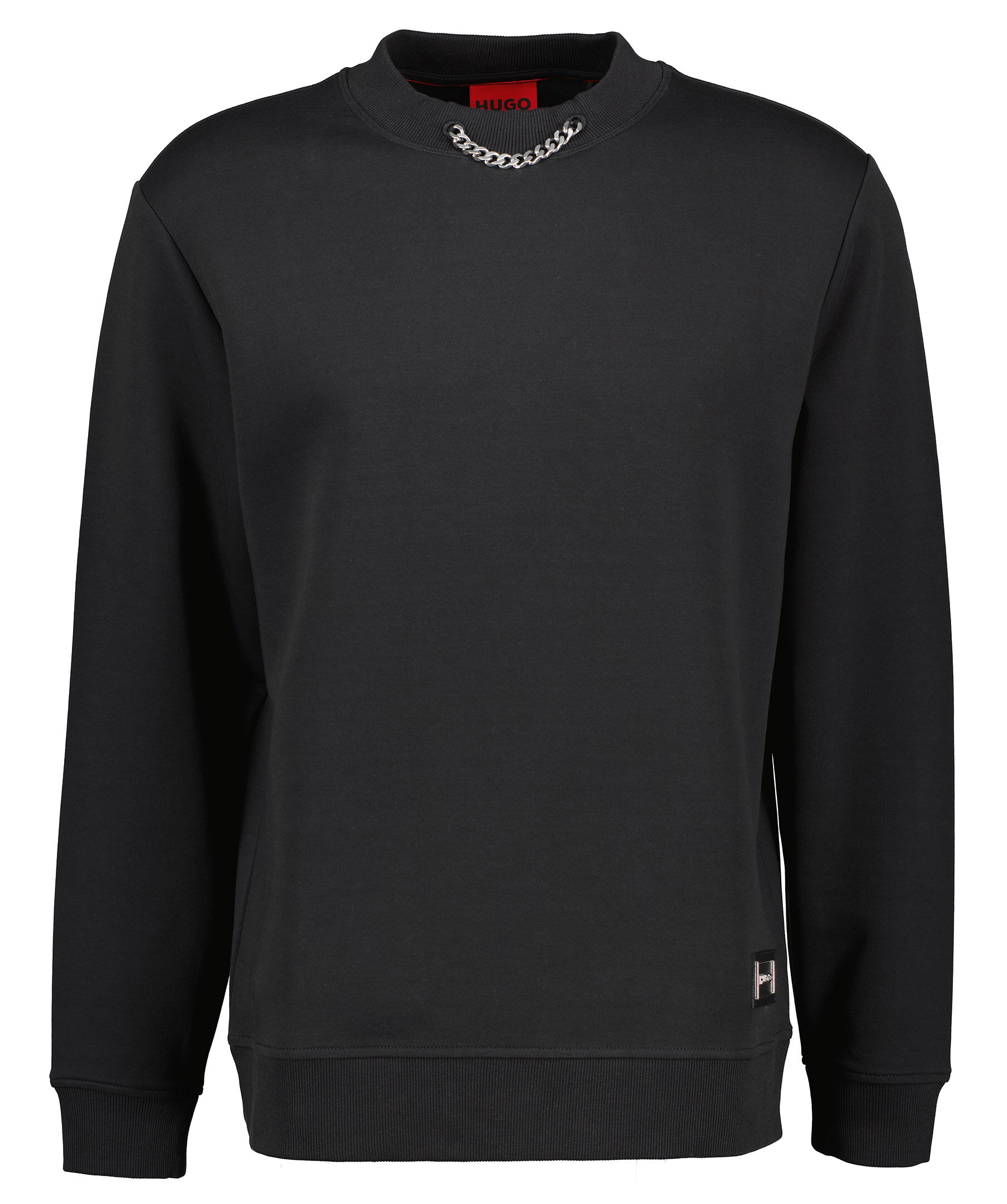 Svart sweatshirt från HUGO Men. Ribbstickade muddar vid, halsringningen, ärm- och plaggslut. Kedja vid halsringningen. Patch i läder och metall med logotyp vid plaggslut på vänster sida. Tillverkad i bomullsblandning.