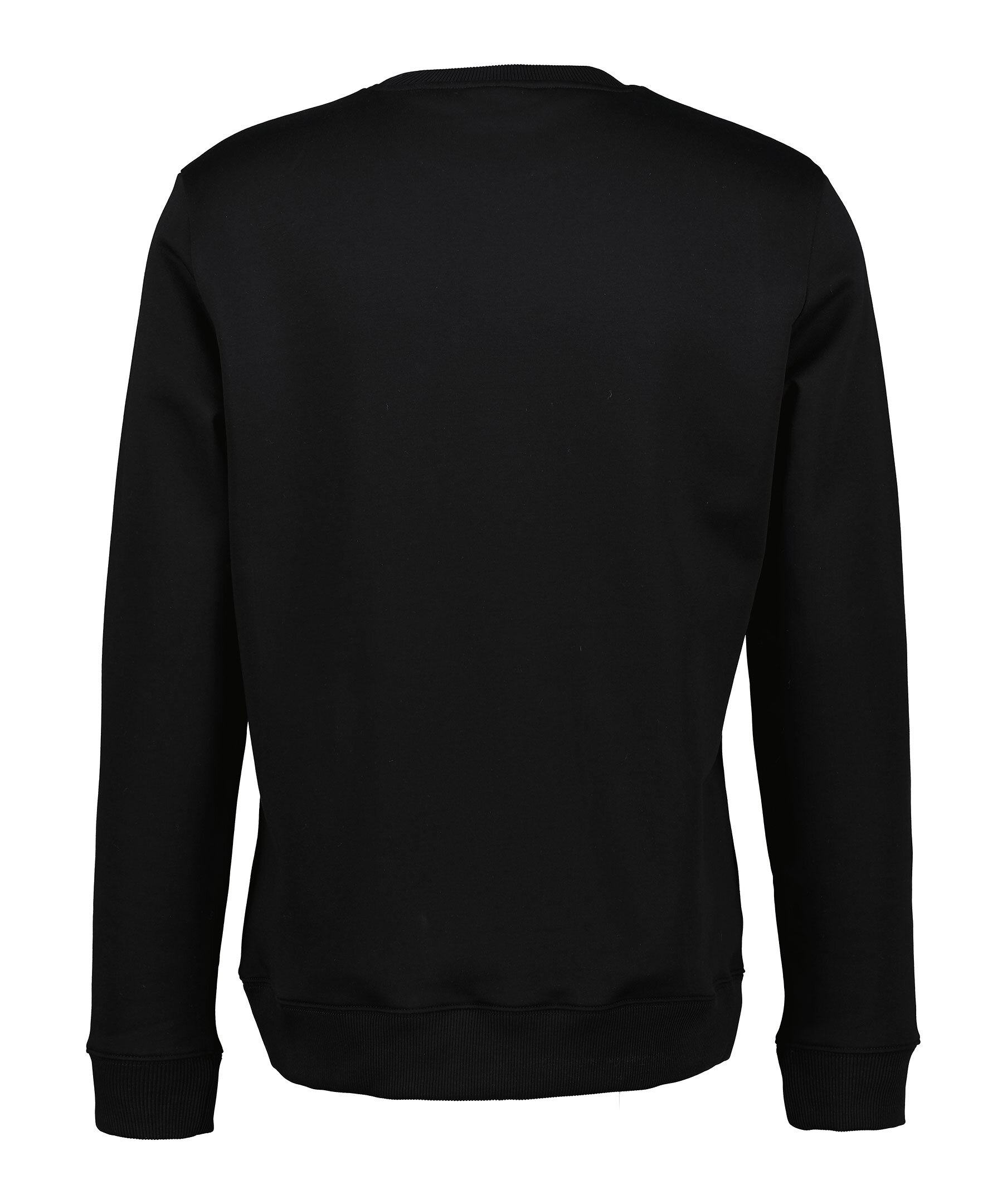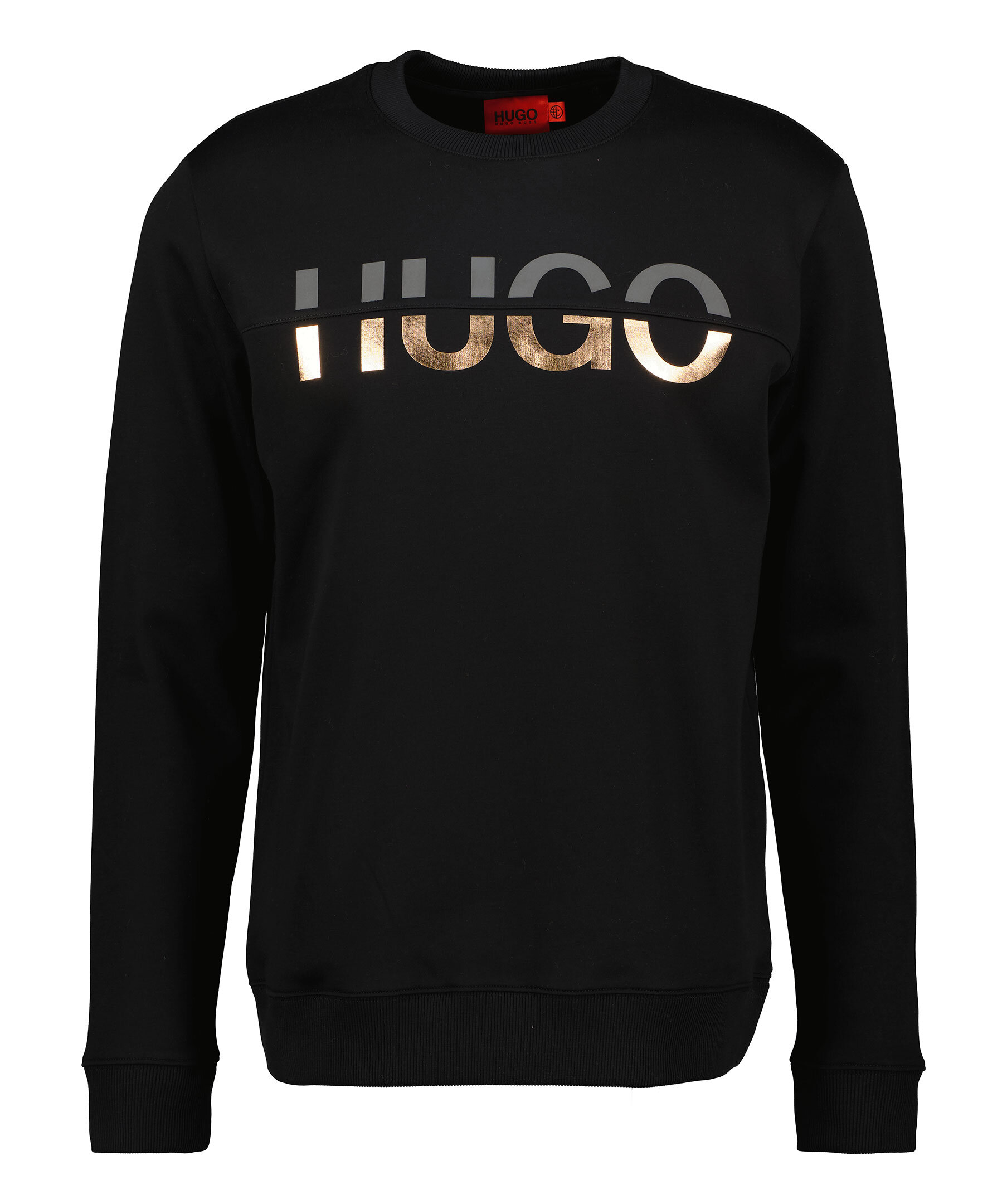 Svart sweatshirt från Hugo. Tryckt logotyp i guld och grått tryck över bröstet. Rundad halsringning. Ribbstickade muddar i krage ärm- och plaggslut.