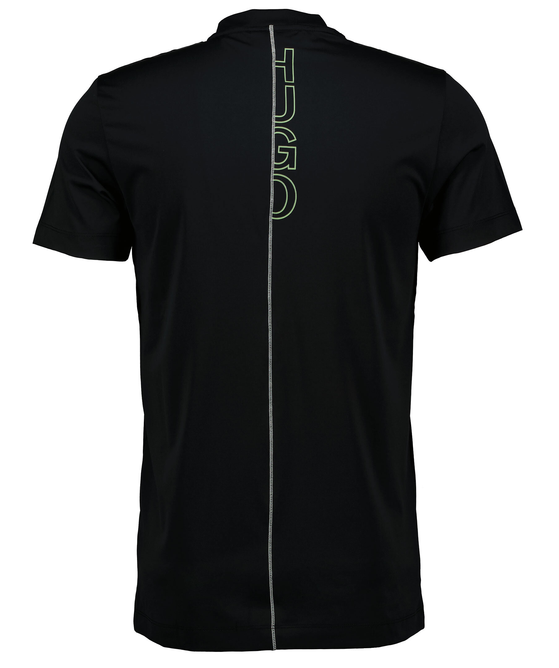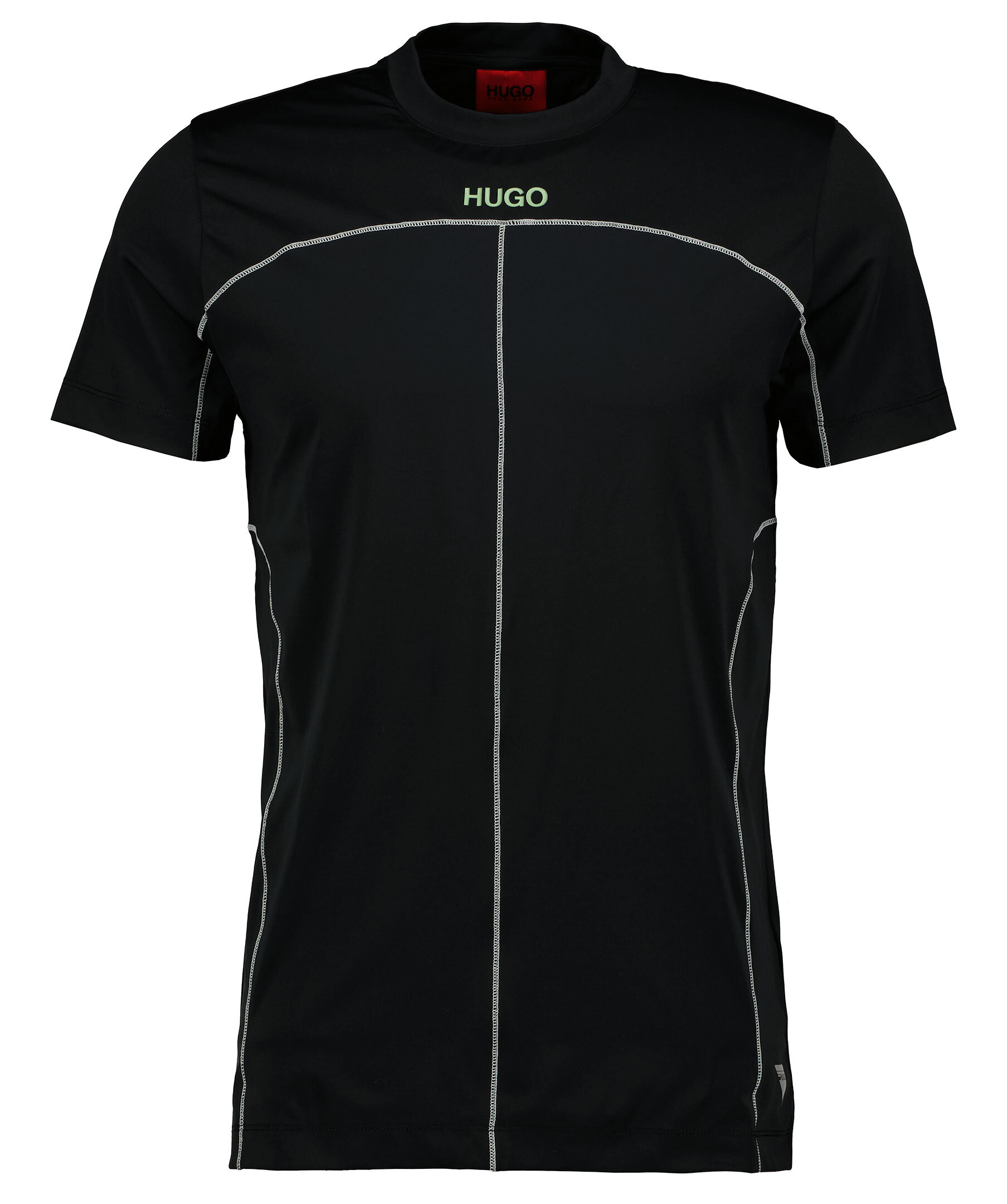 Svart tränings T-shirt från Hugo. Rundad halsringning. dekorativa sömmar i vitt. logotyp på bröstet tryckt i neongrön färg.