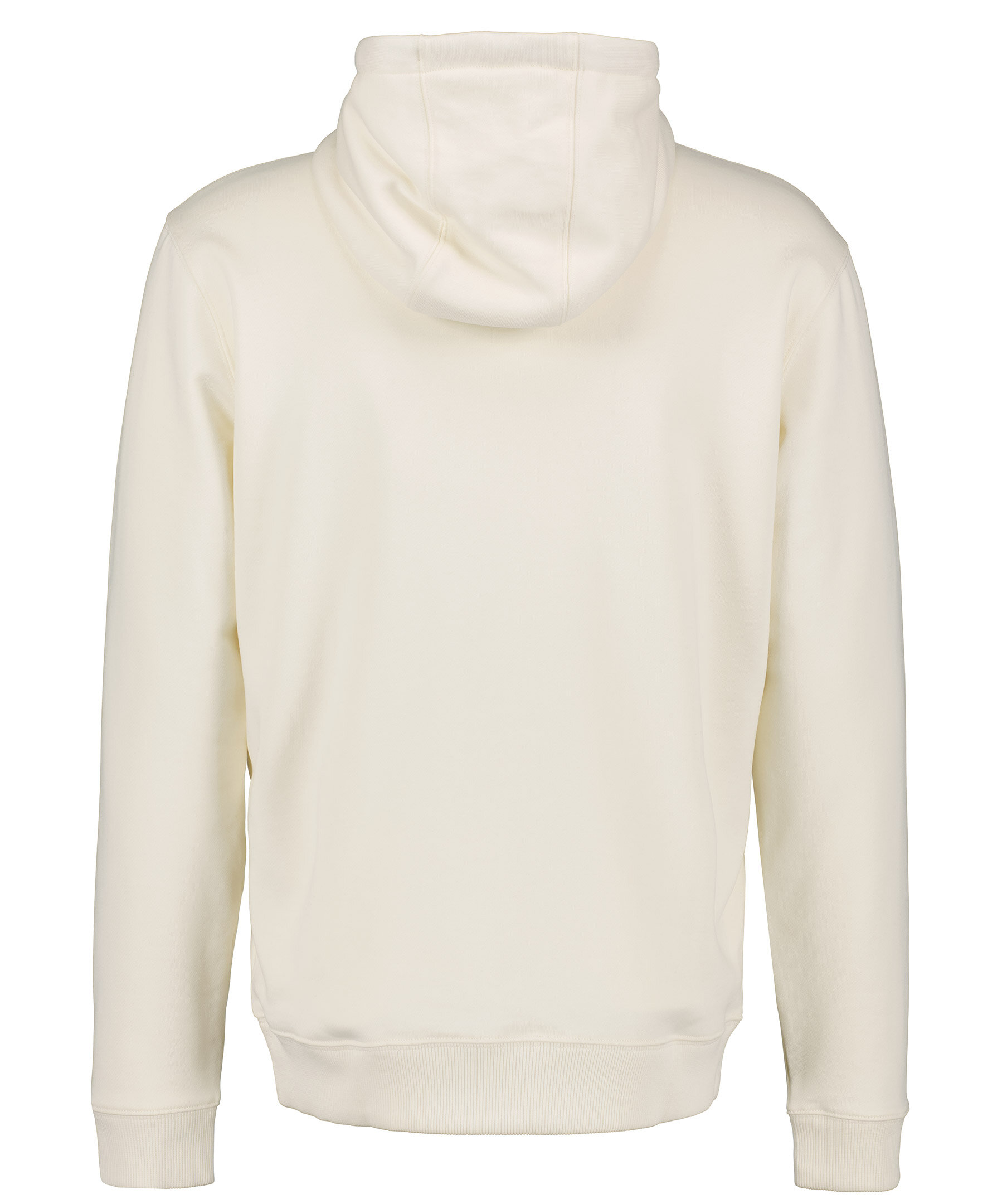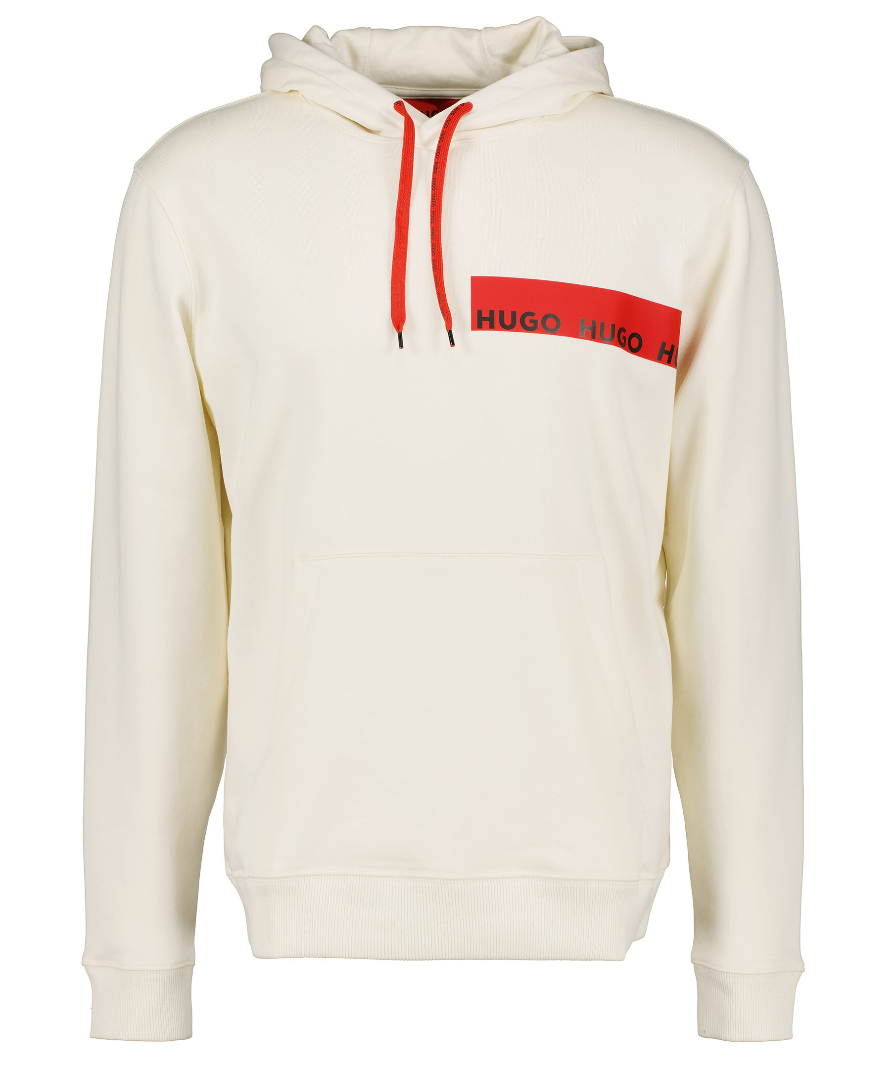 krämvit hoodie från HUGO men, i en avslappnad passform. Tröjan är gjord i 100% bomull. Logotyp i rött och svart på bröstet, röd snörning i huvan och en känguruficka.