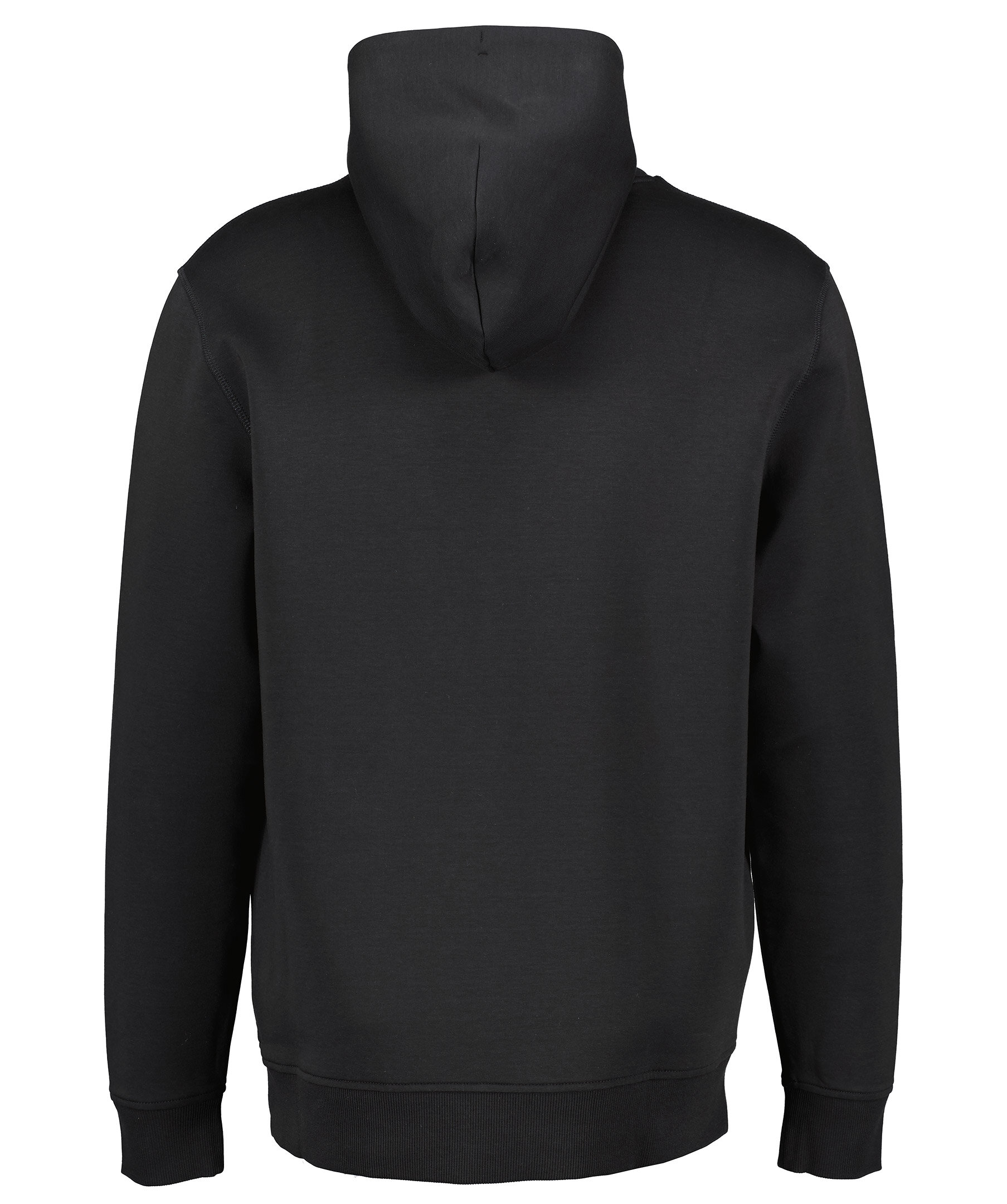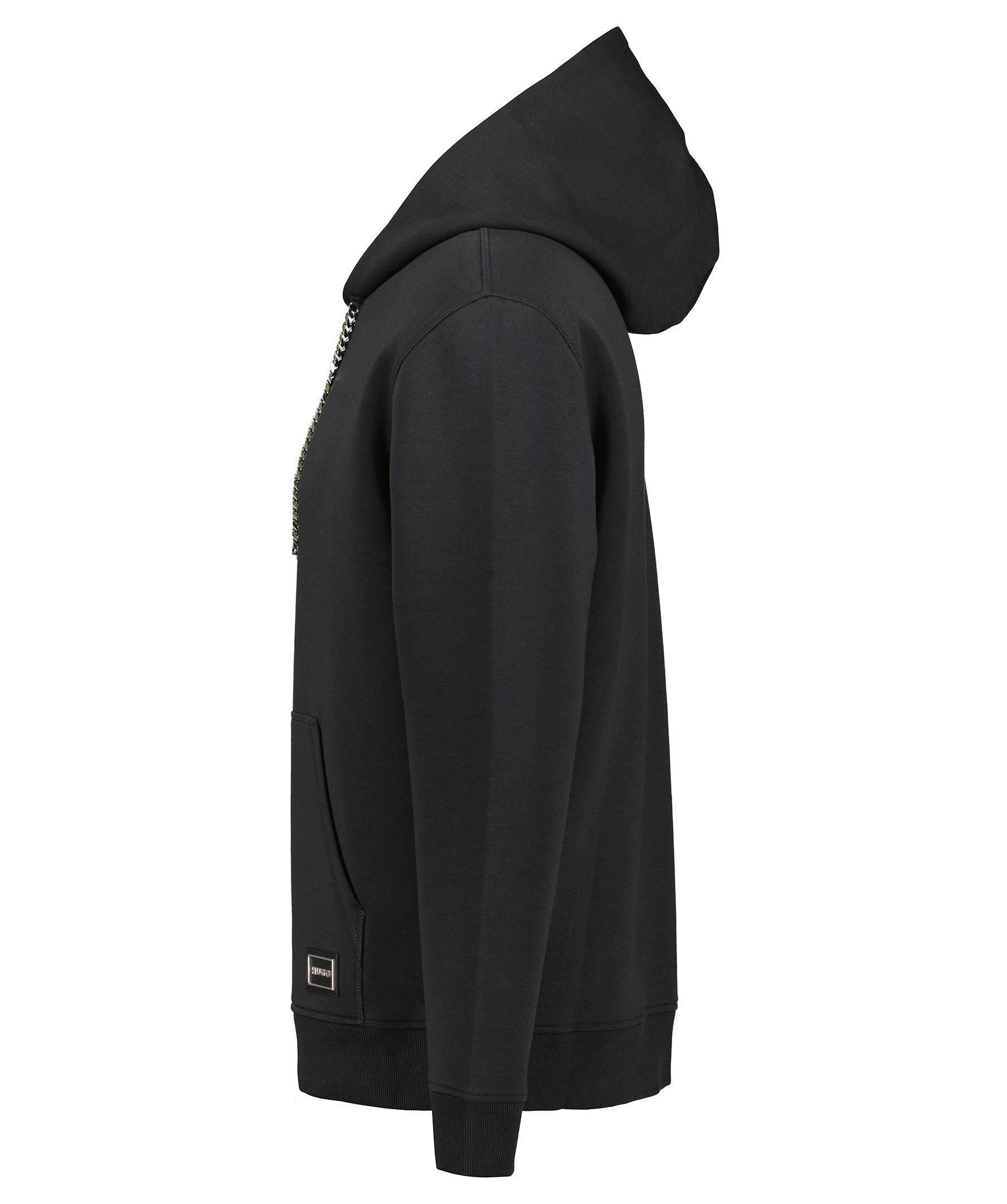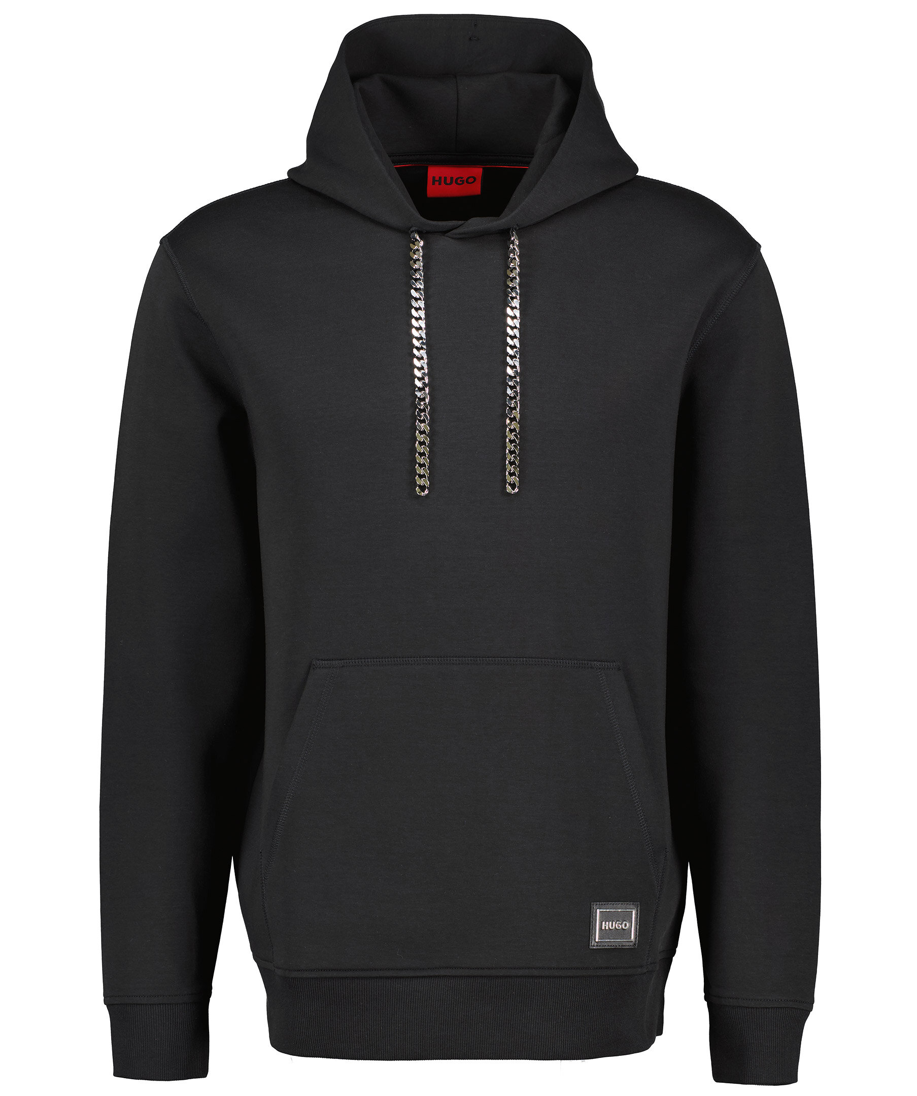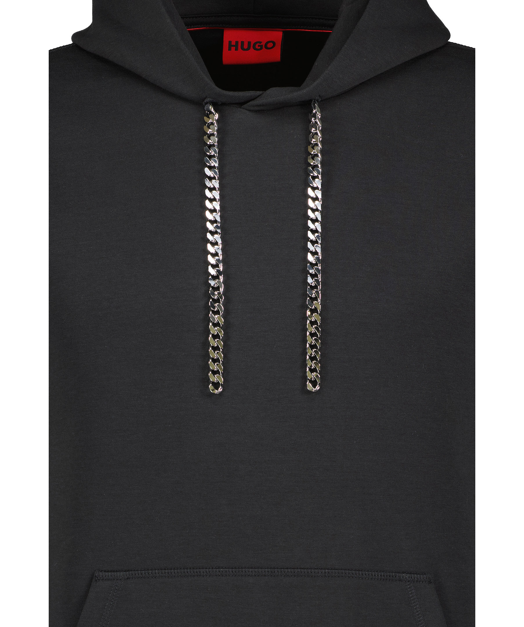 Svart Hoodie från HUGO Men. Dekorativa kedjor vid luvan. Känguruficka på magen. Ribbstickade muddar vid ärm- och plaggslut. Patch med logotyp i läder och metall vid plaggslut. Tillverkad i bomullsblandning.