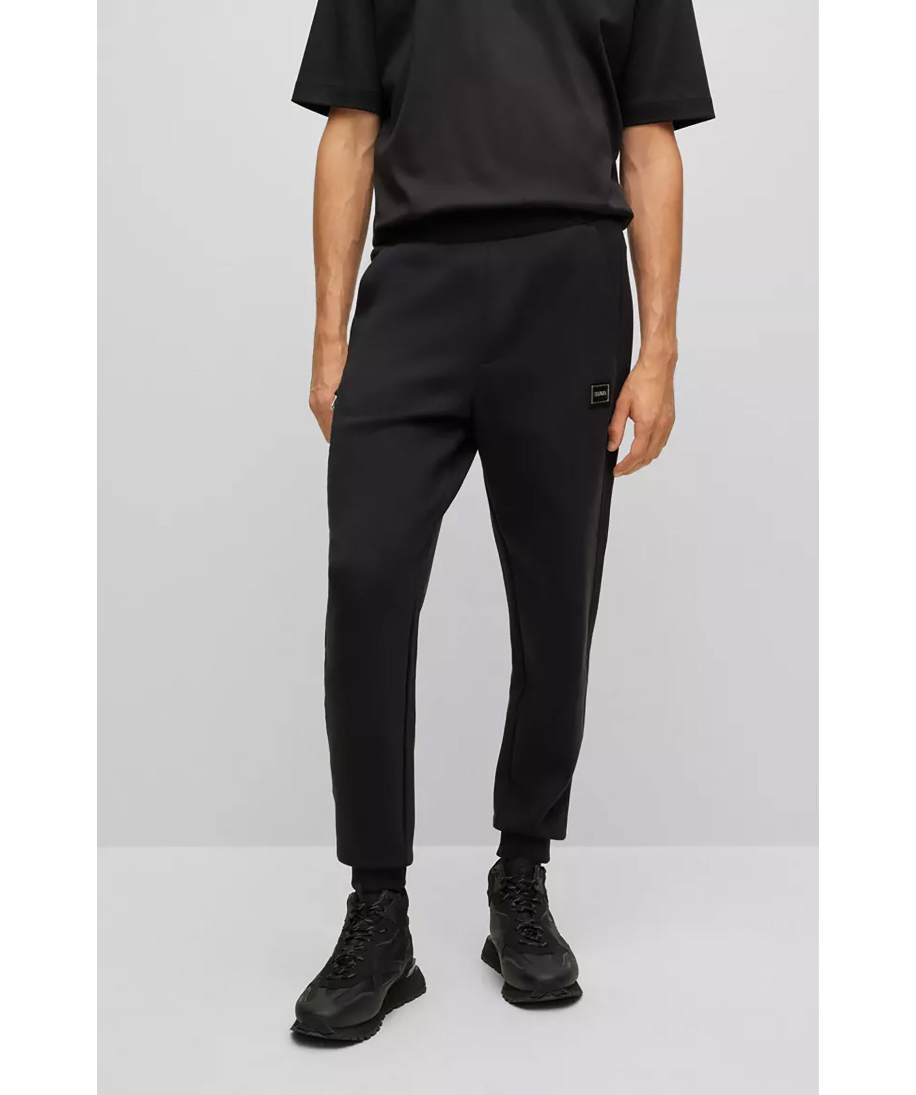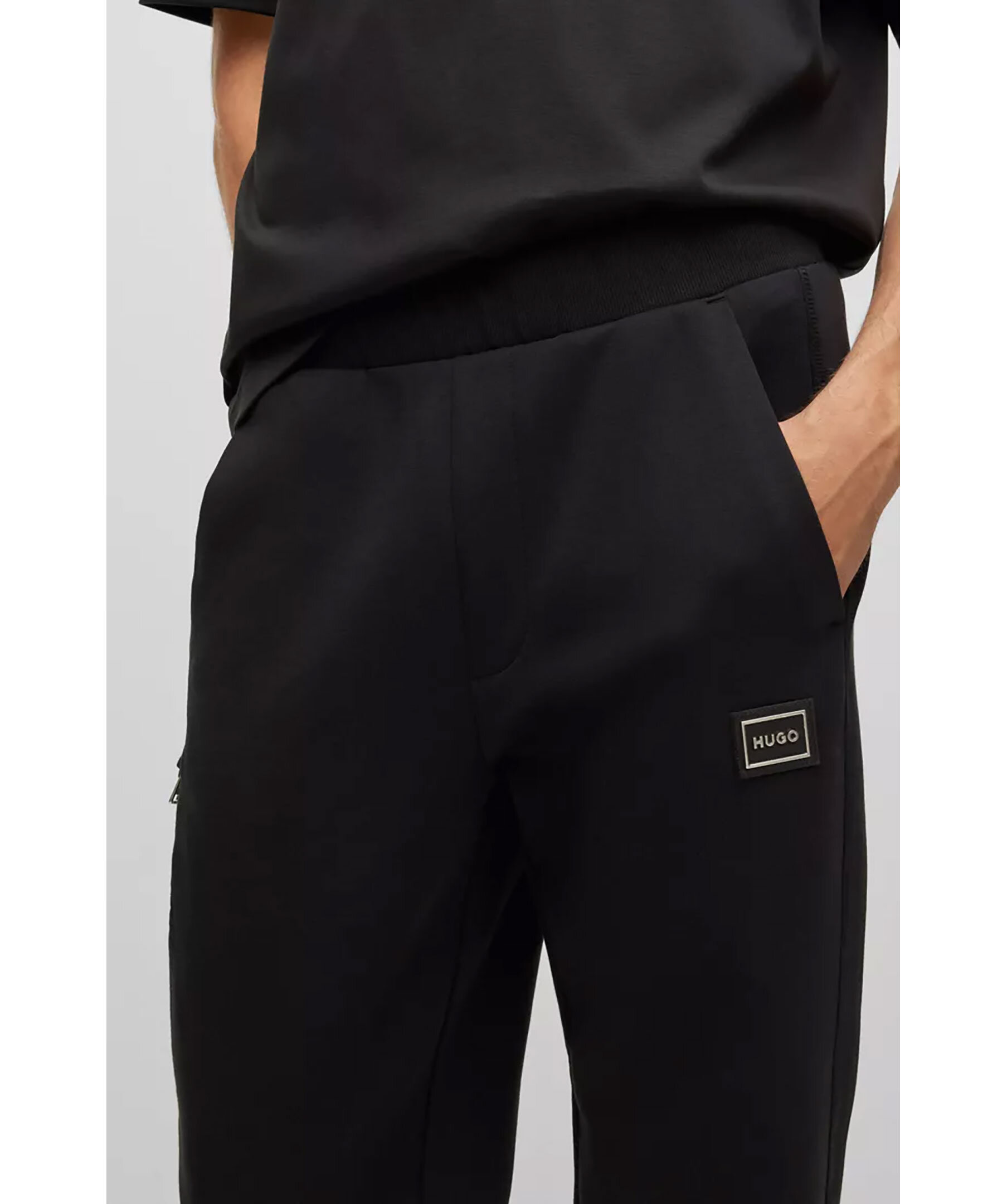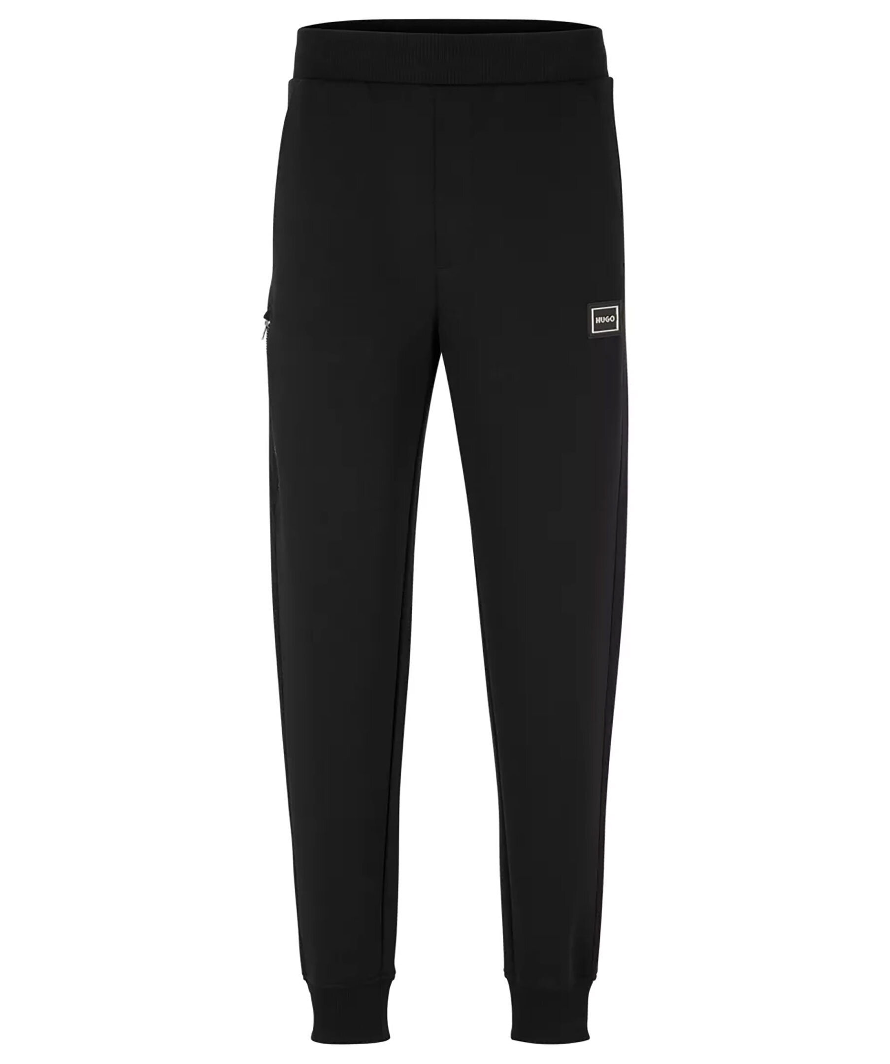 Svarta mjukisbyxor i avslappnad passform med muddar från HUGO. Två framfickor och en ficka med dragkedja vid den högra sömmen samt en rak bakficka. Byxorna har en avslappnad passform i ett bomullsrikt material med stretch för ökad komfort. Det vänstra benet är försett med en inramad HUGO-logga med silvereffekt. Mudd i midjan och muddar i benslut.