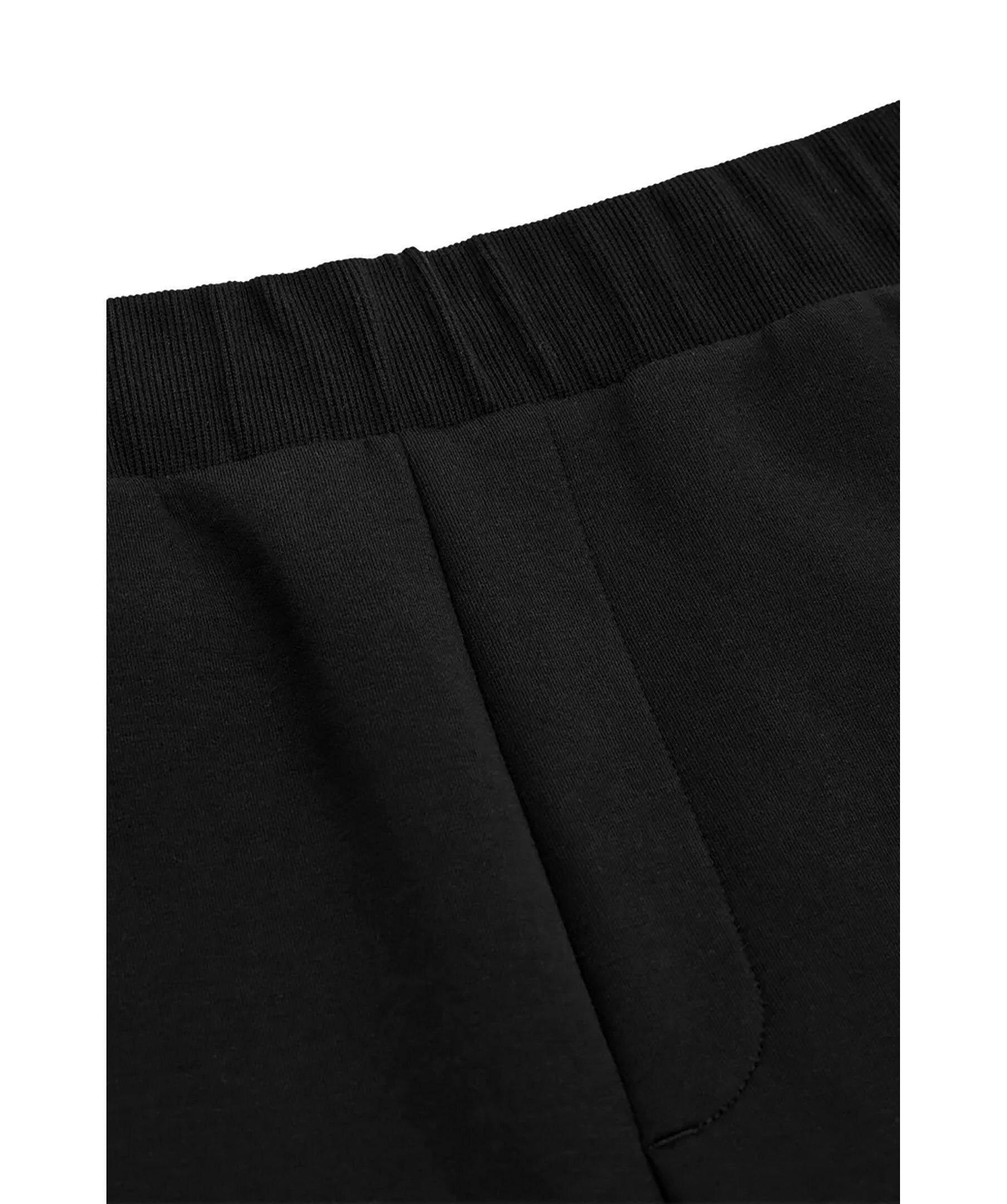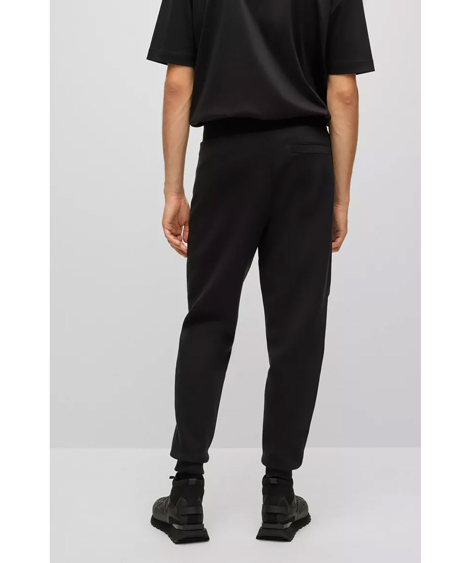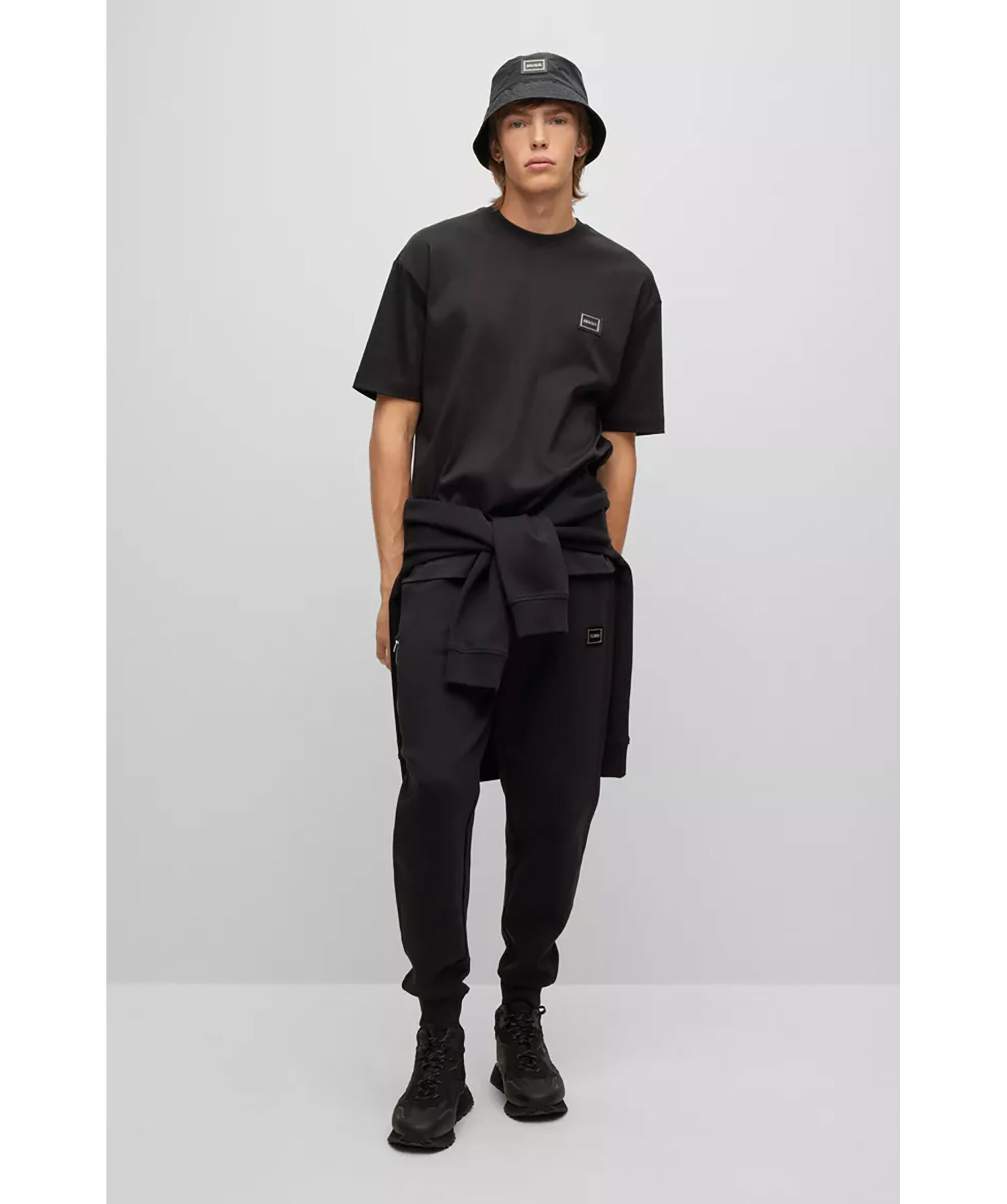 Svarta mjukisbyxor i avslappnad passform med muddar från HUGO. Två framfickor och en ficka med dragkedja vid den högra sömmen samt en rak bakficka. Byxorna har en avslappnad passform i ett bomullsrikt material med stretch för ökad komfort. Det vänstra benet är försett med en inramad HUGO-logga med silvereffekt. Mudd i midjan och muddar i benslut.
