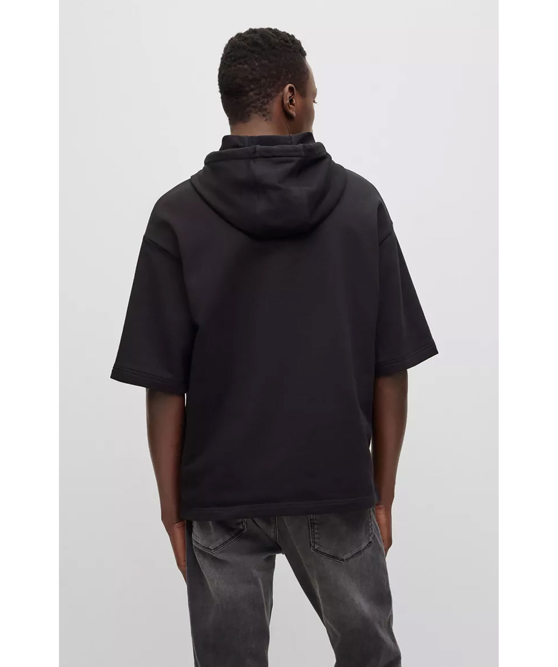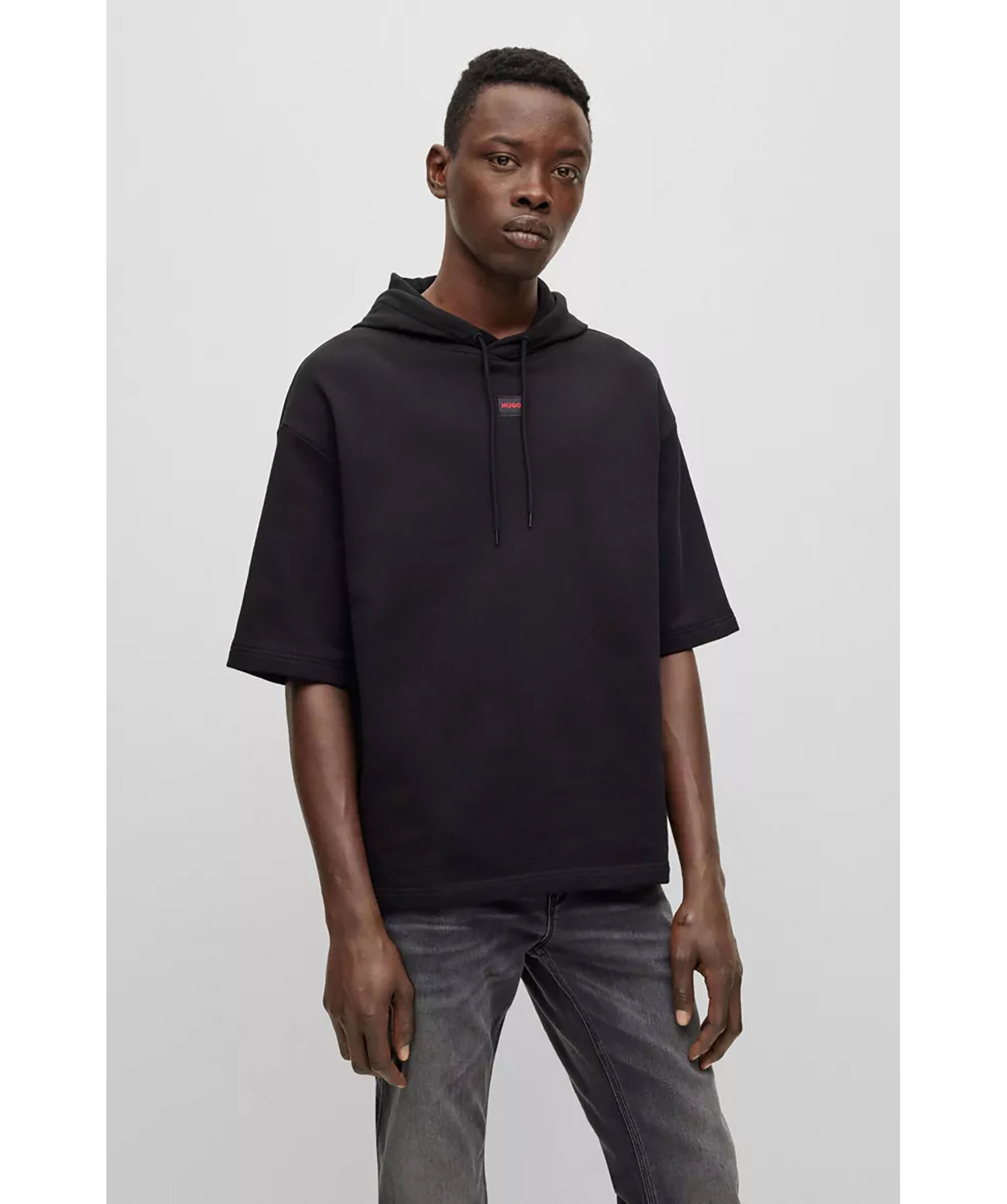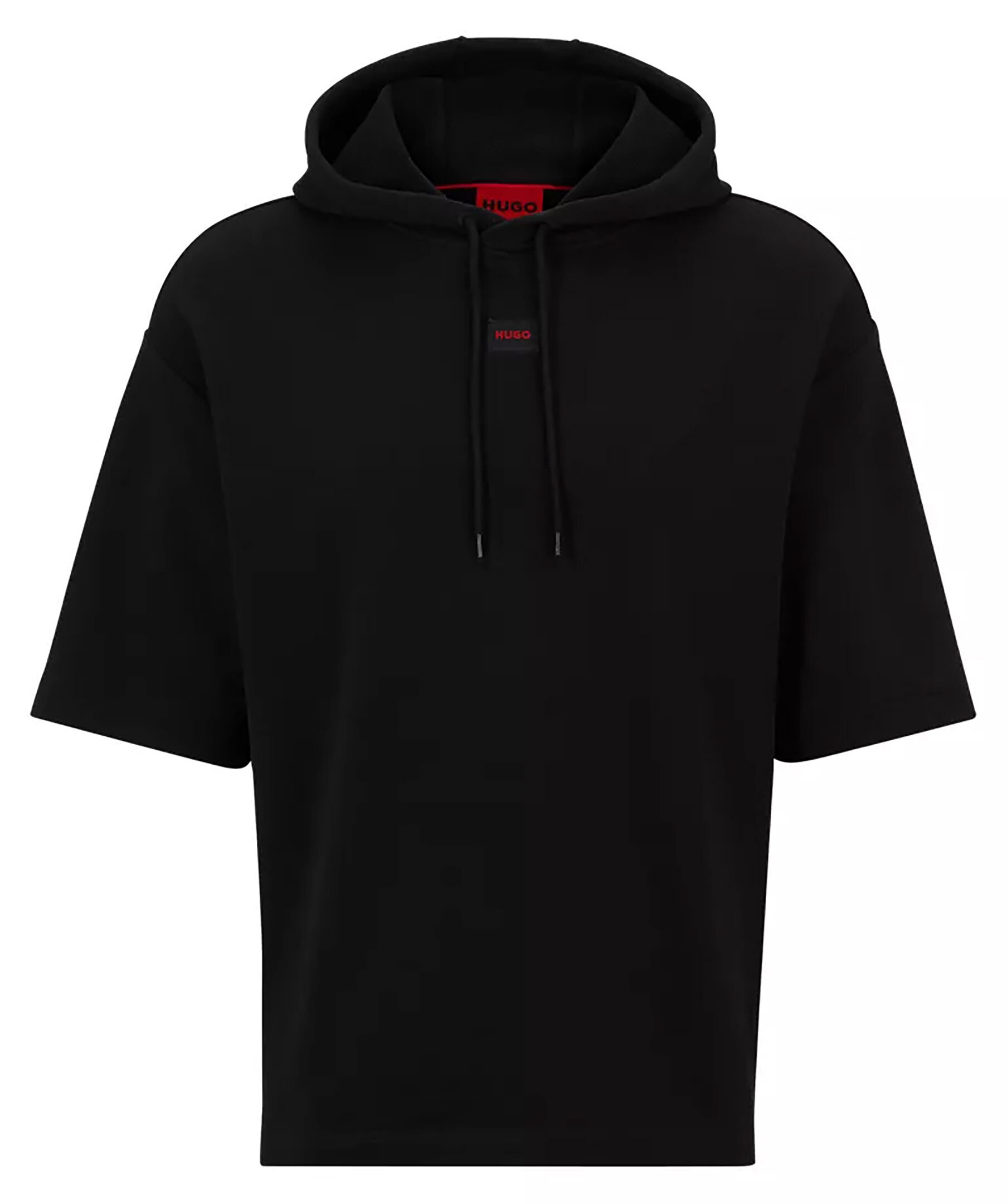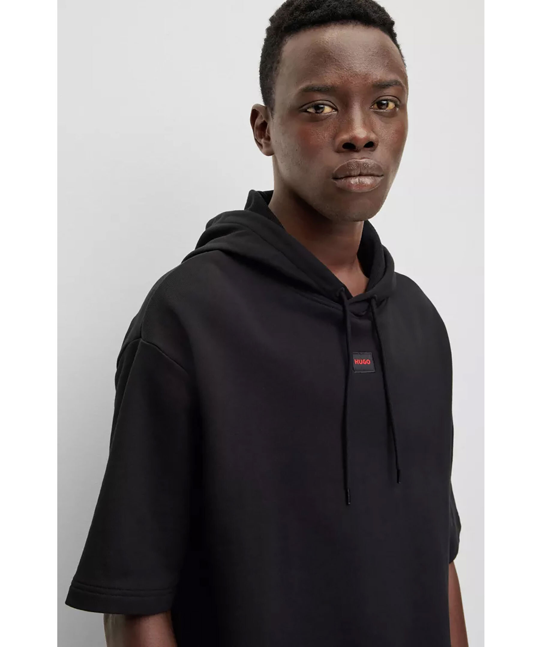 Svart kortärmad hoodie från HUGO. Tröjan har en avslappnad passform och ärmarna slutar vid armbågen. Snörning i luva och logotyp på bröstet. Modellen är 185 cm lång och har på sig storlek M.