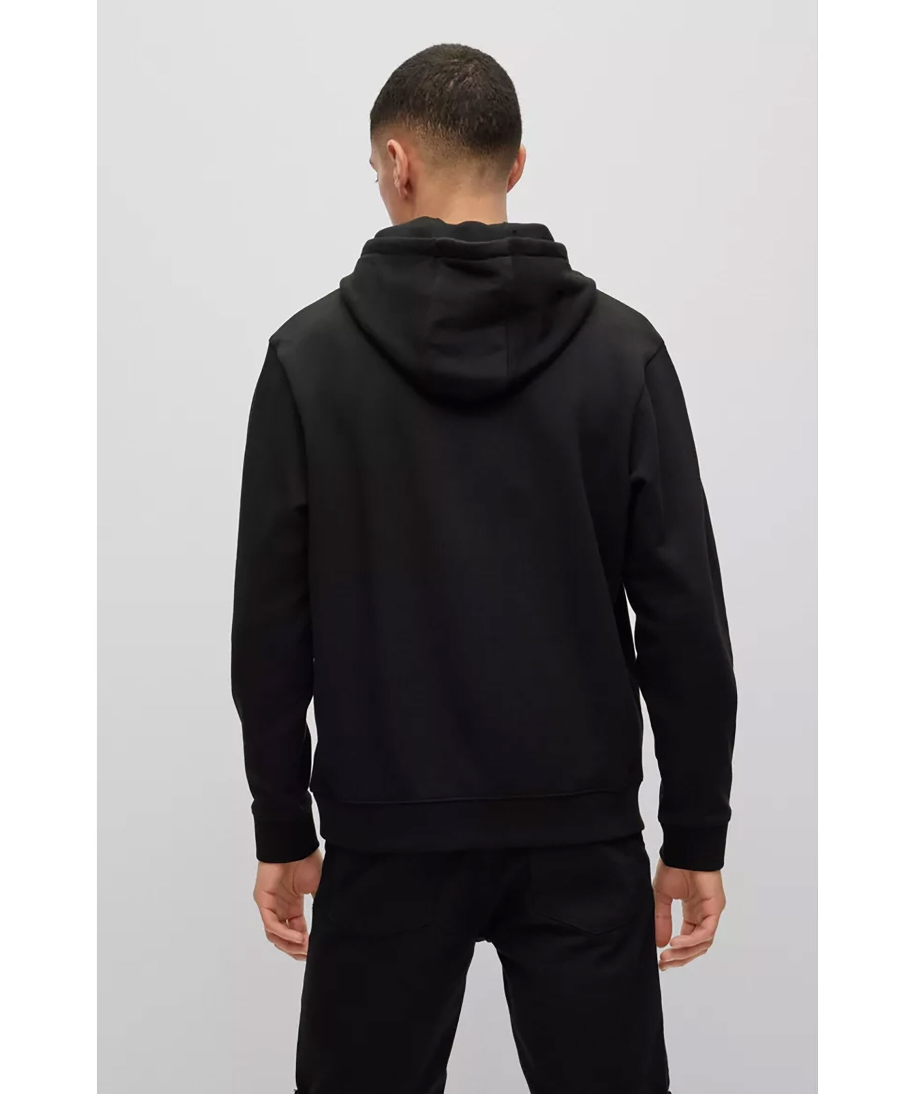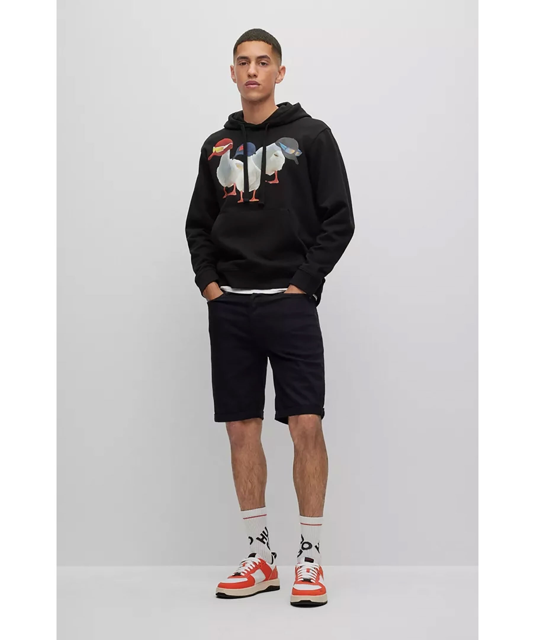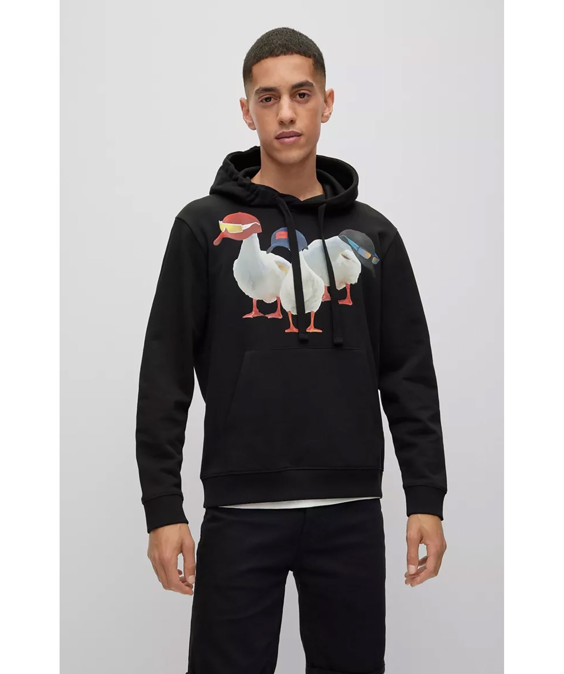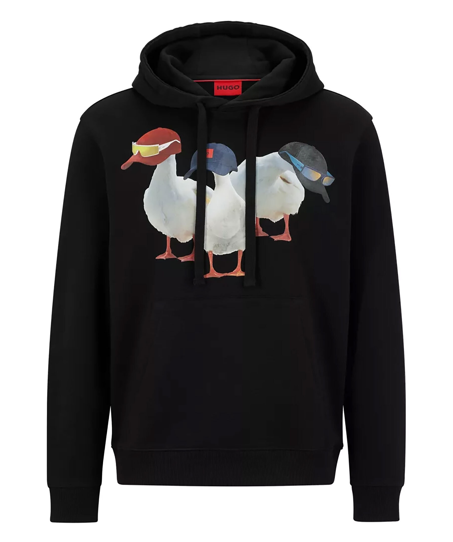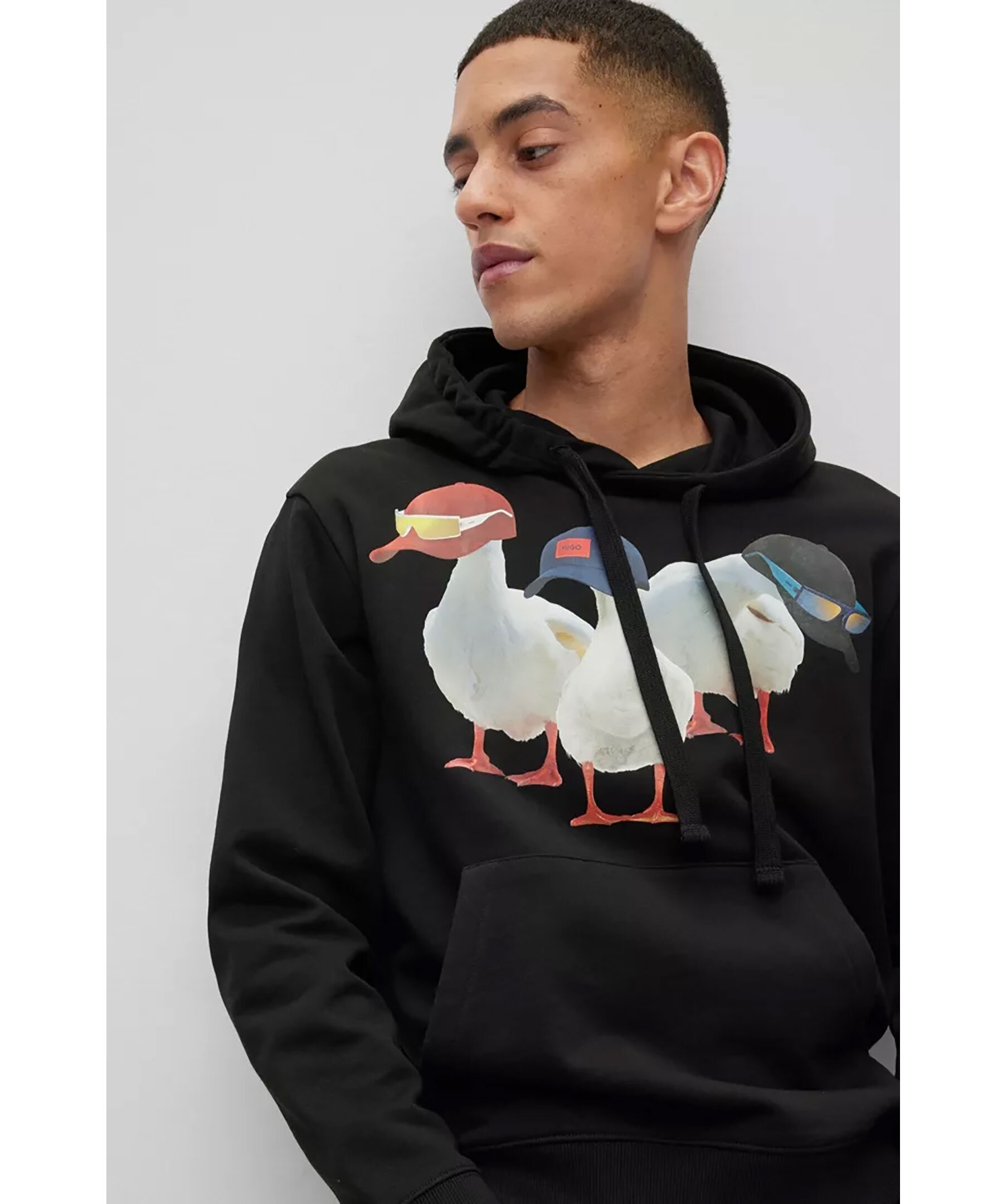 Svart avslappnad hoodie från HUGO. Tröjan har ett motiv med tre ankor iklädda kepsar och solglasögon. Snörning i luva och känguruficka på magen. Ribbade muddar vid ärm och plaggslut.