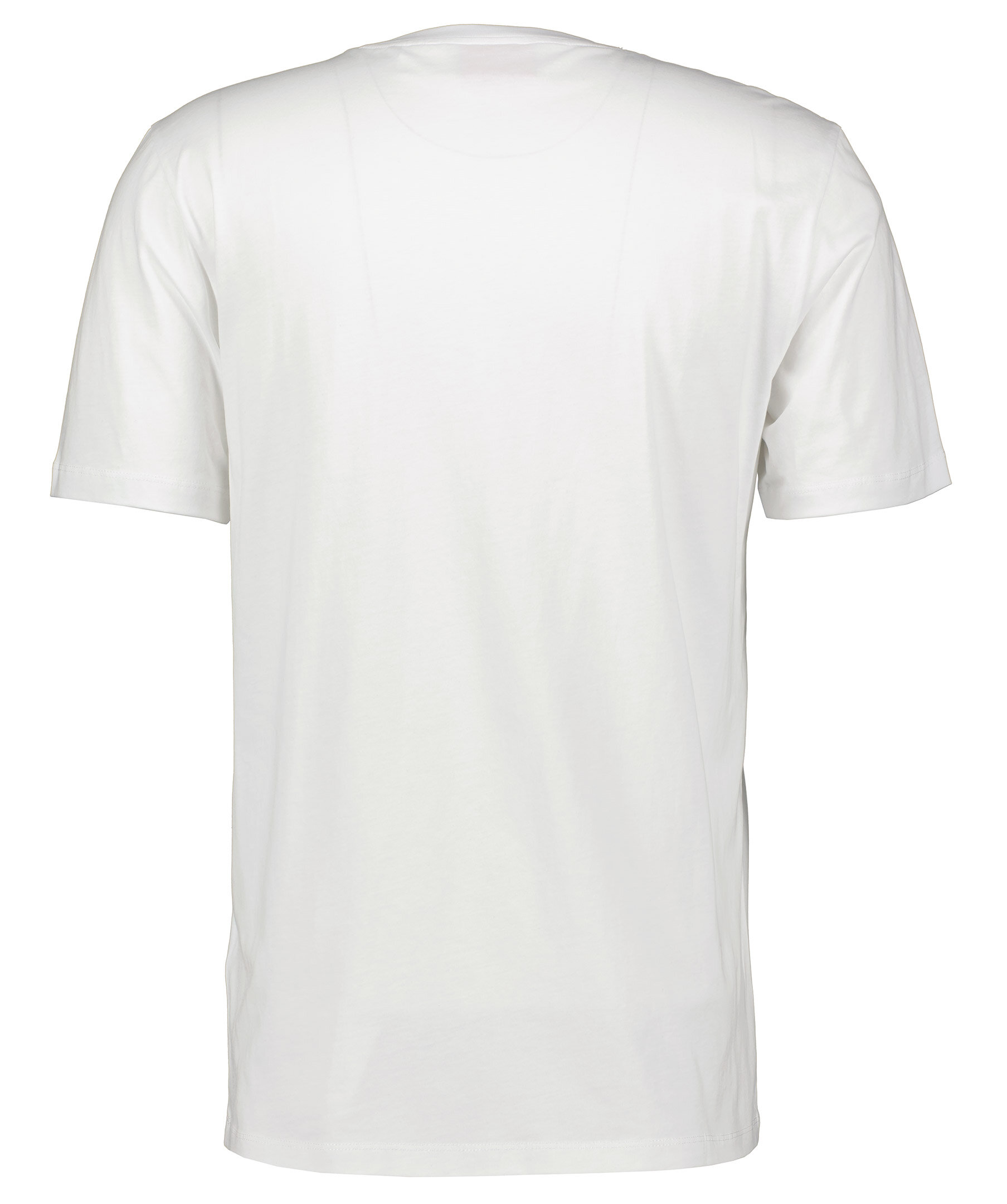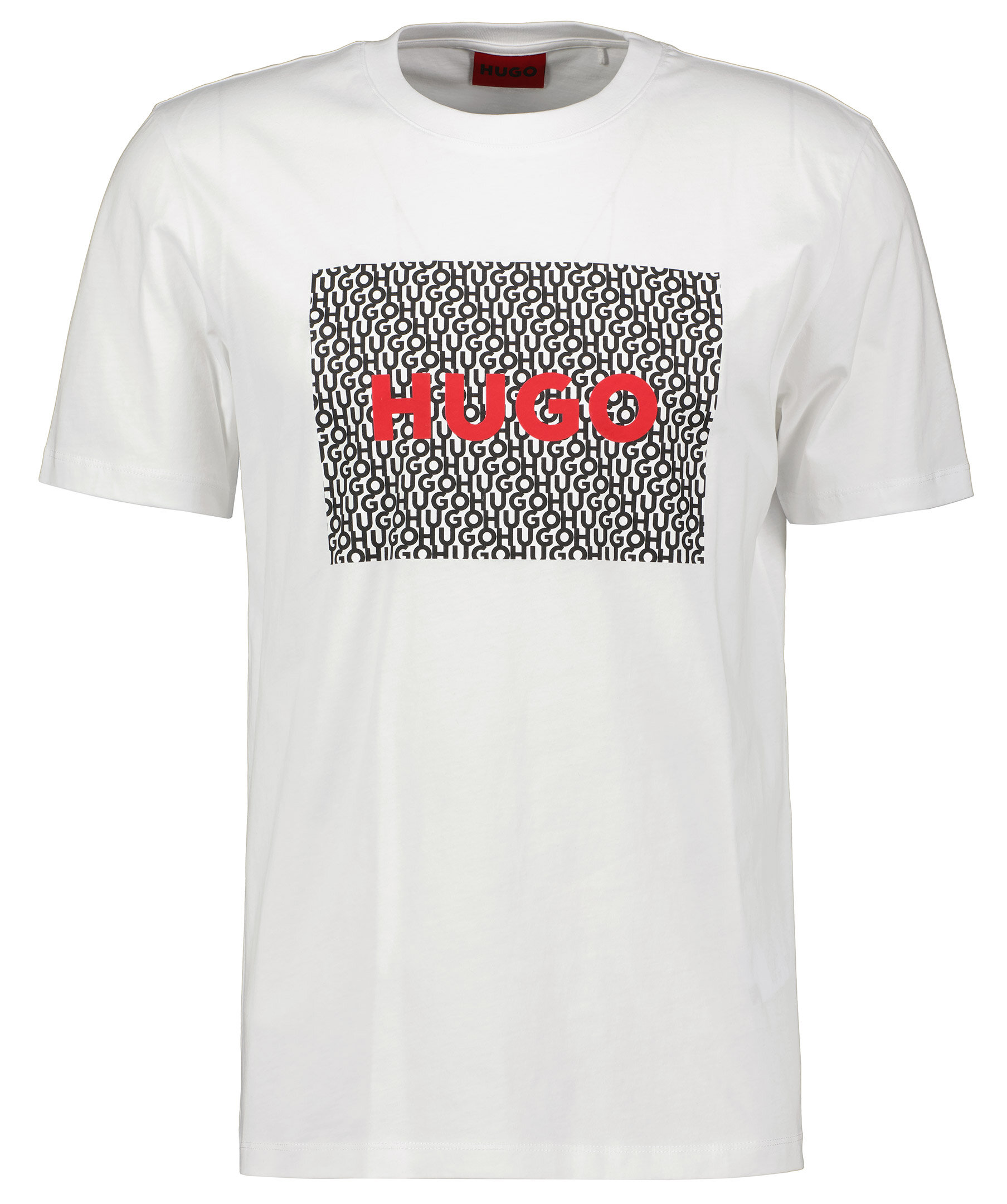 Vit T-shirt från HUGO Men. Stort tryck med logotyp i rött, svart och vitt över bröstet. Tillverkad i 100% Bomull. Rundad halsringning.