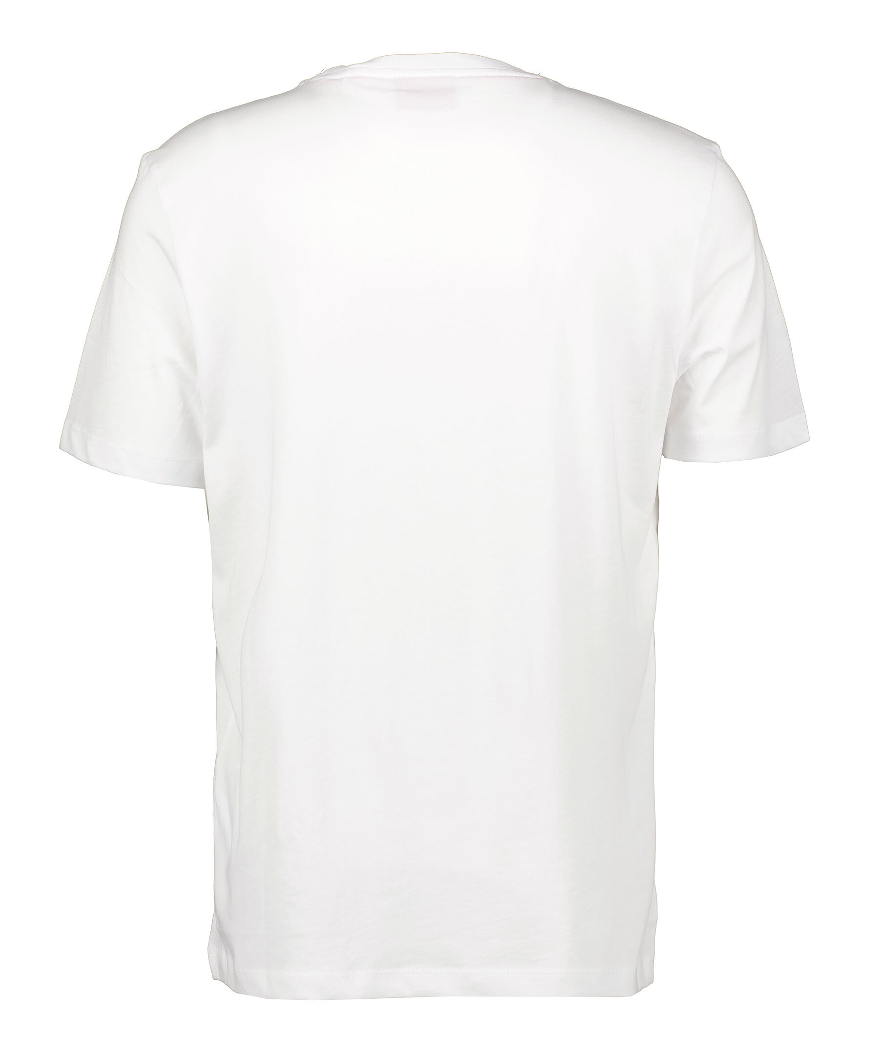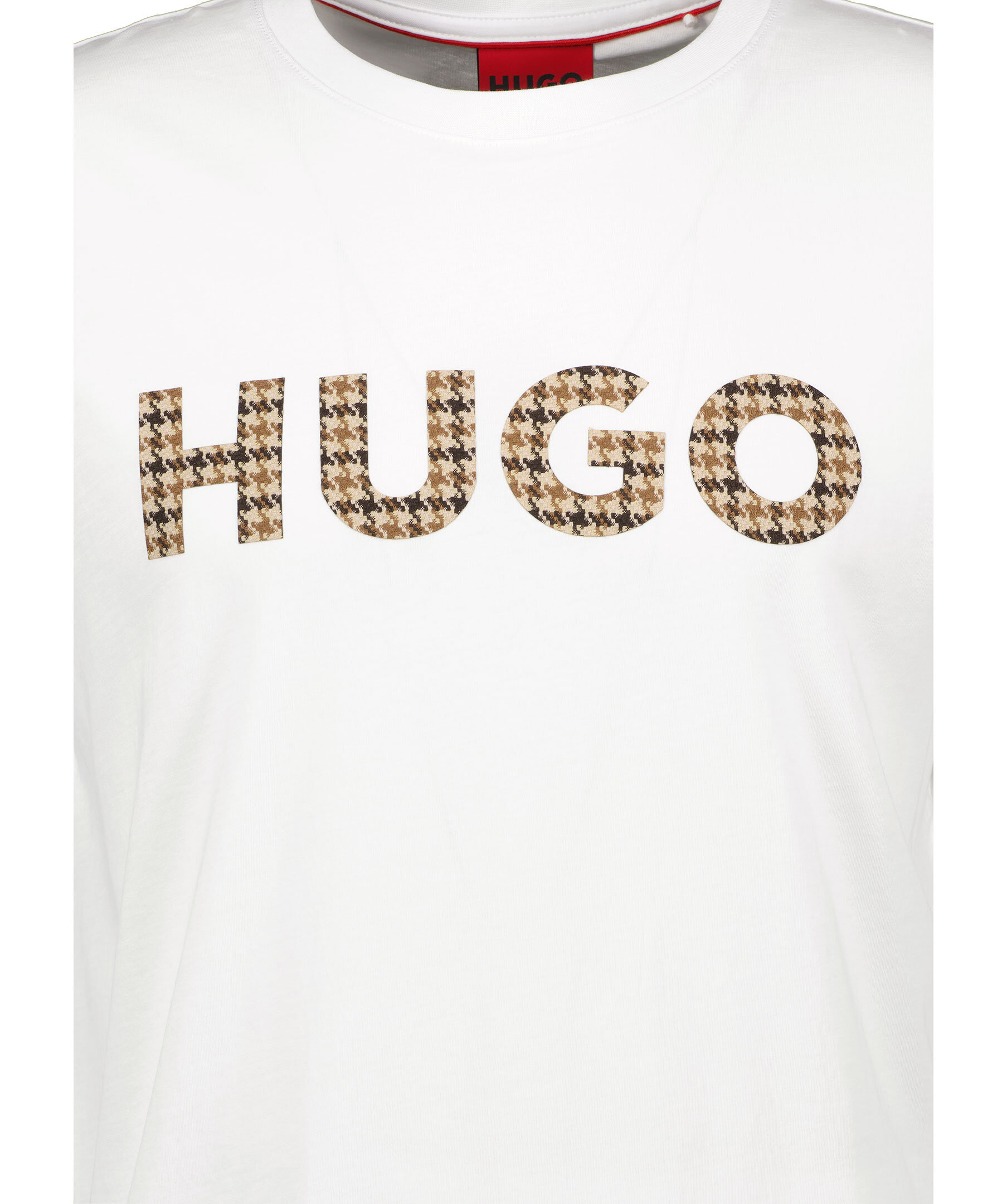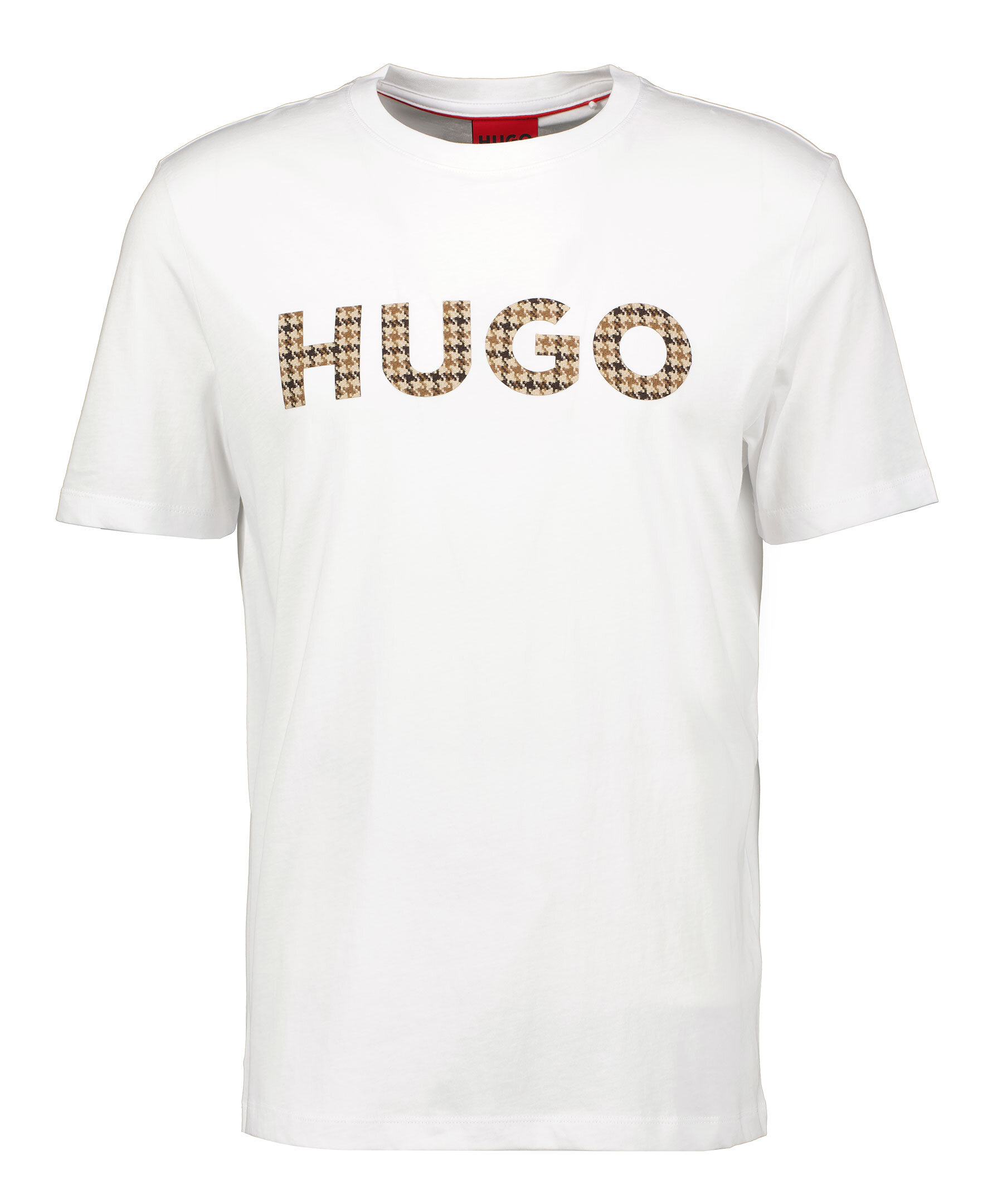 Vit T-shirt från HUGO. Broderad logotyp över bröstet i beige och brunt. Rundad halsringning med ribbstickad kant. Tillverkad i 100% Bomull.