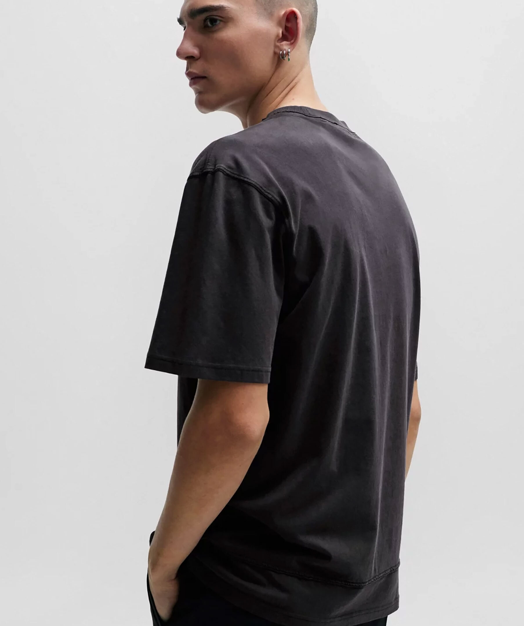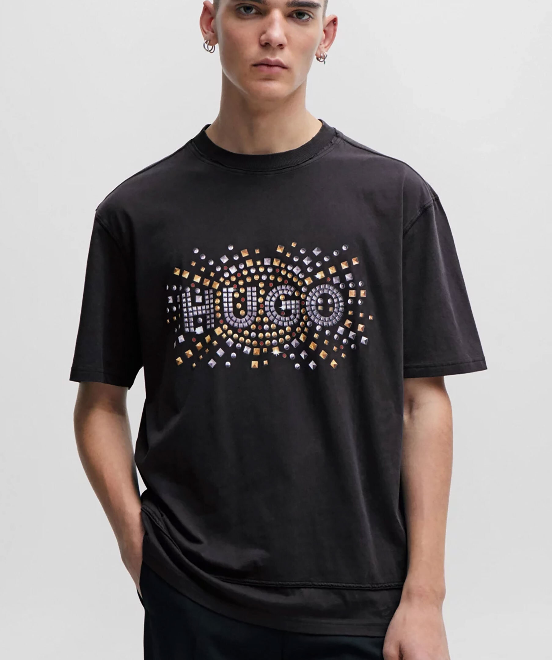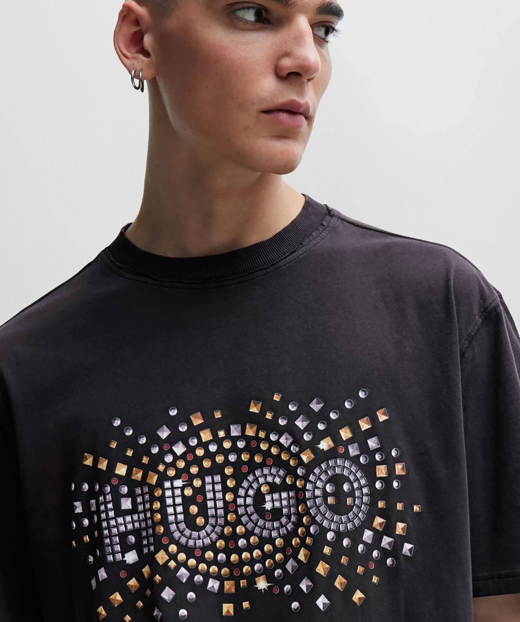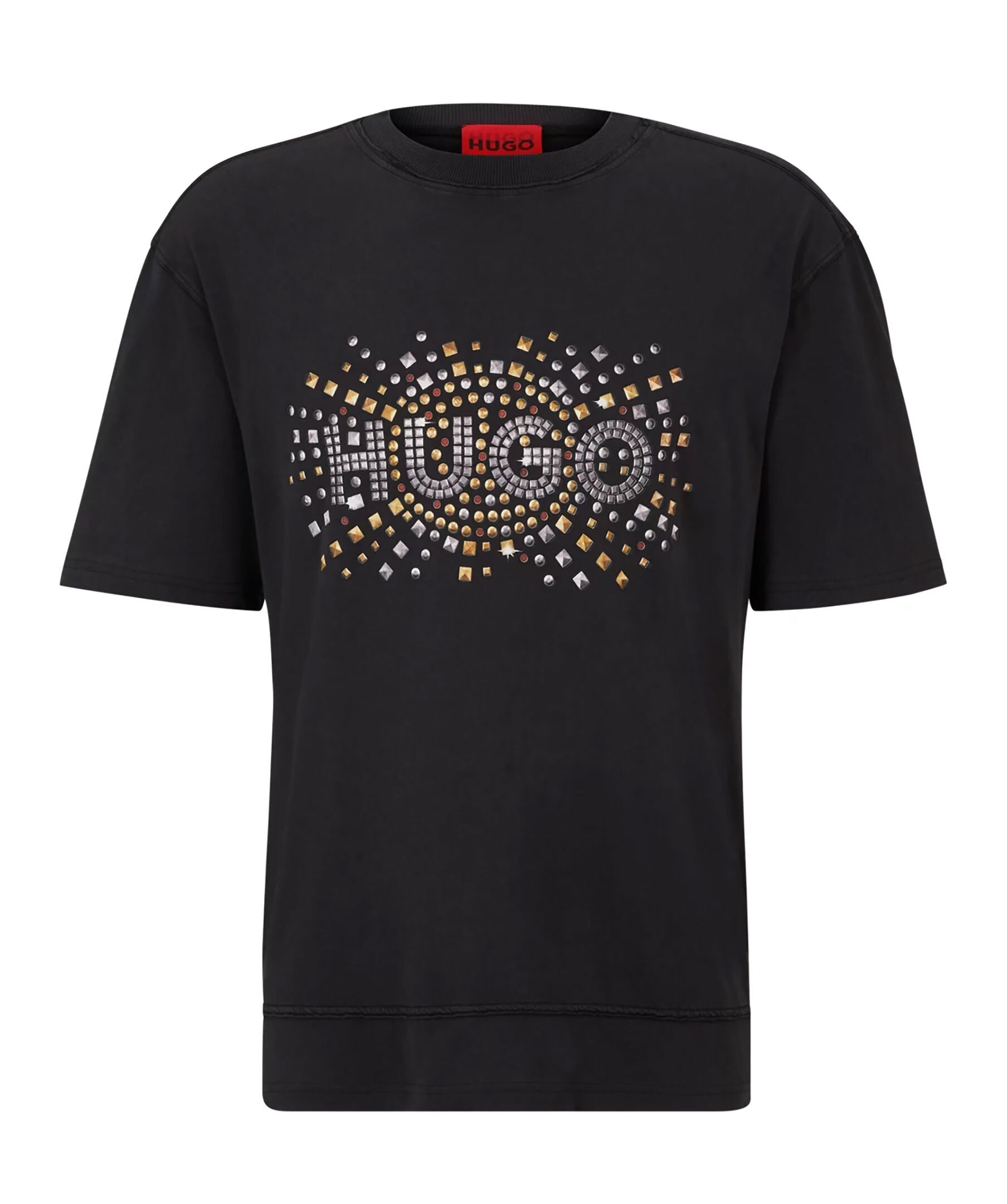 Svart T-shirt från HUGO. Tryckt logotyp över bröstet med nit-motiv. Rundad halsringning. dekorativ söm nedtill. Rundad halsringning med ribbstickad mudd. Tillverkad i 100% Bomull.