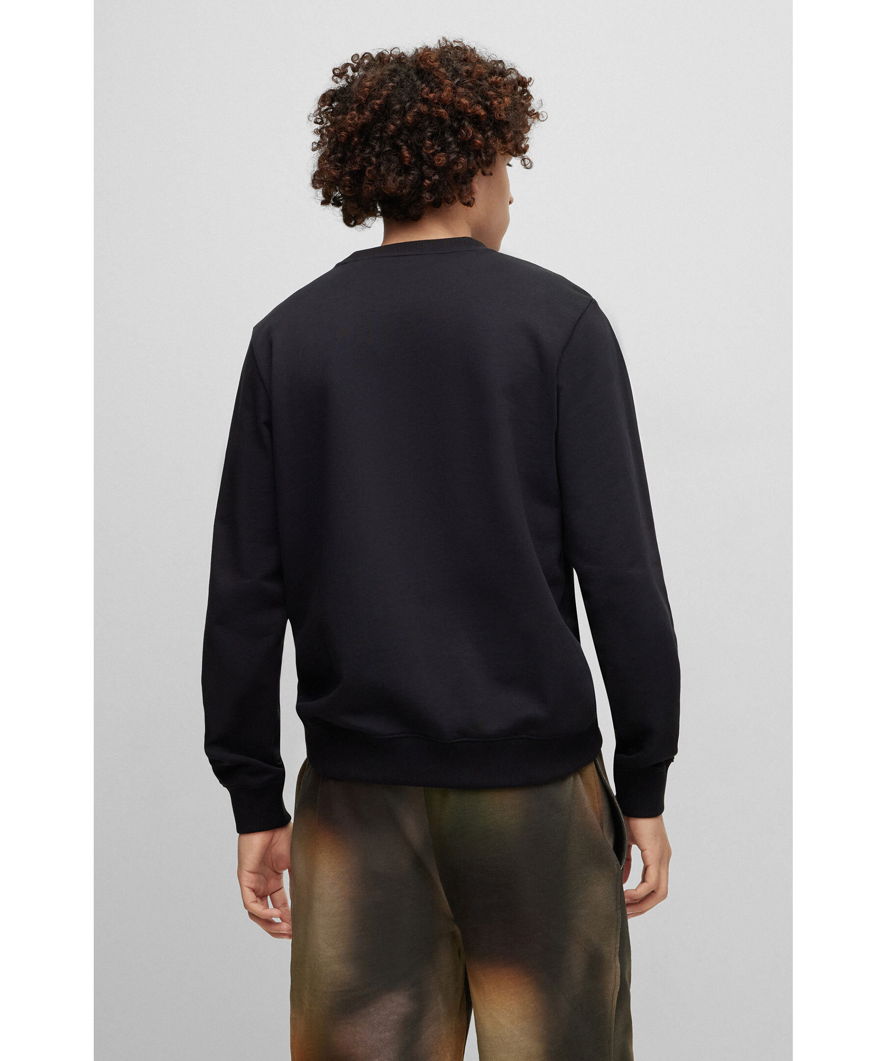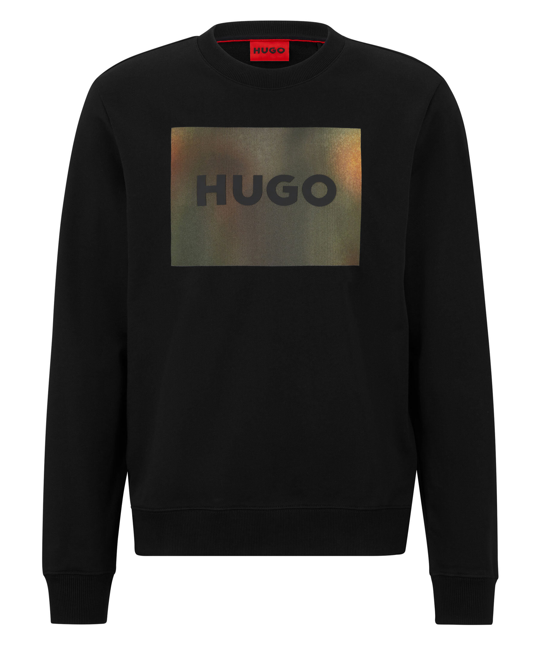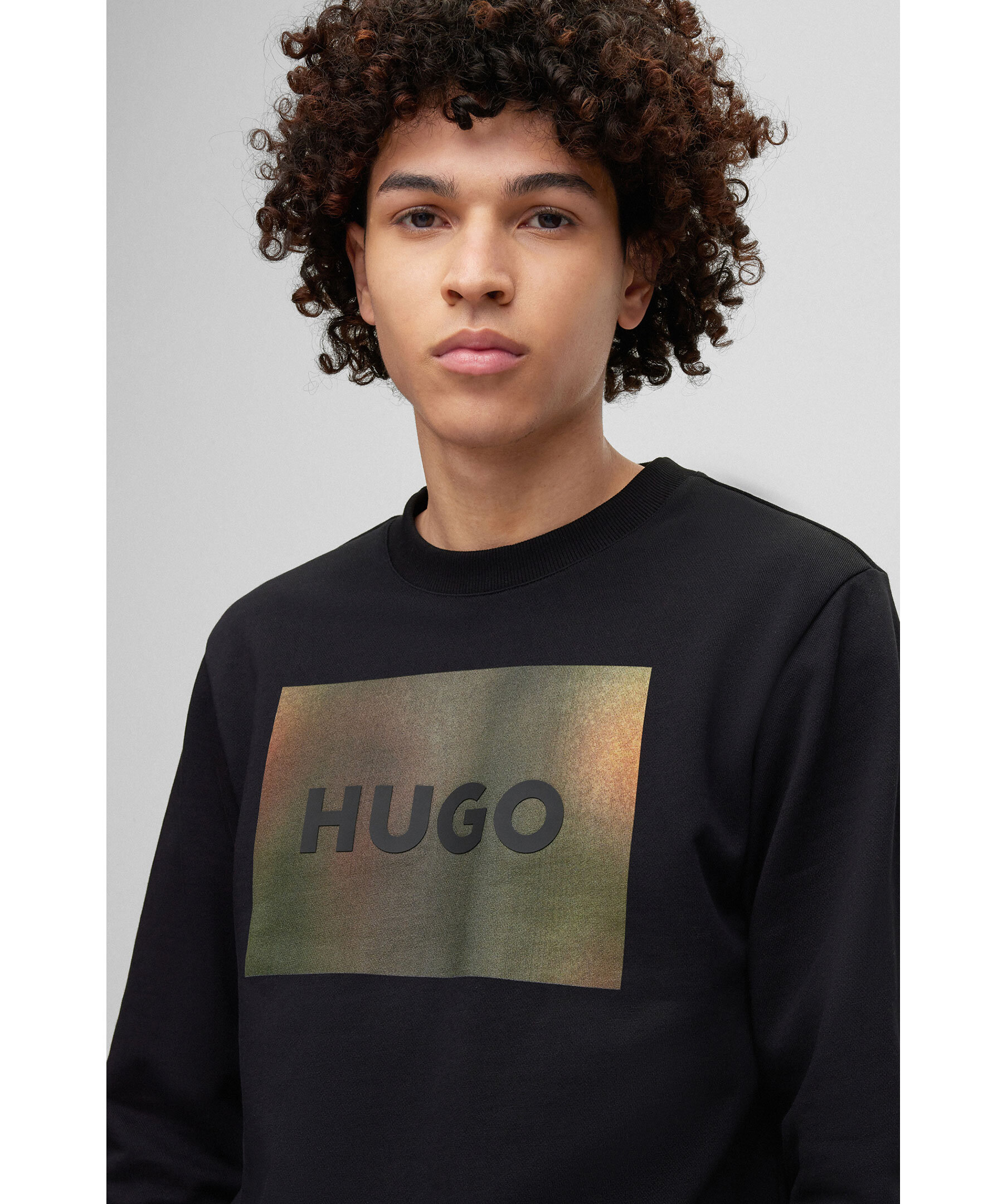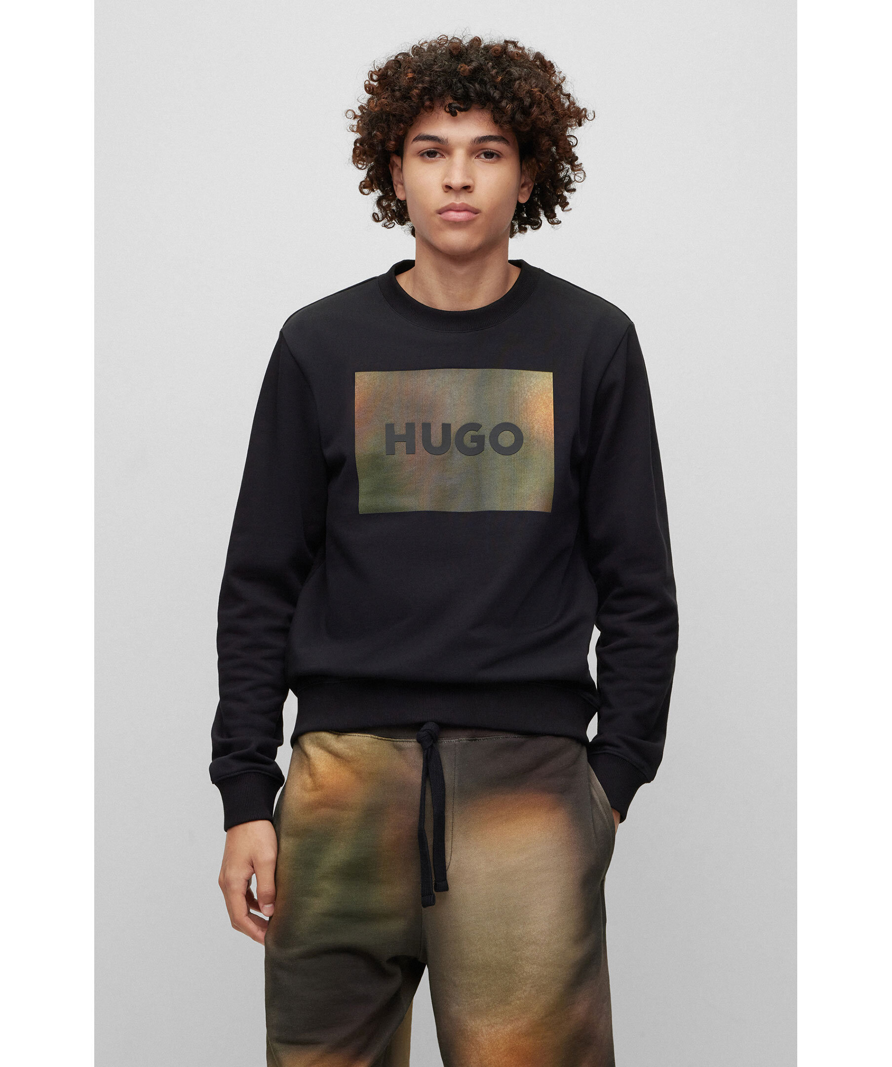 Svart sweatshirt från HUGO. Tillverkad i 100% bomull, har en grön, multifärgad ruta med svart logotyp mitt på bröstet. Rundad halsringning, ribbade muddar i ärmslut, i halsringning och i plaggslut.