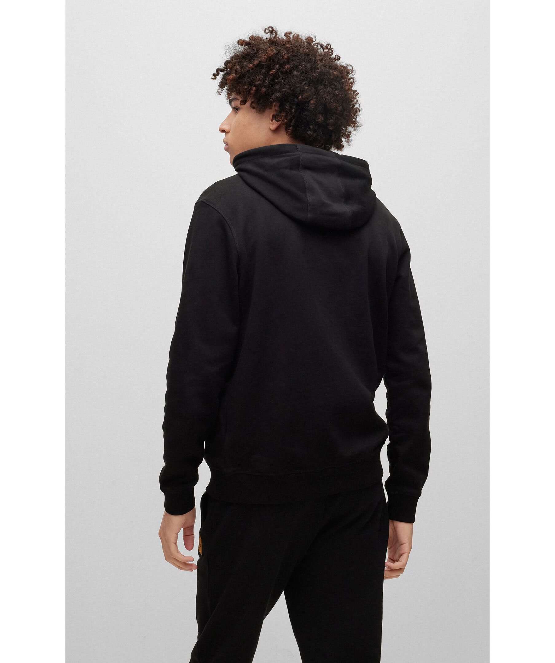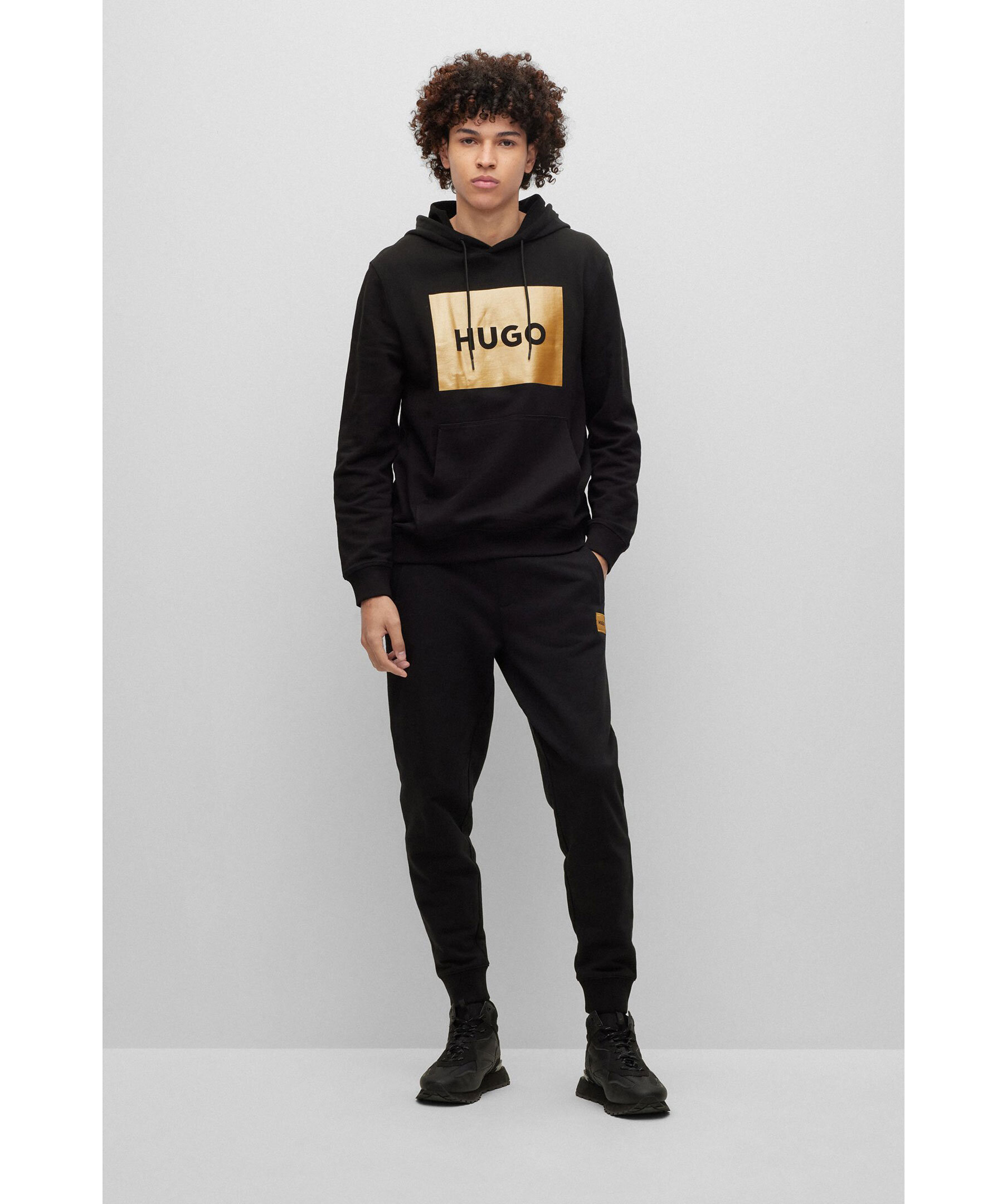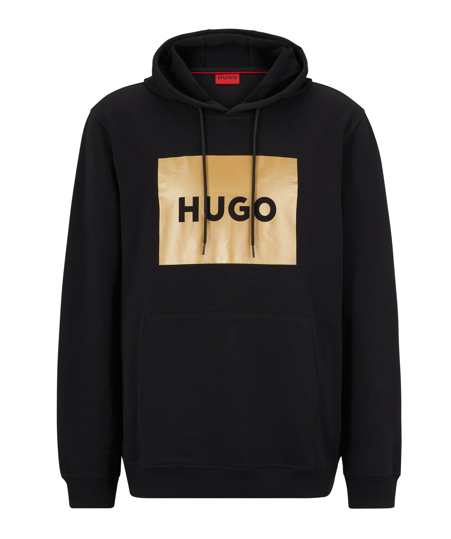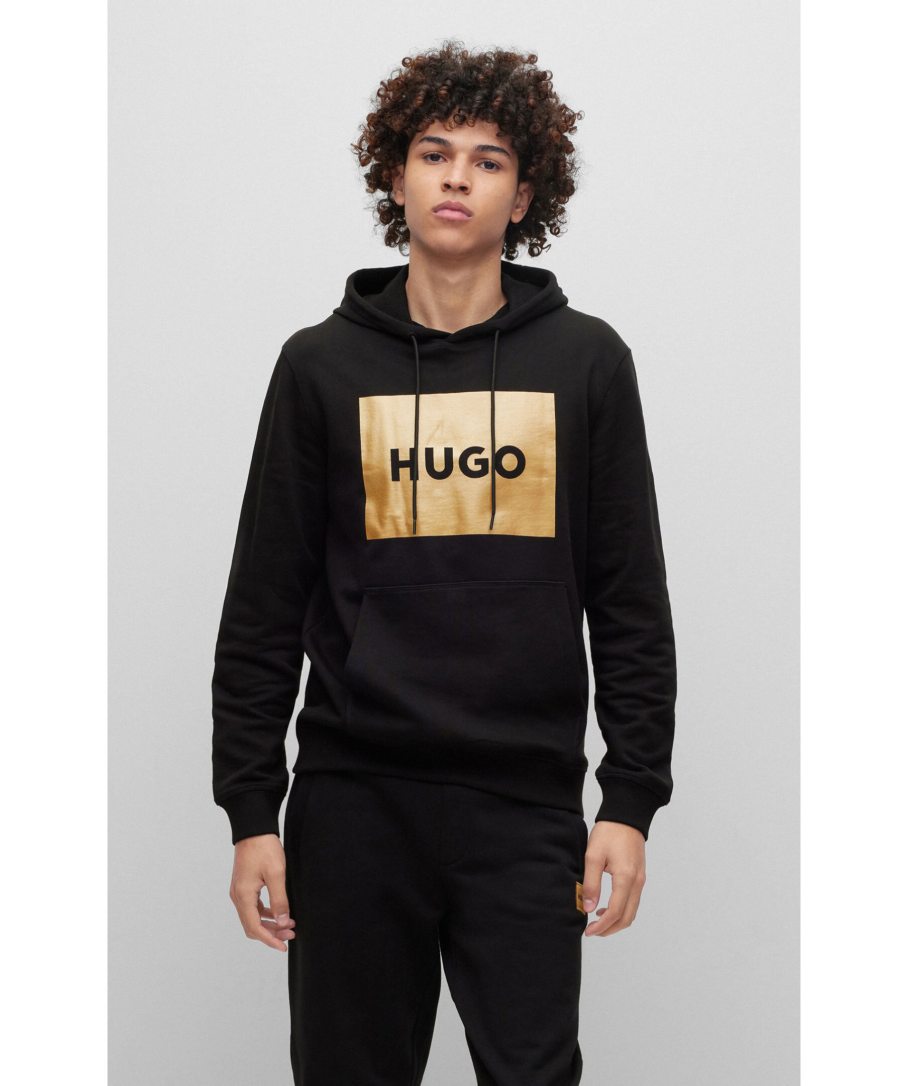 Svart hoodie från HUGO. Tillverkad i 100% bomull och har en normal passform. Guldfärgad ruta med logga tryckt på bröstet. Känguruficka på magen och ribbade muddar i ärmslut och plaggslut. Snörning i luvan och liten krage.