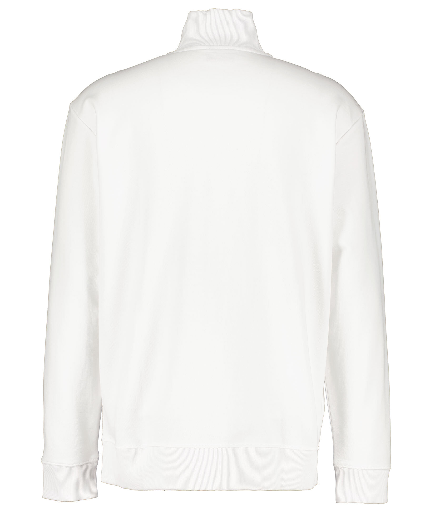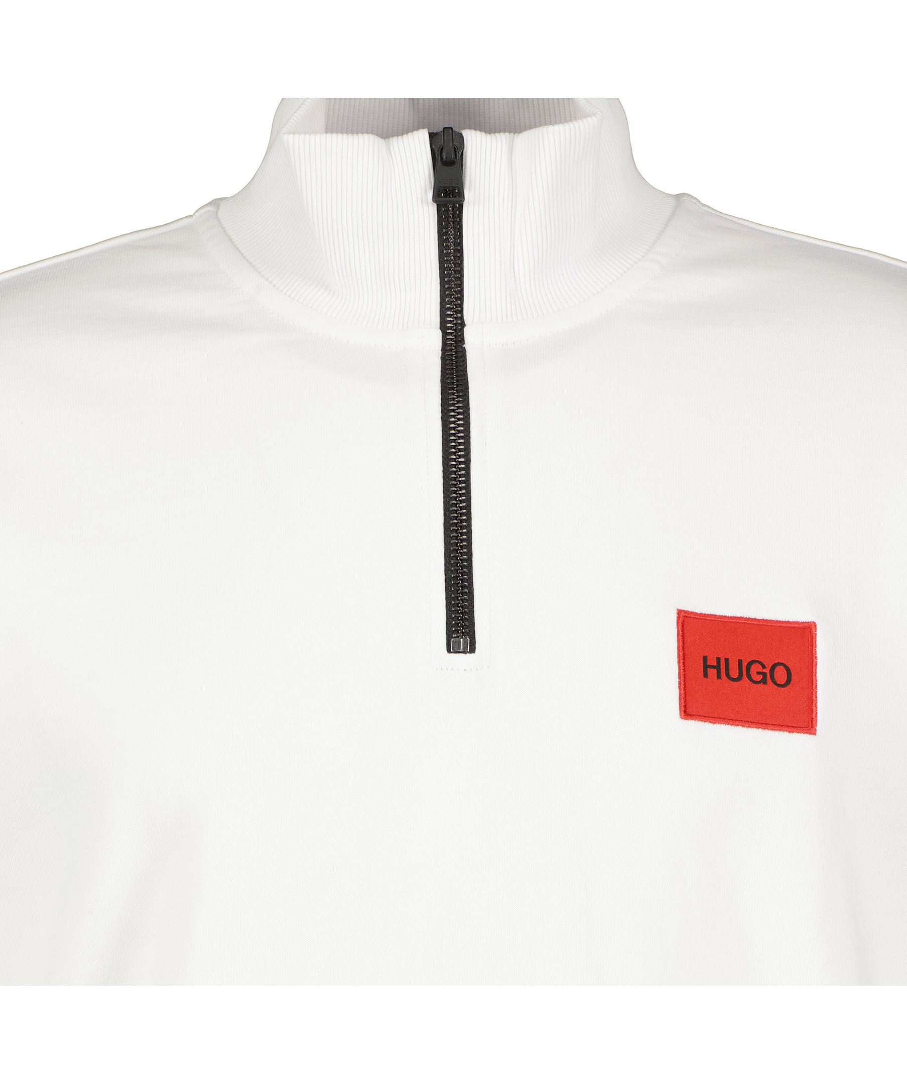 Vit half-zip sweatshirt från HUGO med hög krage. Tillverkad i bomullsbladning. Ribbstickade muddar i kragen, ärm- och plaggslut. Röd patch med logotyp ena sidan av på bröstet.
