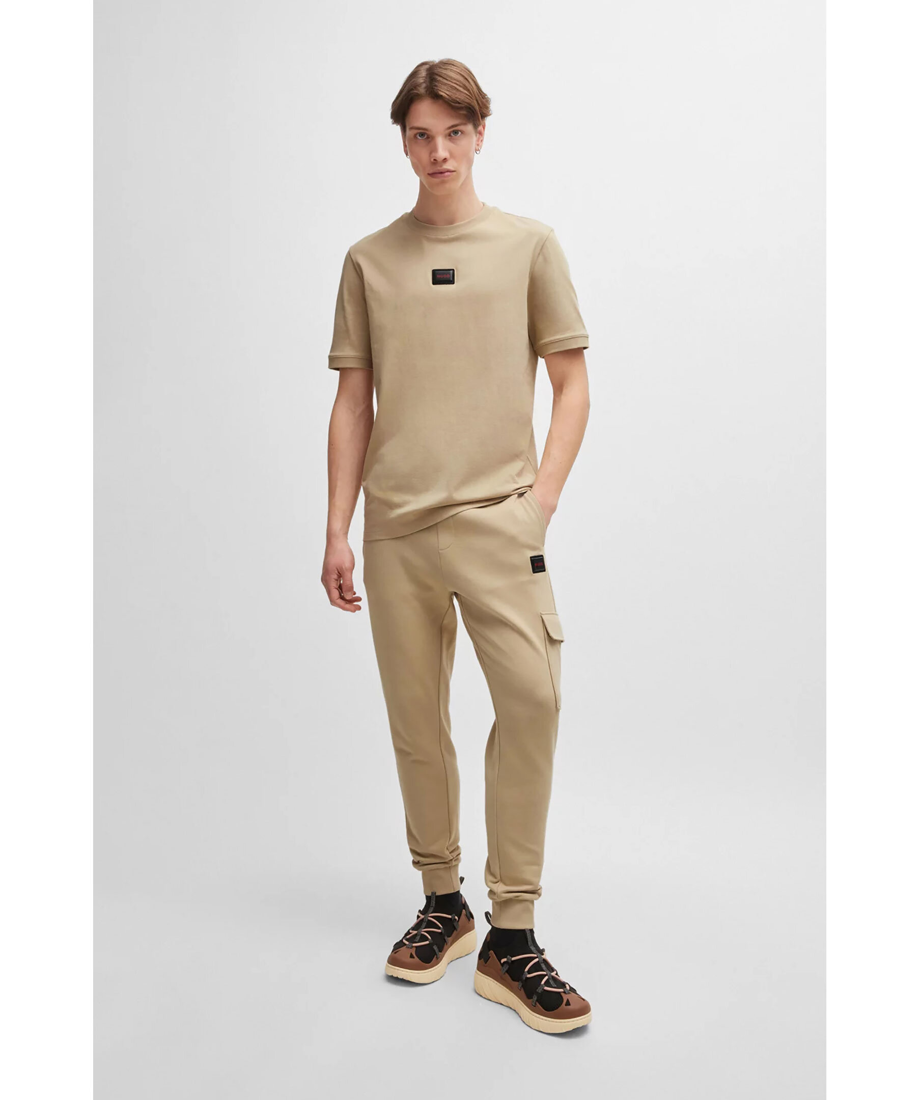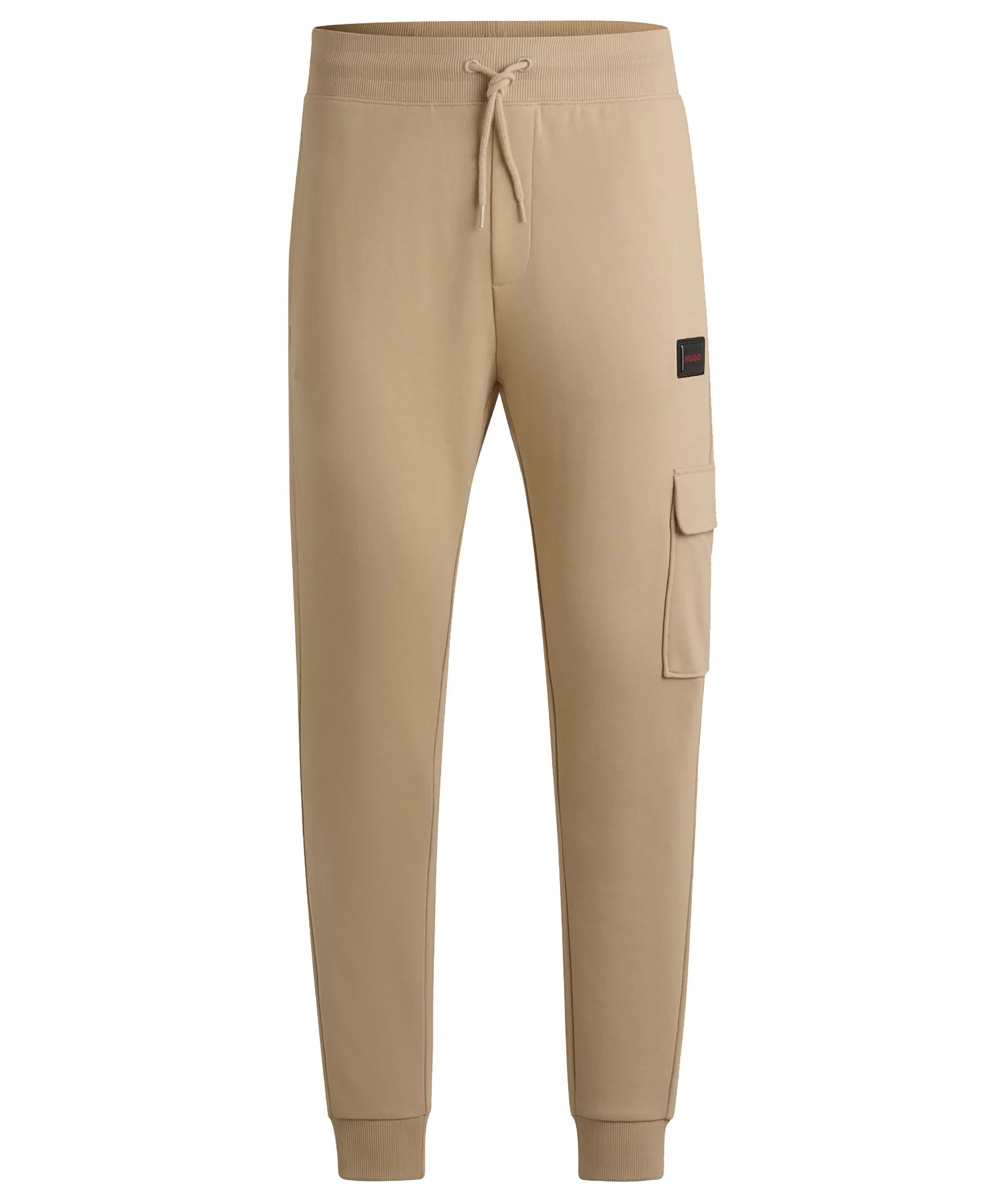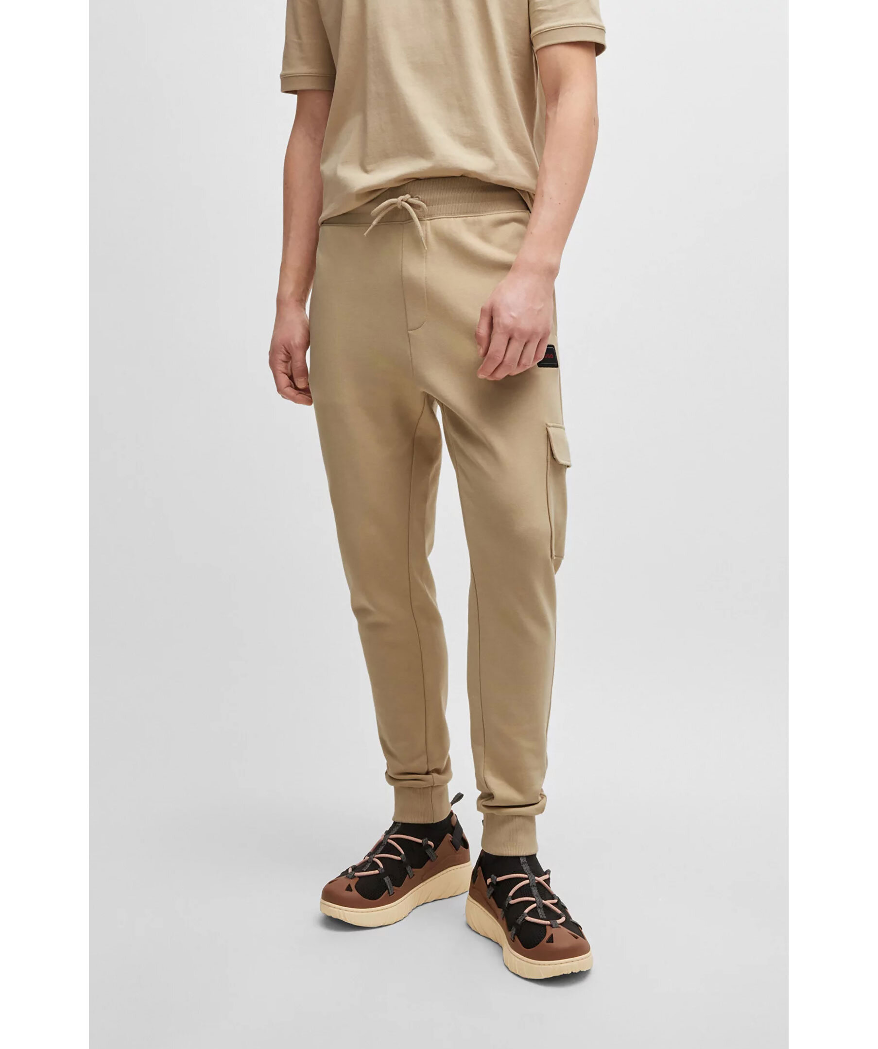 Beigea mjukisbyxor från HUGO. Byxorna har elastisk midja med snörning, två sidfickor, en bakficka samt en ficka på benet med lock och en logga i gelématerial på bröstet. Tillverkade i bomull.