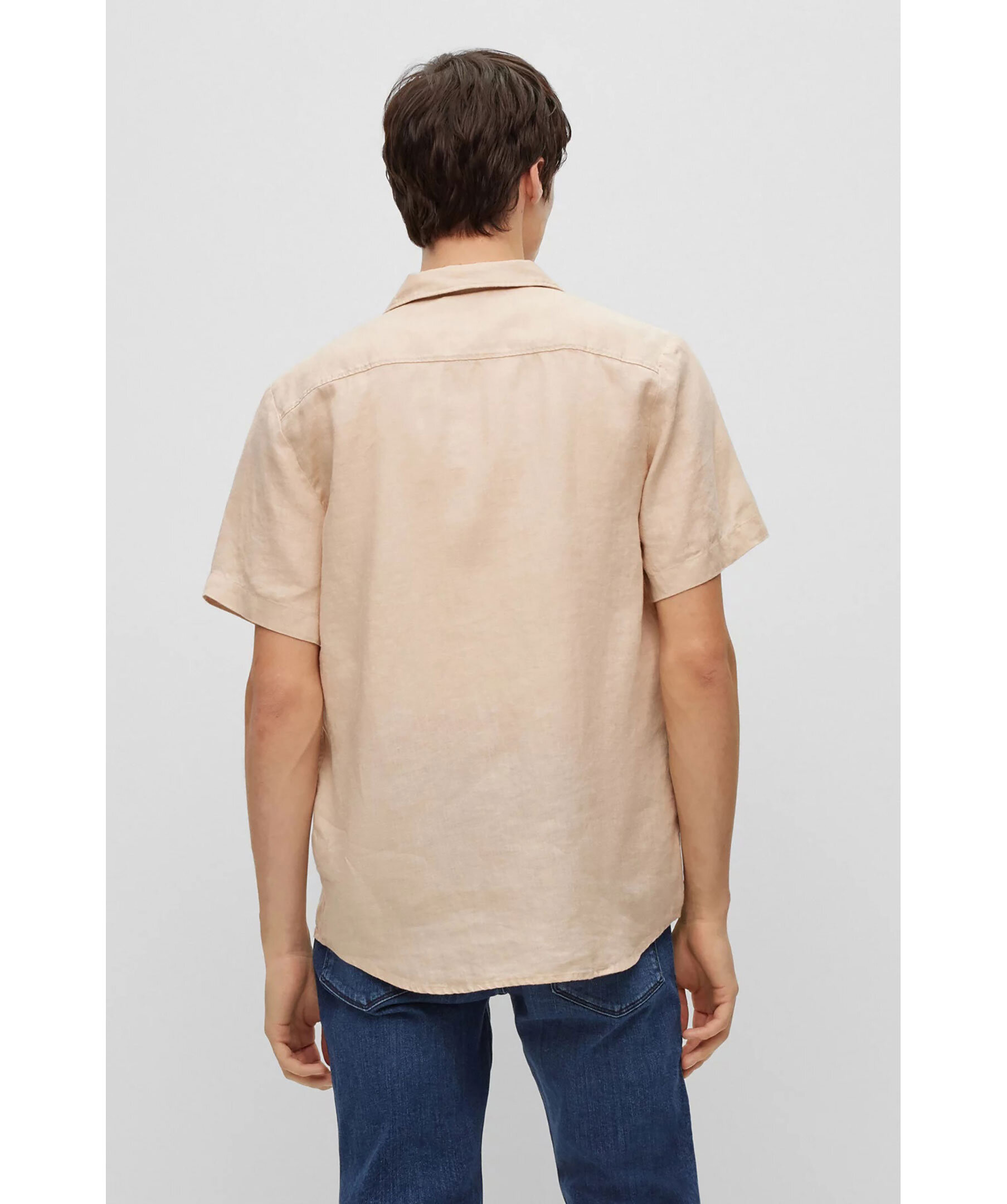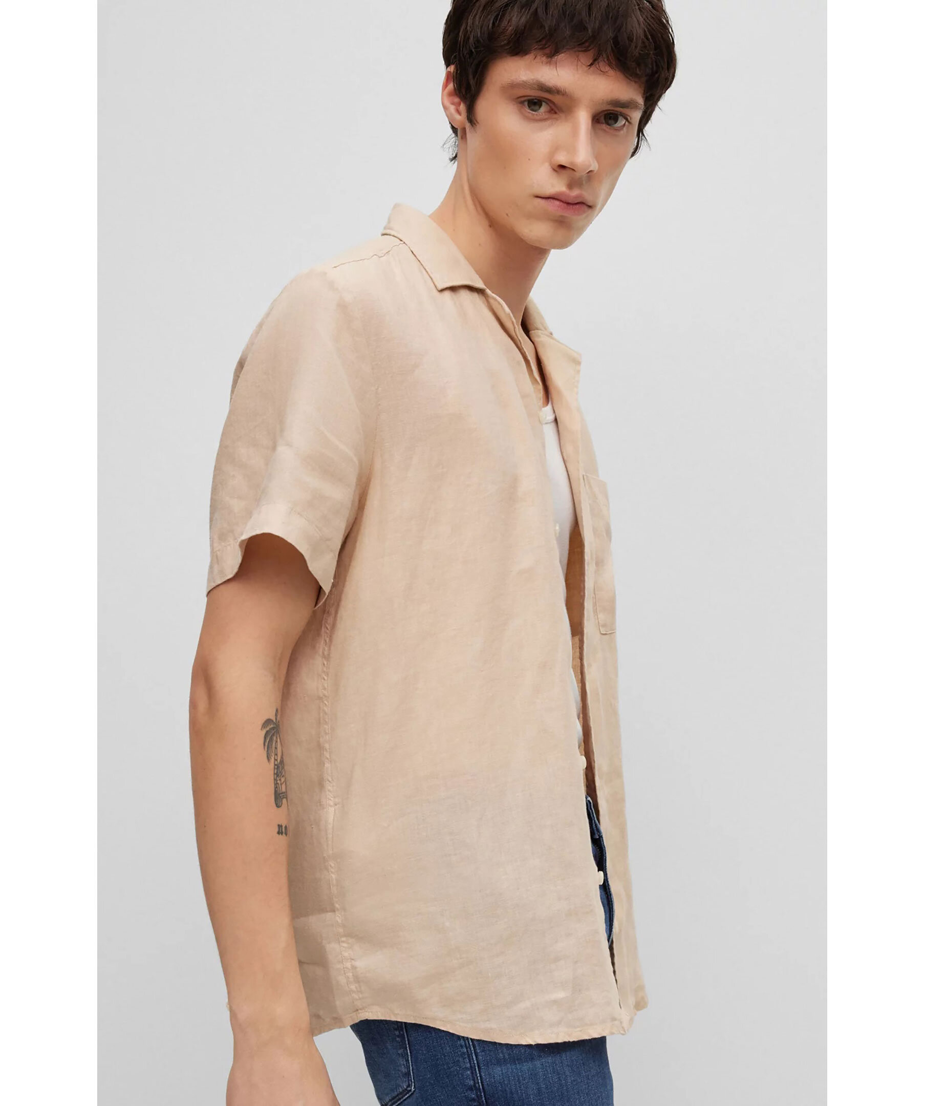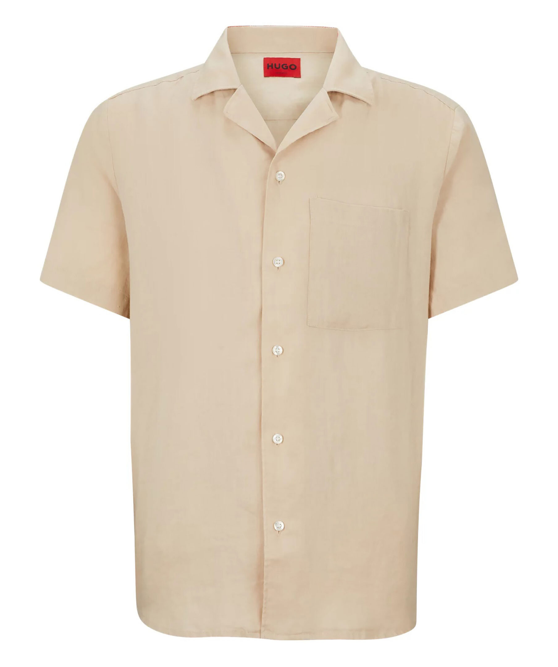 Beige skjorta i linne från HUGO med korta ärmar. Stängs framtill med knappar. Campkrage, bröstficka på vänstersida. Tillverkad i 100% linne.