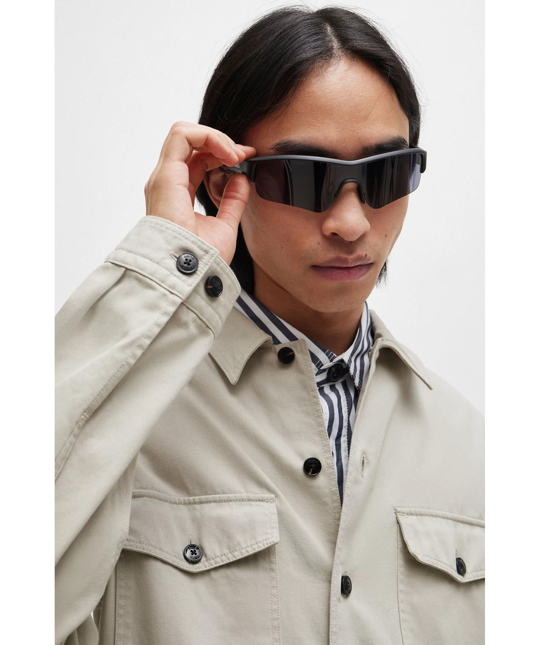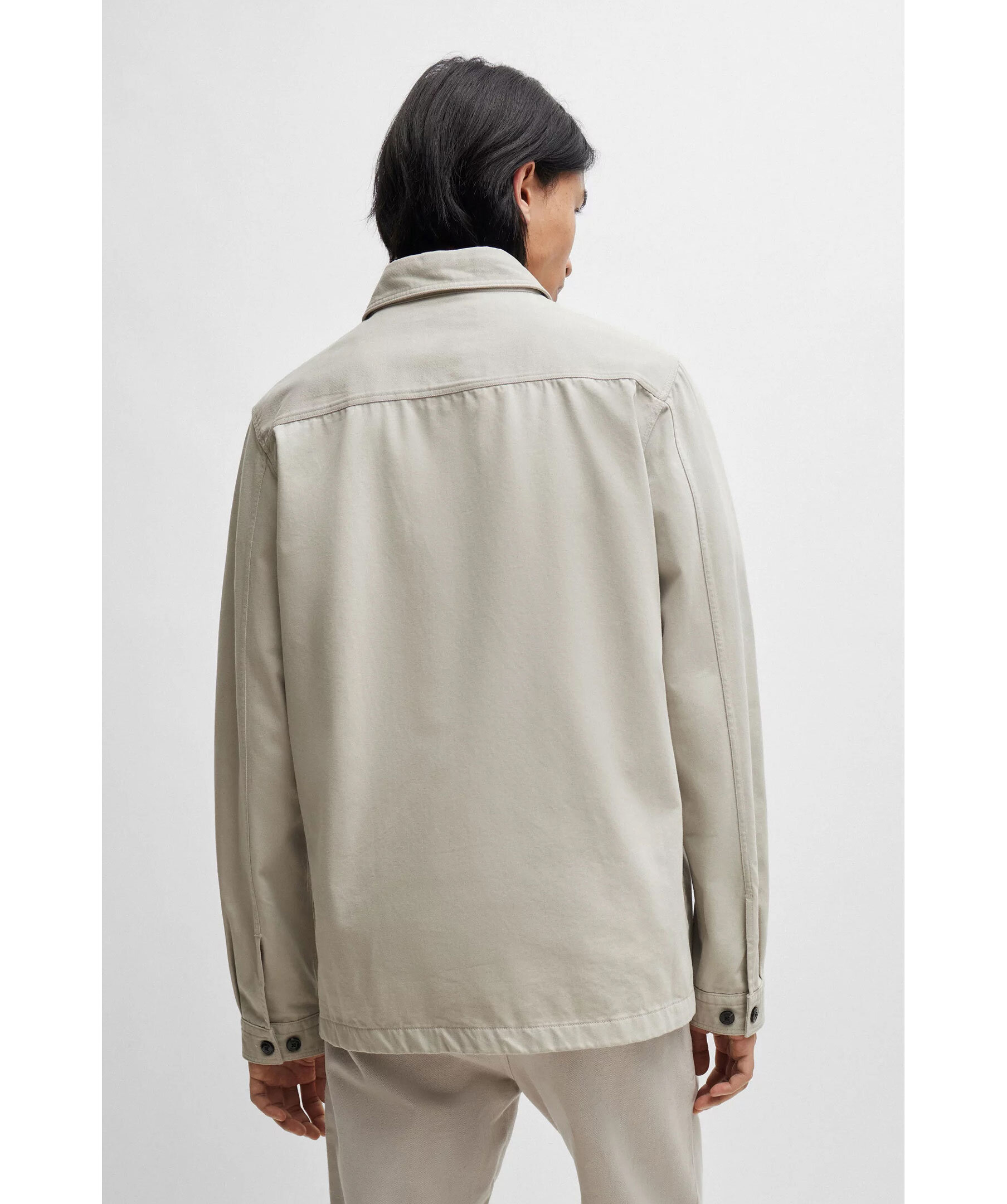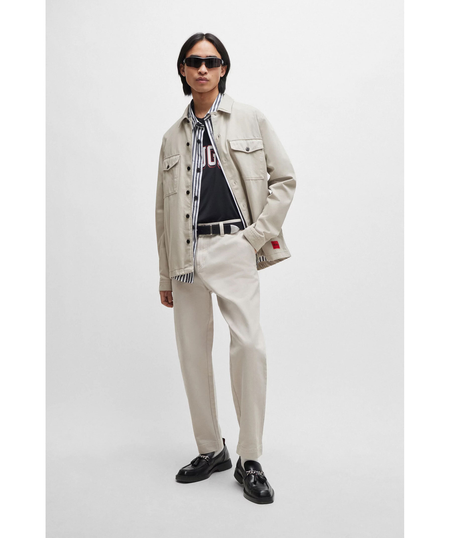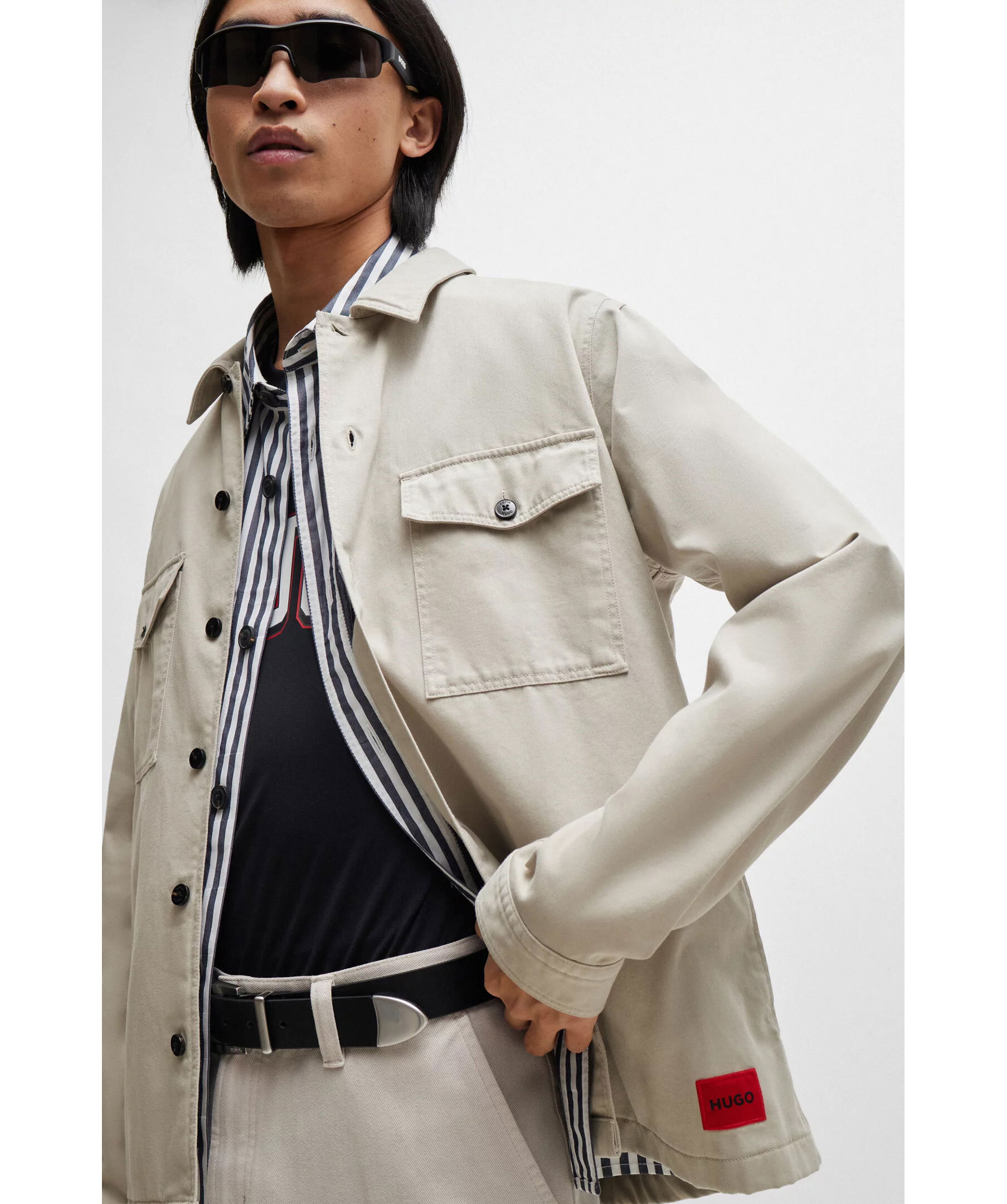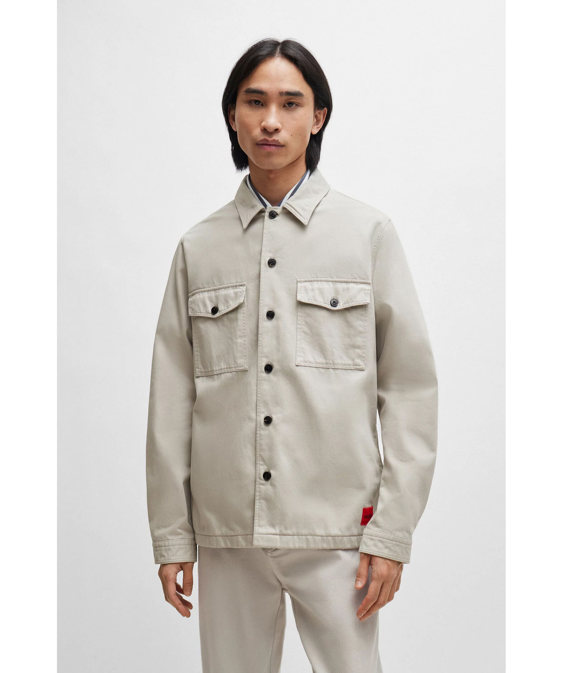 Greige overshirt från HUGO. Stängs framtill med knappar. Två bröstfickor som stängs med lock och knappar. Spetsig krage. Enkla manschetter vid ärmslut. Röd patch med svart logotyp i vänstra hörnet av skjortan.