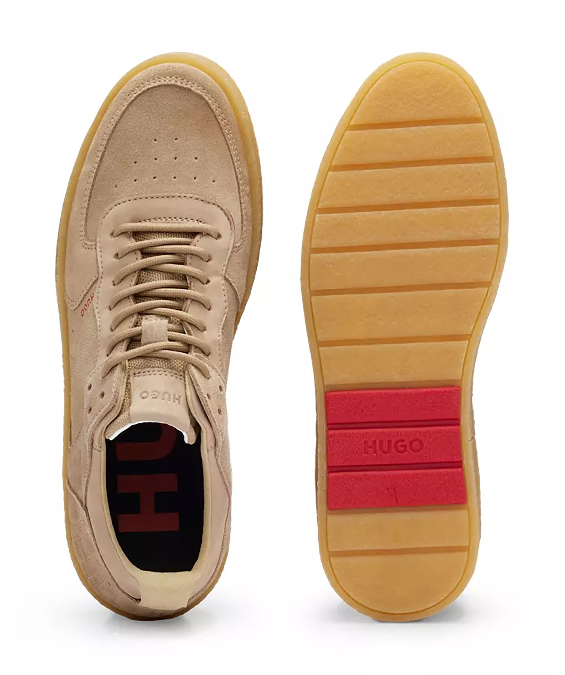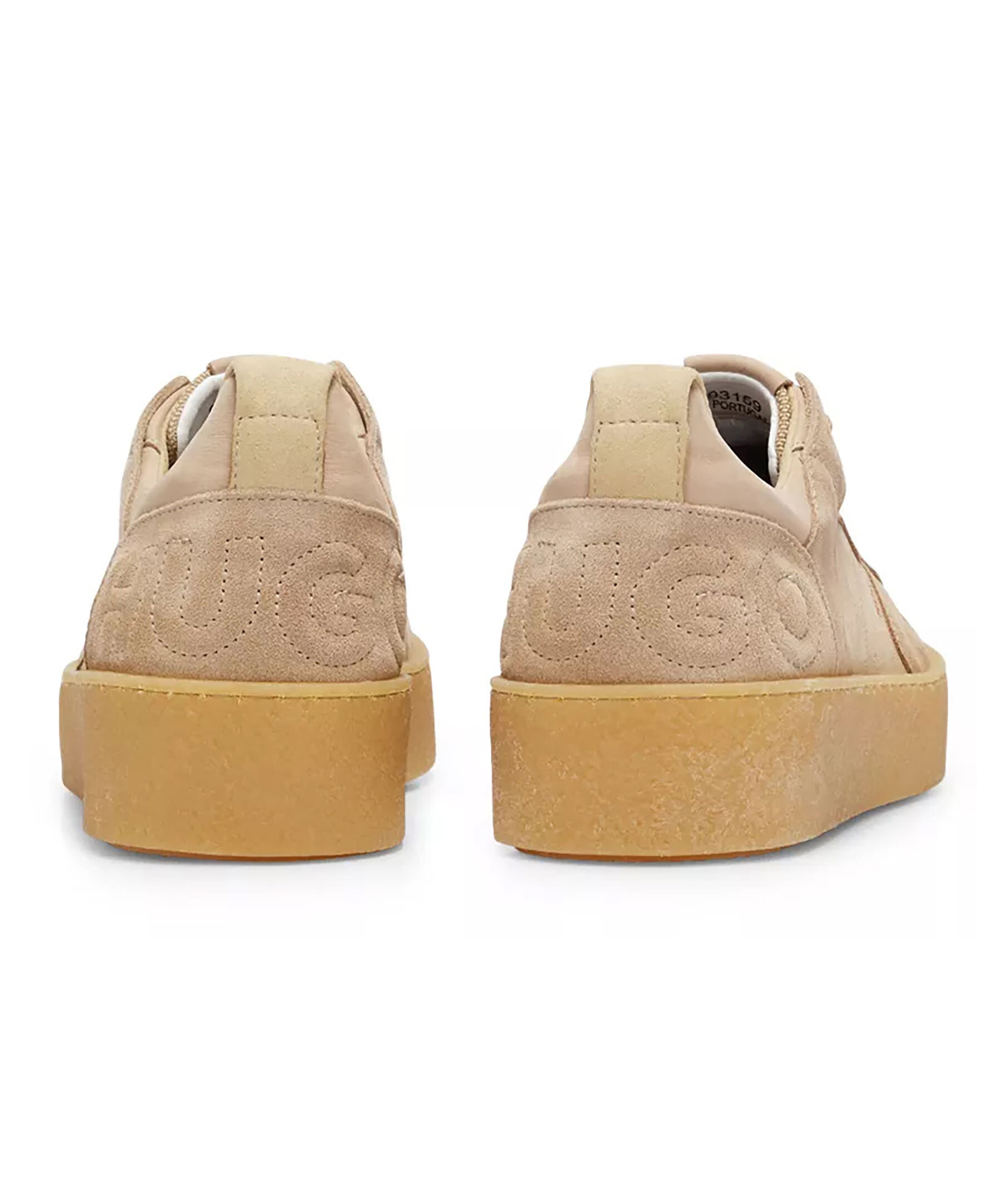 Beigea sneakers i mjuk mocka och hög sula från HUGO. Stor logotyp, insydd över hälen och loten logotyp på plösen och på sidan. Beigea snören och sula i gummi.