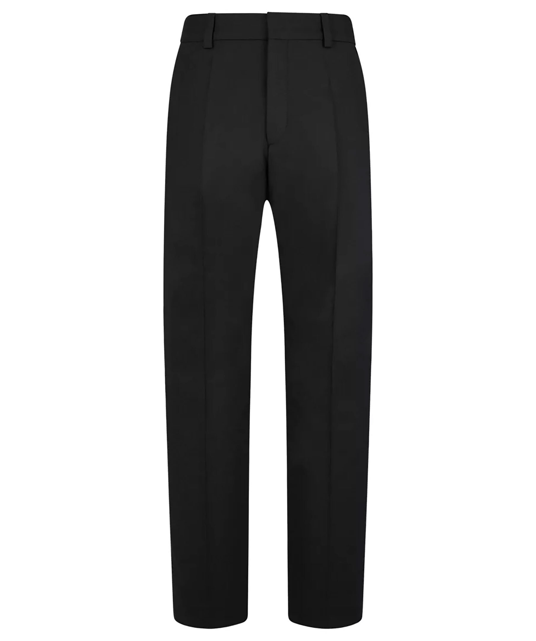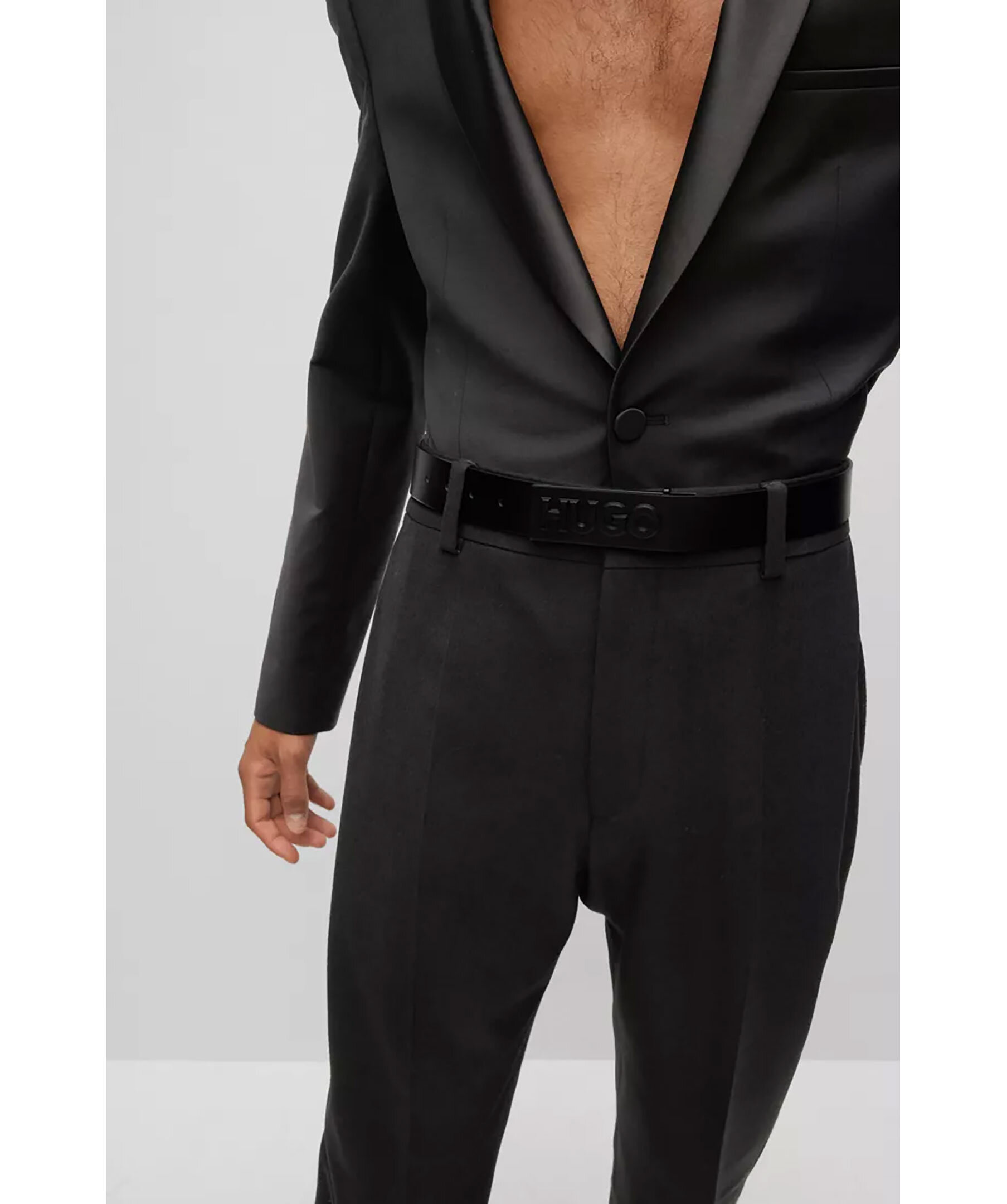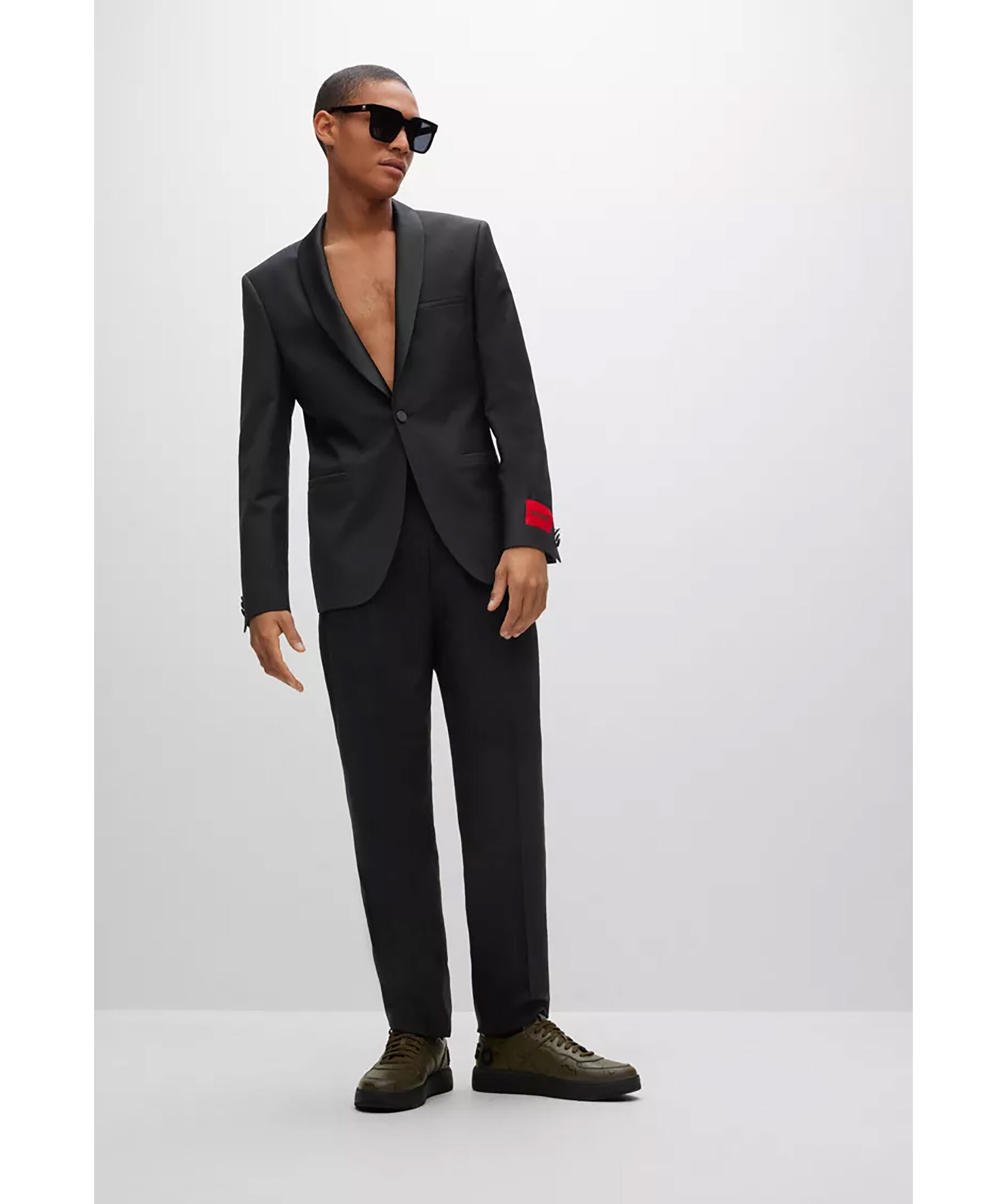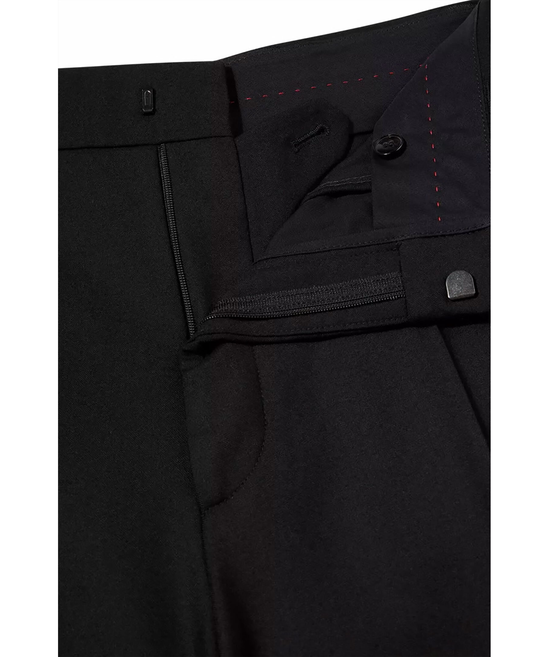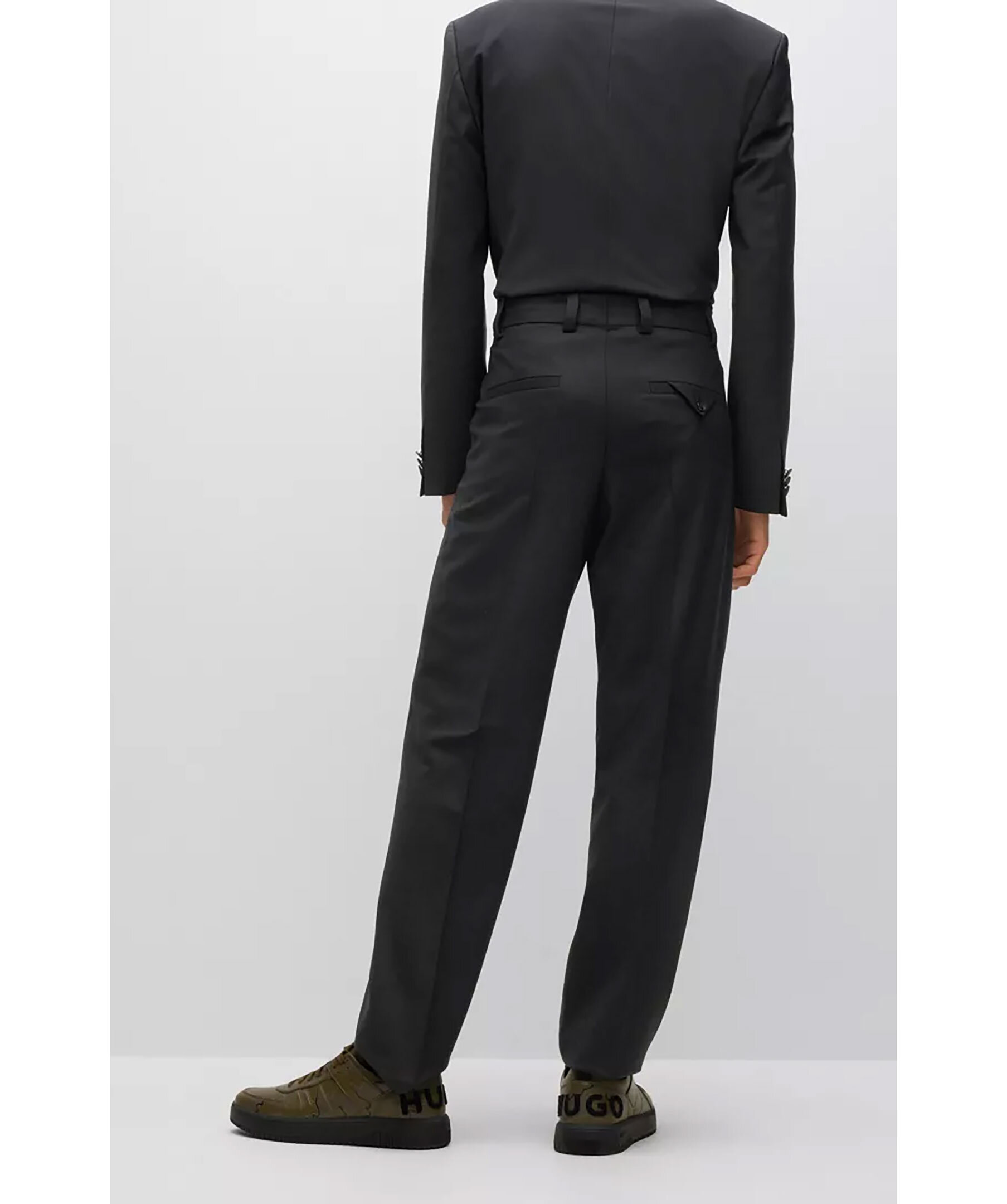Svarta kostymbyxor från HUGO men. Byxorna har en avslappnad passform med vida ben och gjorda i en ullblandning. Gylfen stängs med dragkedja och hake. Bältes hällor runt midjan. Dekorativa pressveck. Två framfickor och två bakfickor. Modellen är 184cm lång och har på sig storlek 48.