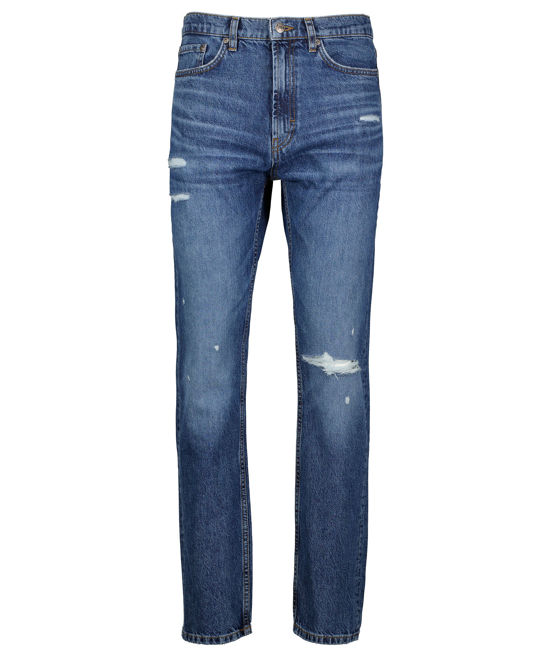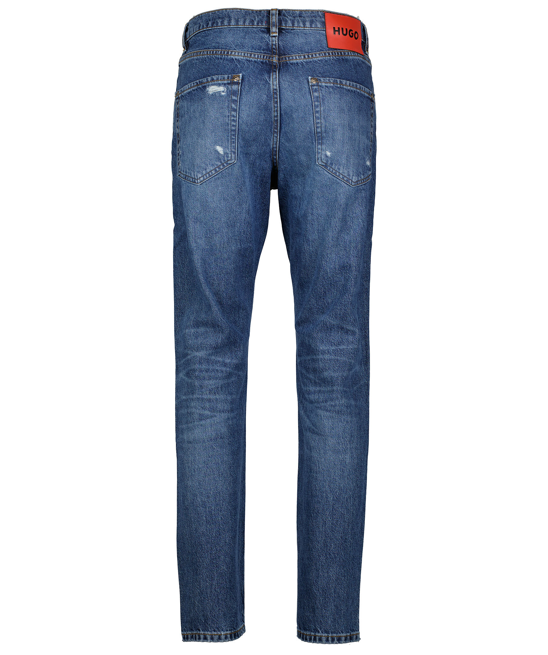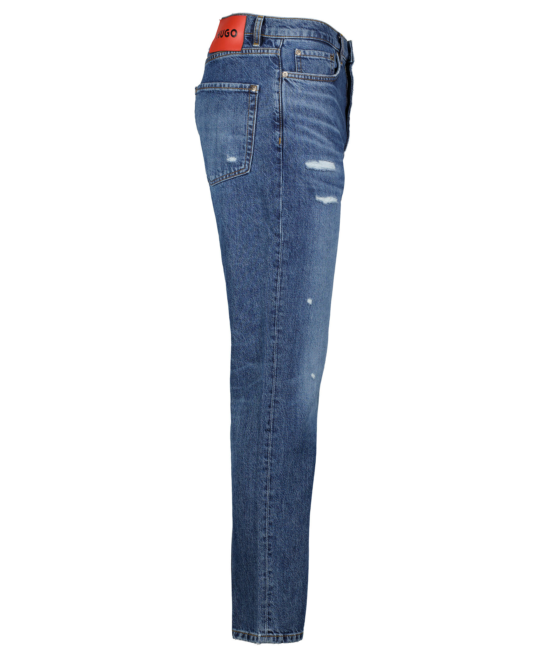 Mellanblå jeans i regular modell från HUGO. Tillverkade i 100% bomull och har medvetna slitningar och hål. Femficksmodell, röd patch med logotyp i midjan bak och hällor för bälte i midjan. Gylf med dold dragkedja och knapp.