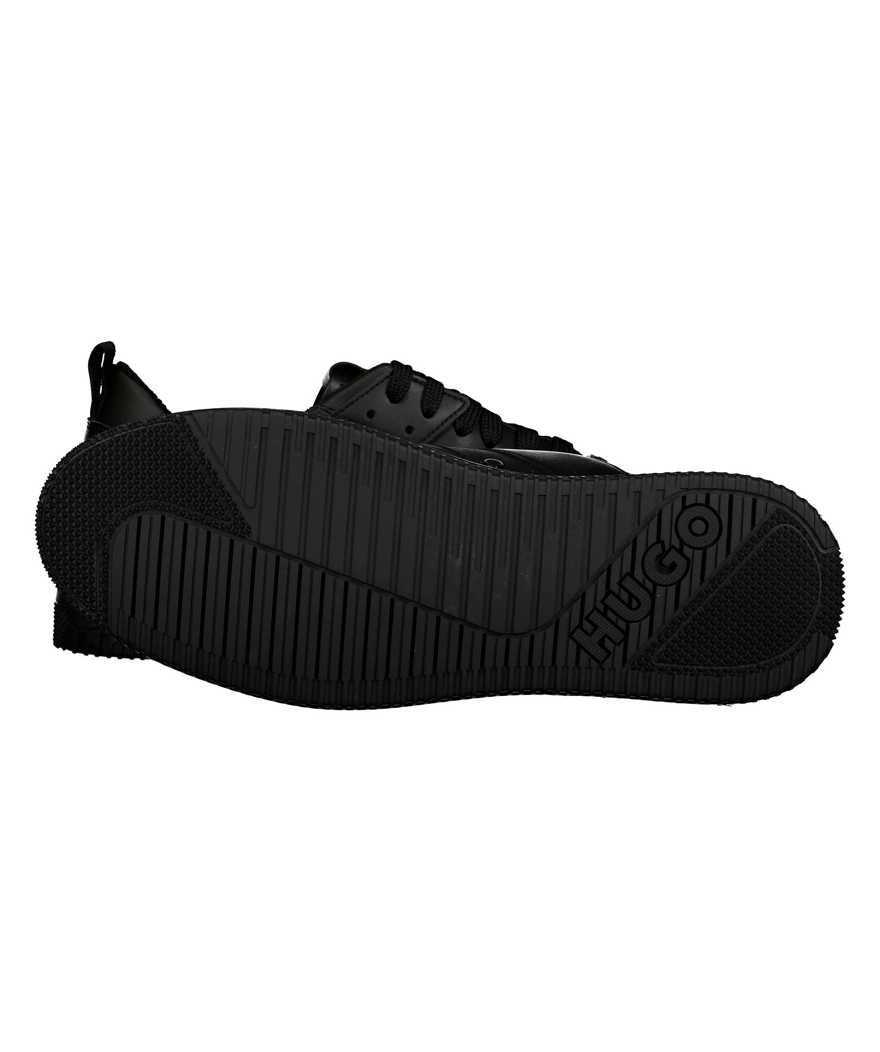 Svarta sneakers i läder från HUGO i en matt finish. Stor logotyp över hälen. stansad logotyp på skons yttersida och plösen. Grov sula i gummi. Platta skosnören med liten patch med logotyp.