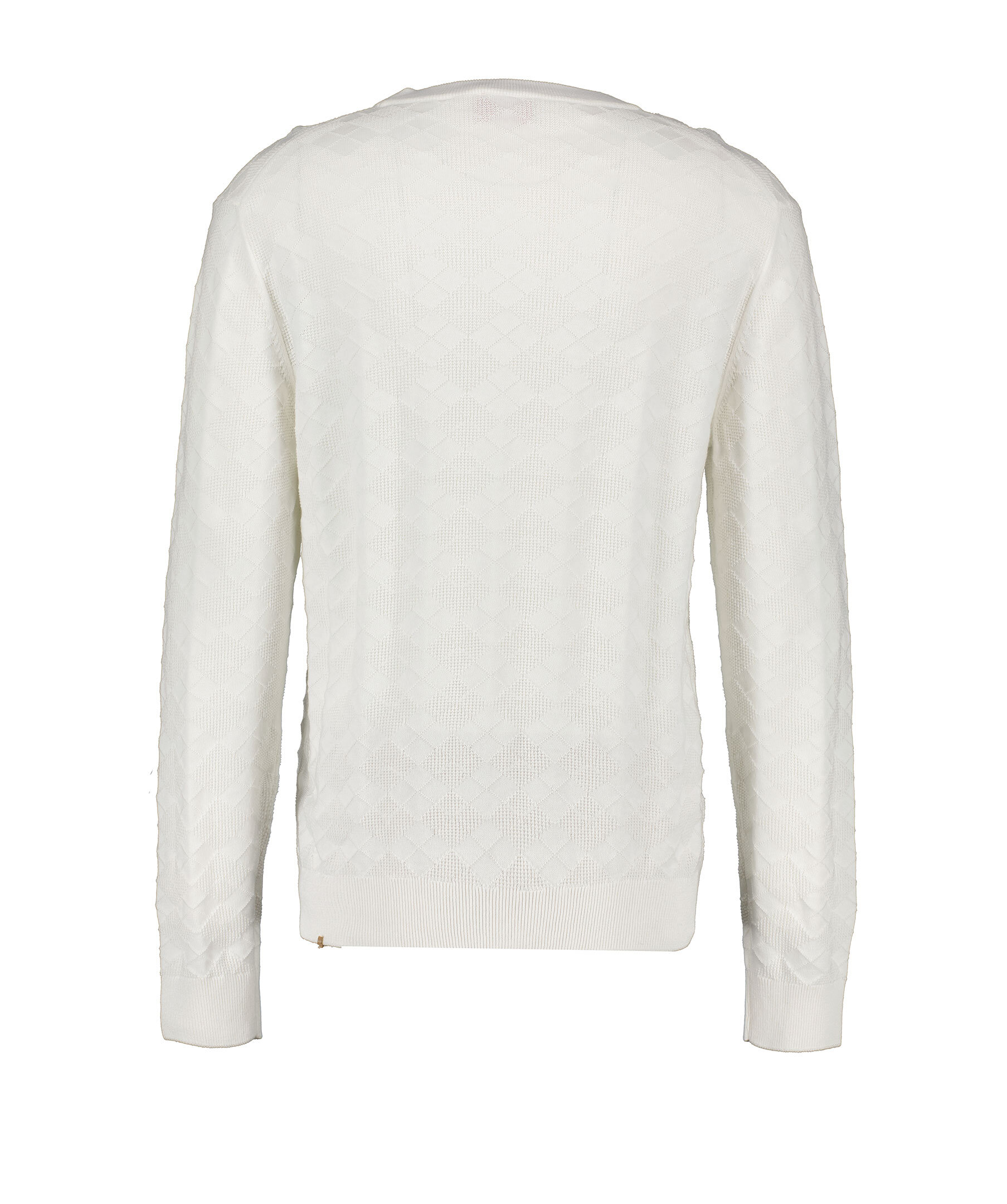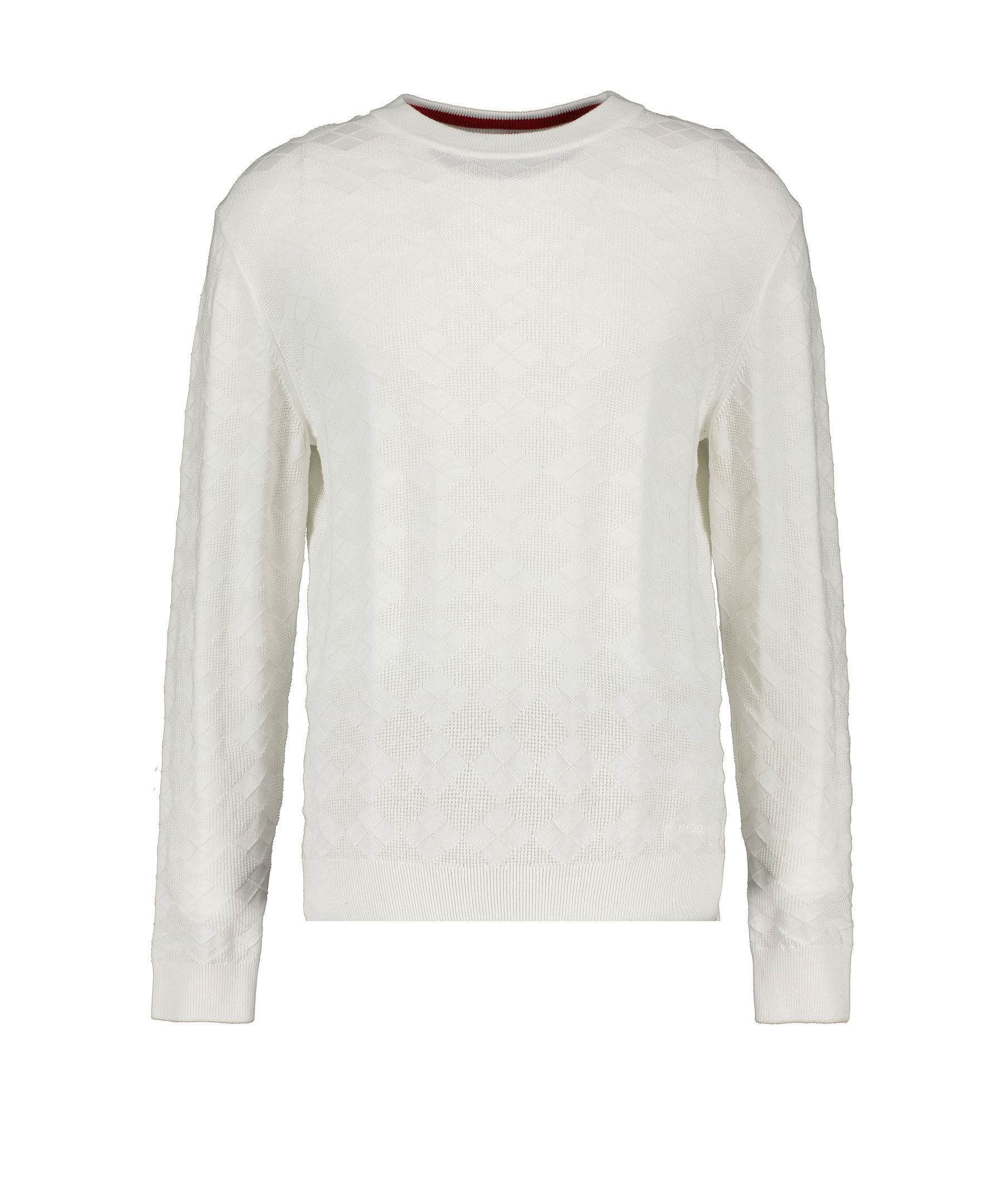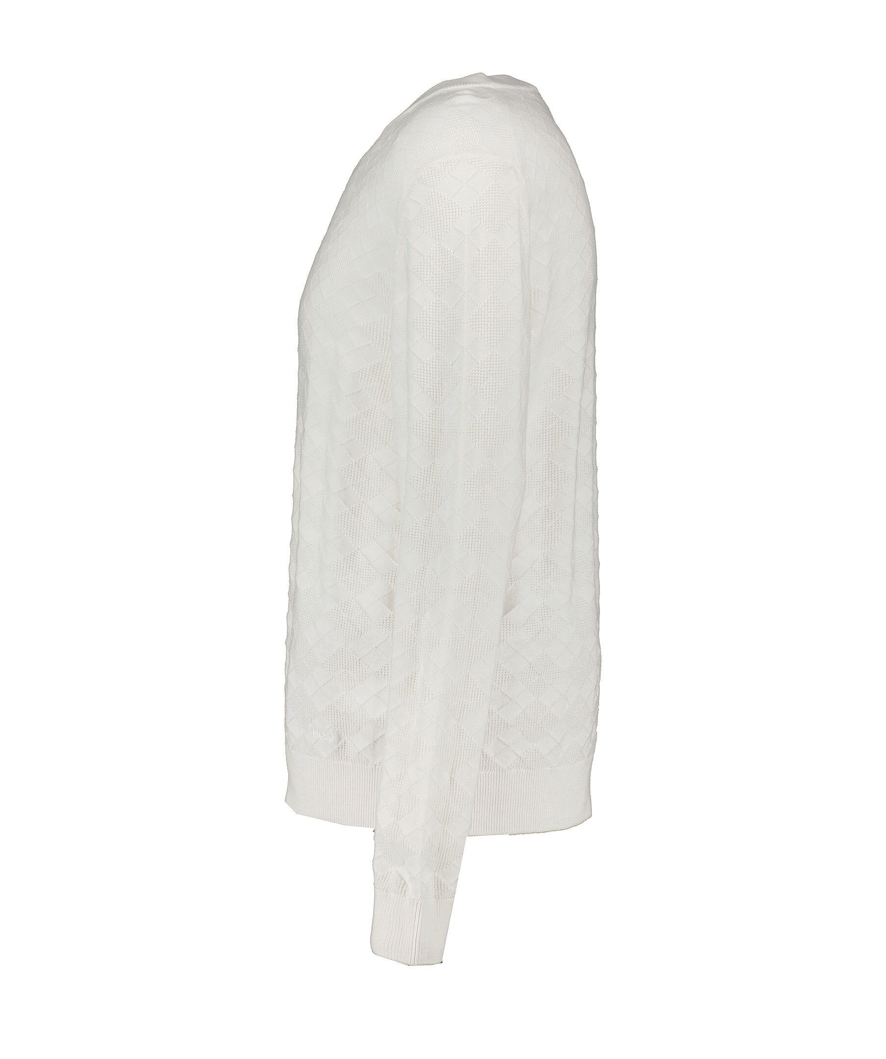 Vit, mönsterstickad pullover från HUGO. Tröjan har ribbstickad krage samt ribbstickade muddar vid ärm- och plaggslut. Liten, broderad logotyp i nederkant. Tillverkad i bomull.