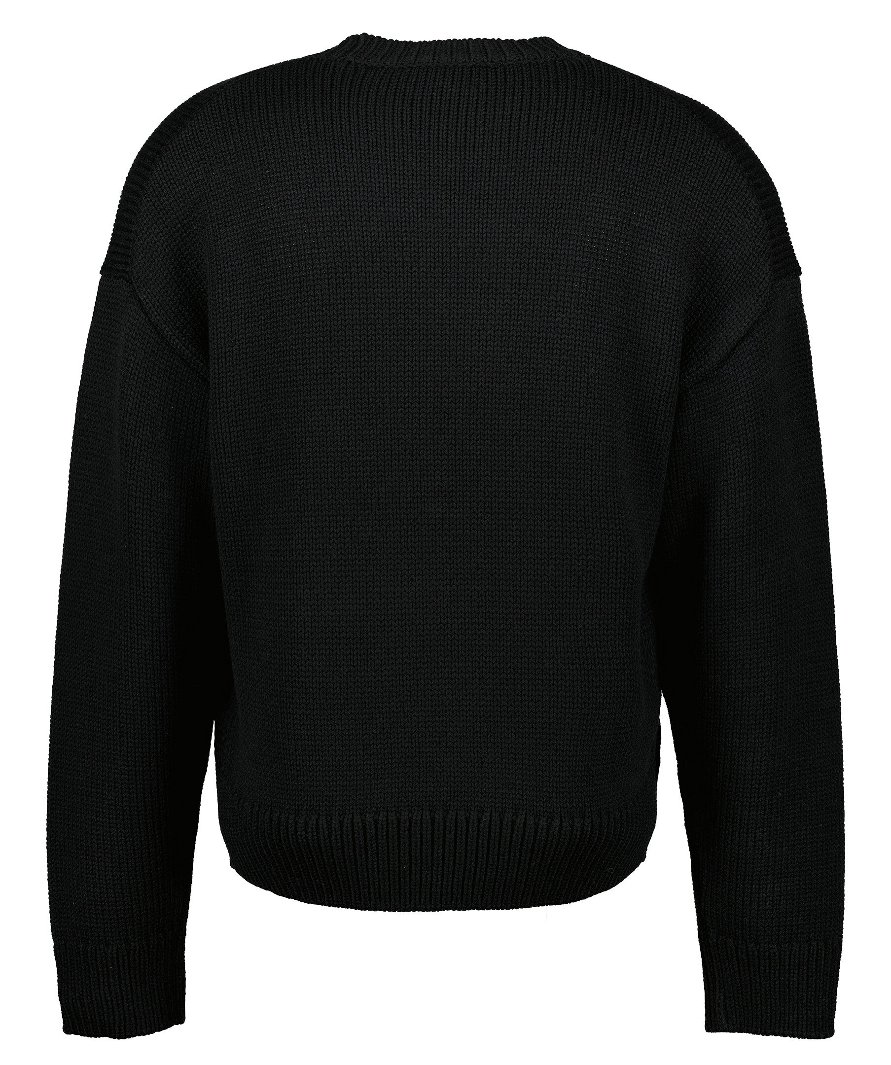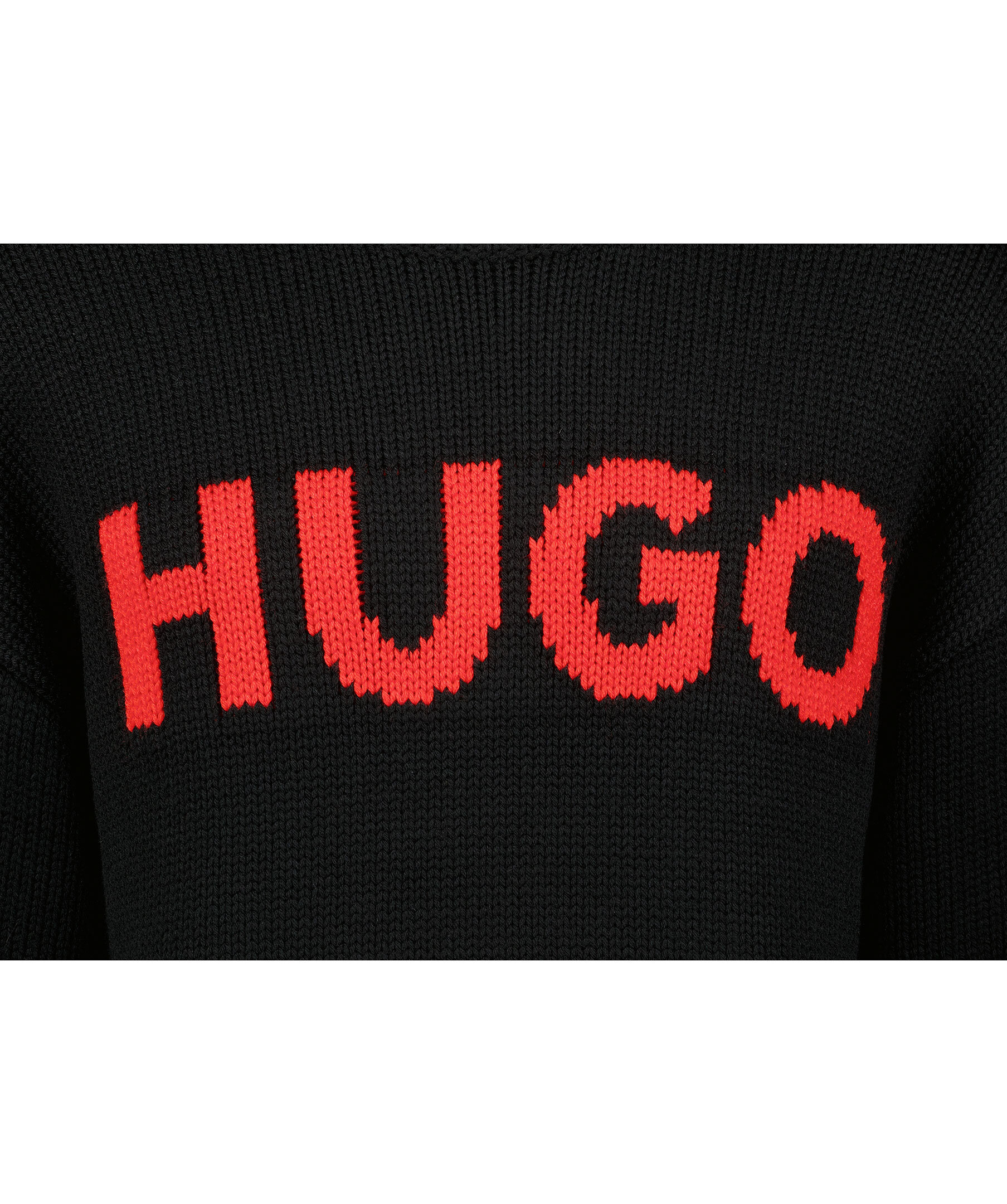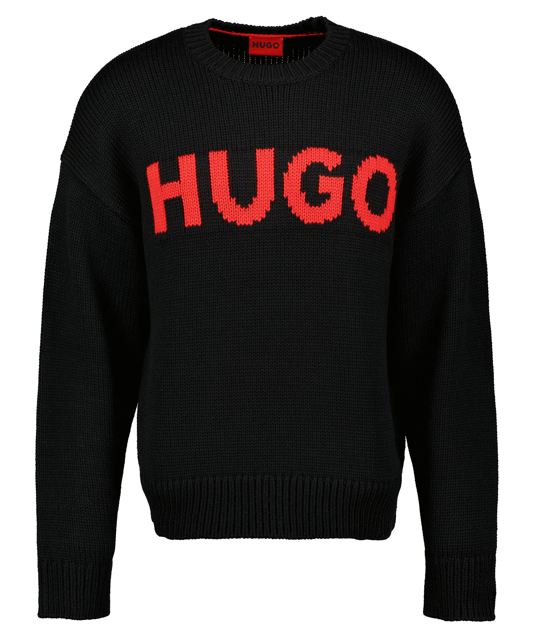 Svart stickad tröja i ullblandning från HUGO. Tröjan har en avslappnad passform och stor stickad logotyp i rött på bröstet. Ribbade muddar vid halsrings, ärm och plaggslut.