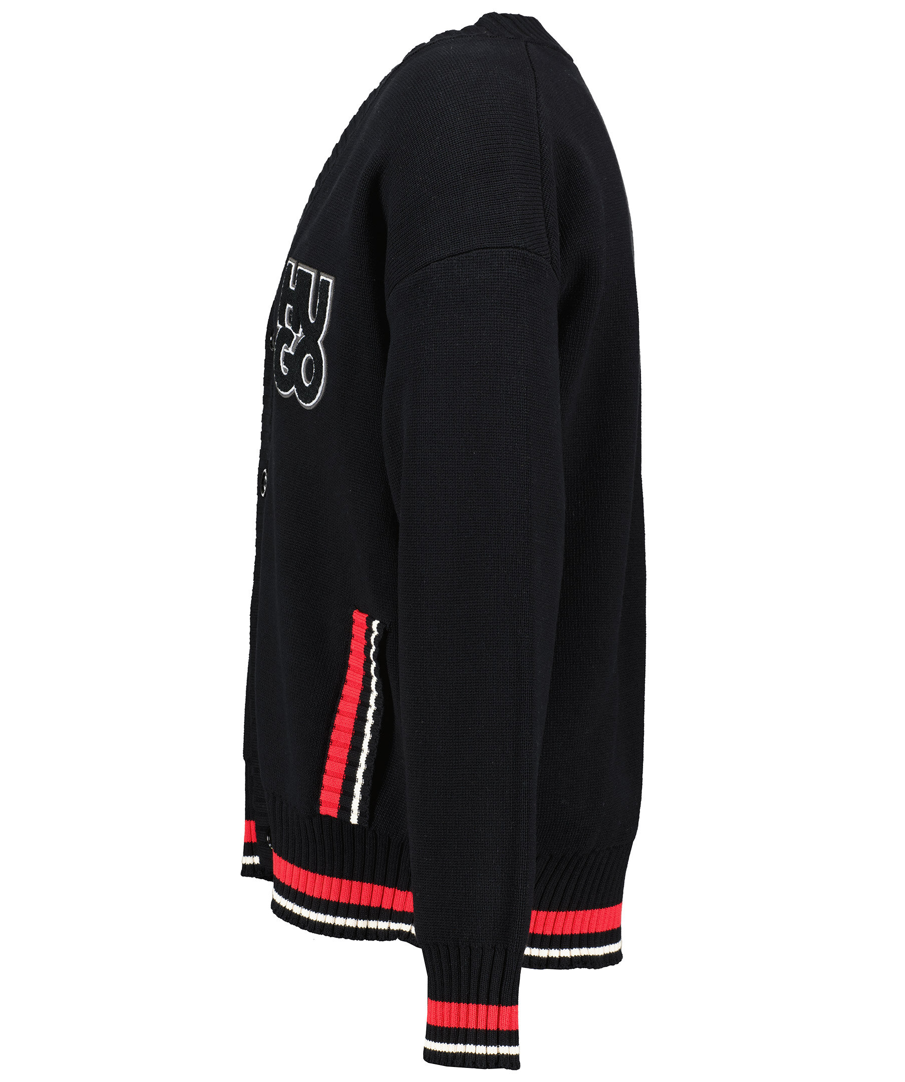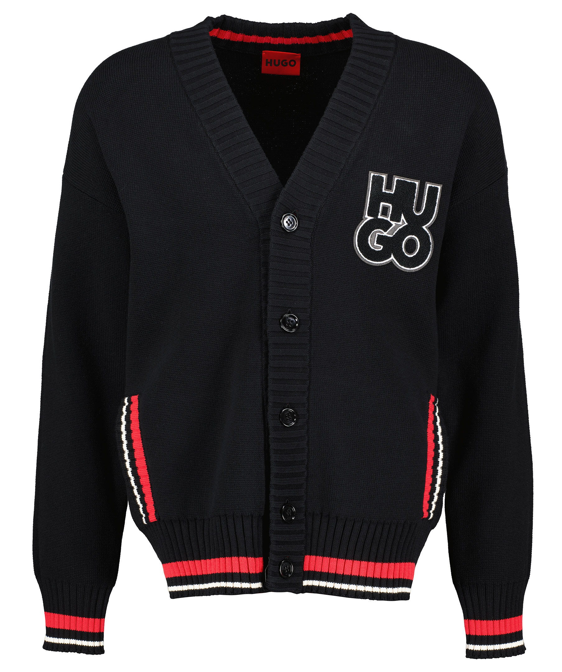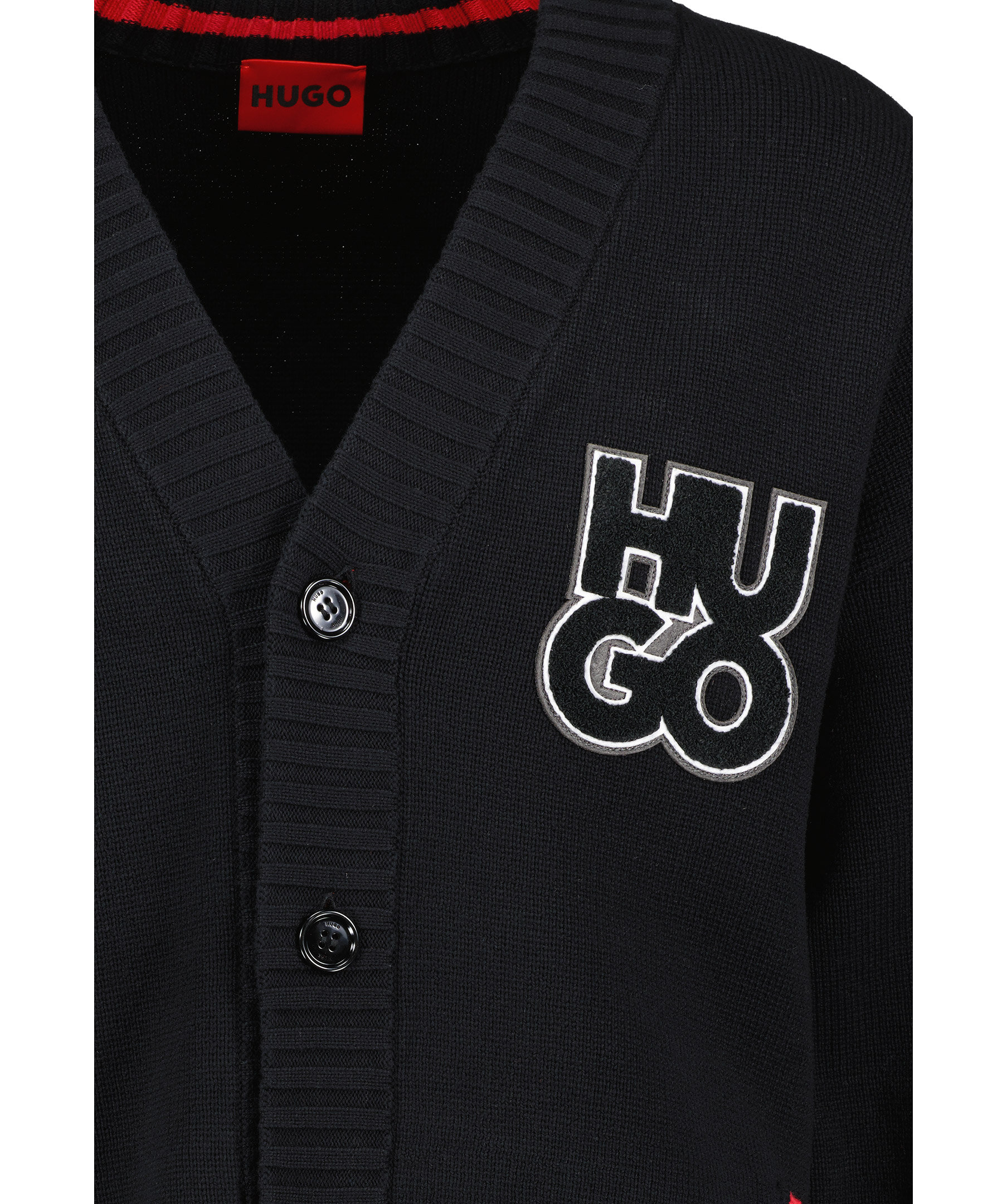 Svart stickad cardigan från HUGO men. Varsity inspirerad modell med en djup V-ringning, logotyp på bröstet och två framfickor. Ribbstickade muddar och stängs med knappar.