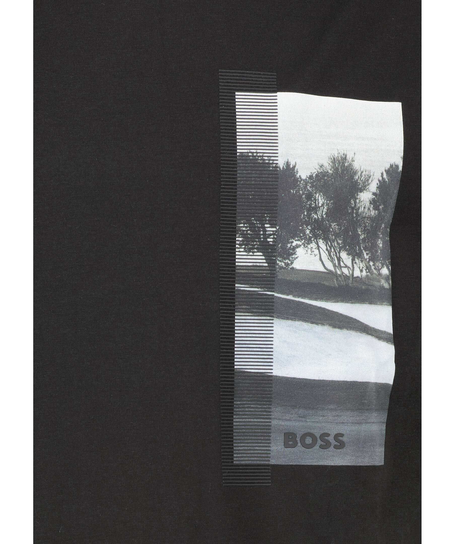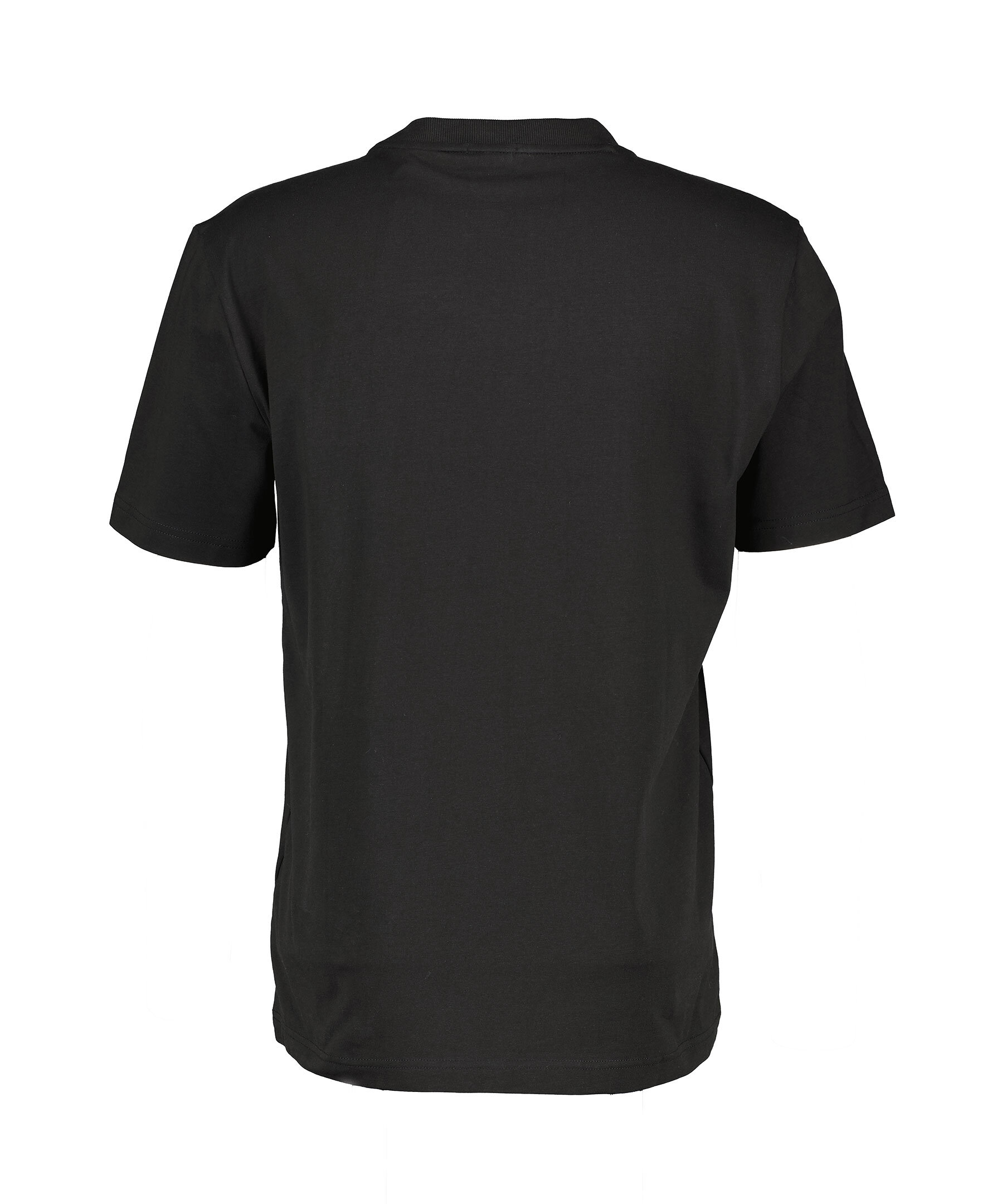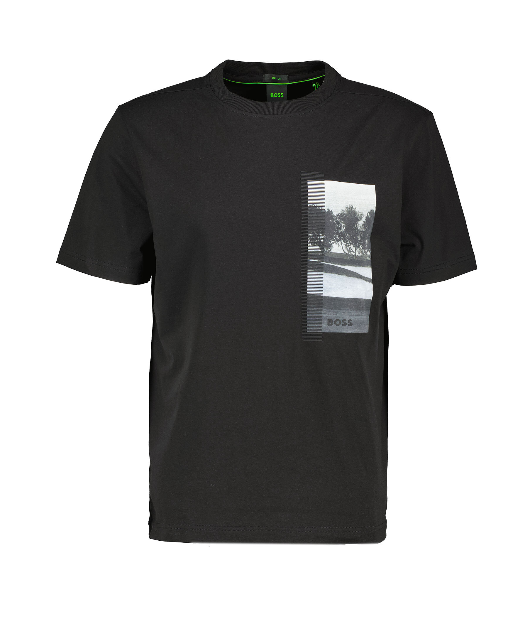 Svart T-shirt från Boss Green. T-shirten har rundad, ribbad halsringning och ett mellanstort tryck på bröstet. Tillverkad av en bomullsblandning.