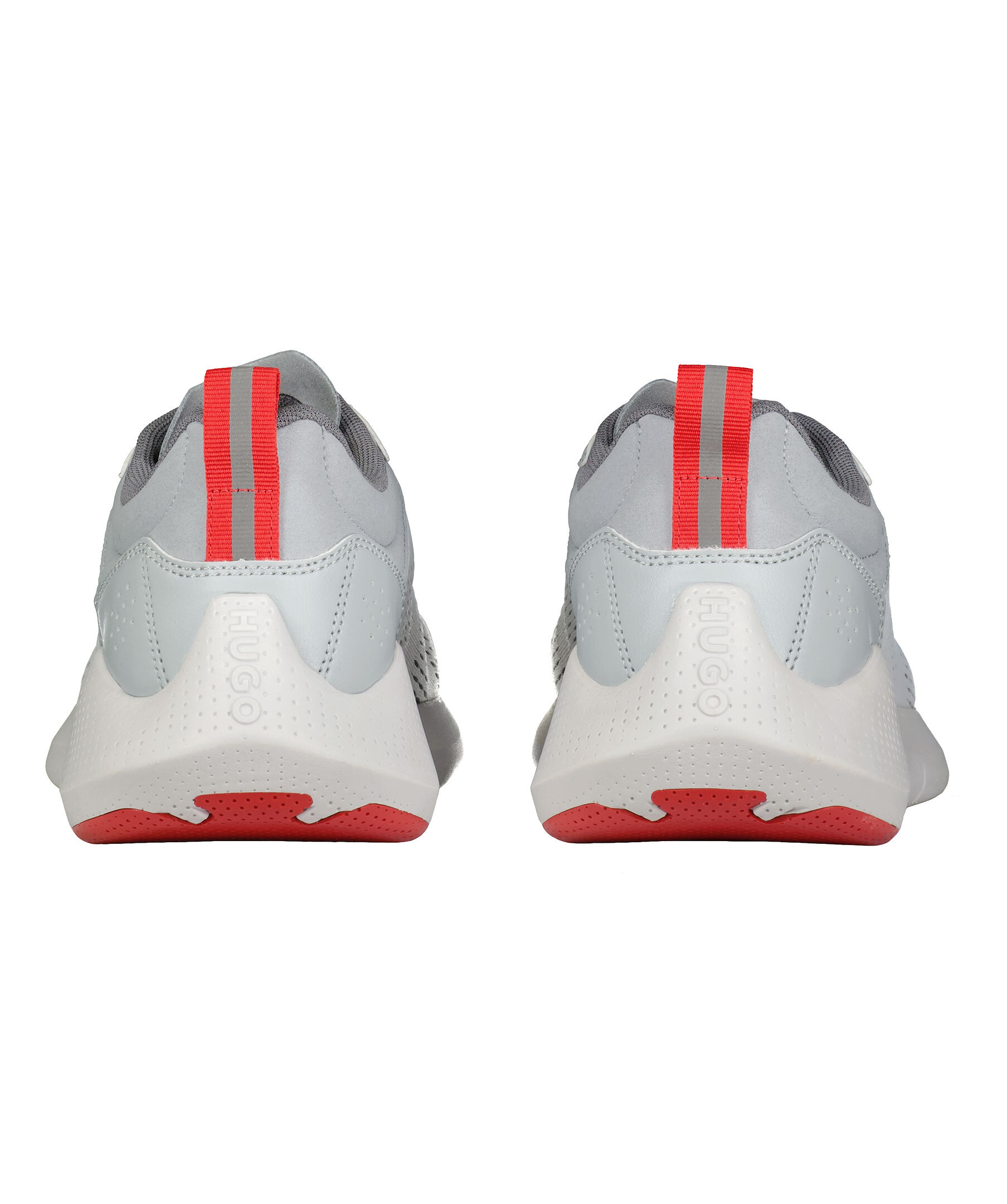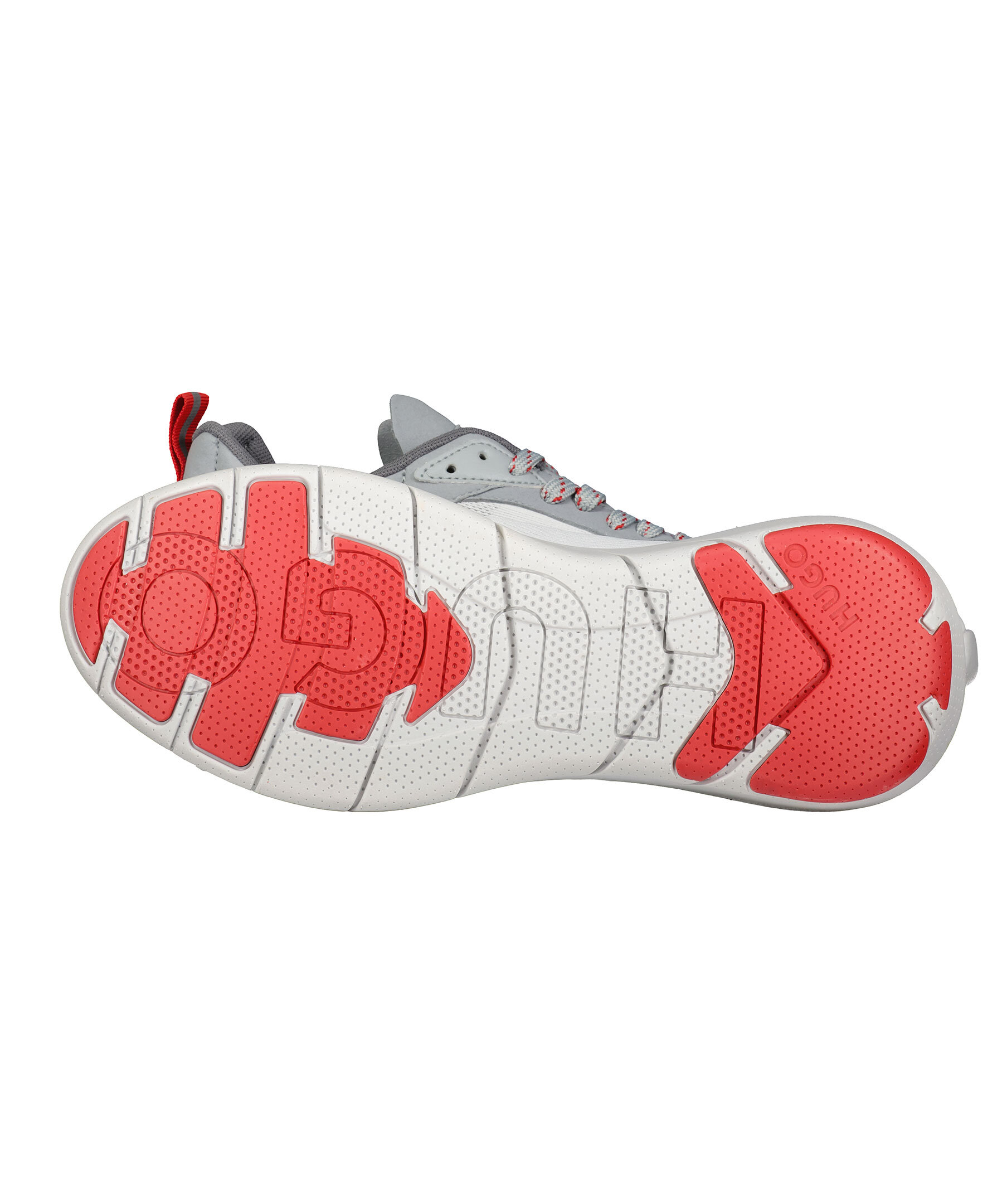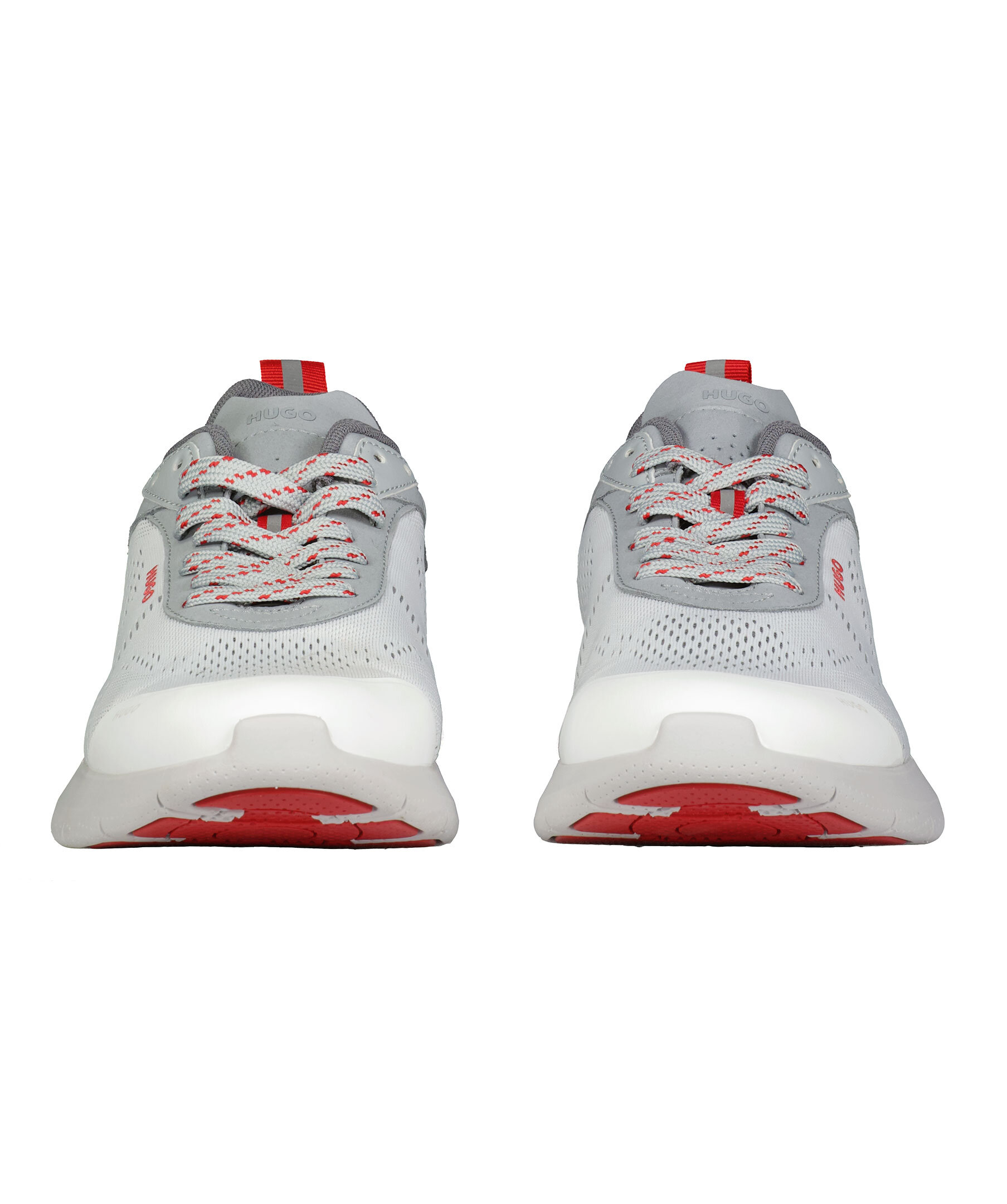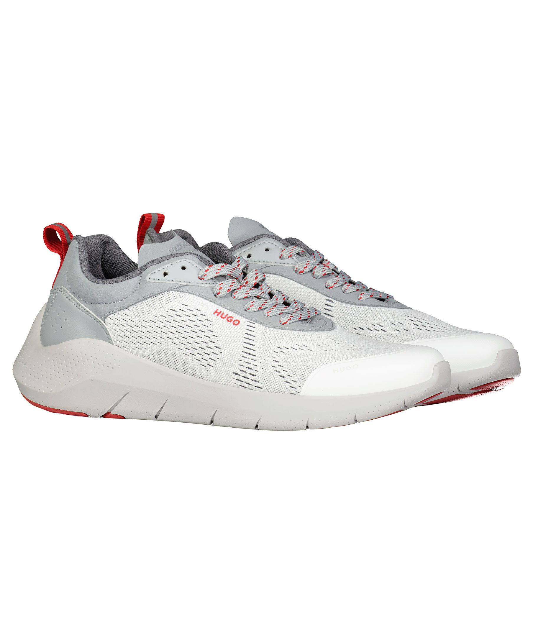 Vit sneaker från HUGO. Designade i sportigt mesh och har detaljer i grått och rött. Yttersulan är tillverkad i EVA och gummi. Snörningen är grå med rött mönster och ögla bak för att få på sig skon lättare i rött med reflextryck. Präglad logotyp på plösen och hälen samt tryck på sidan i rött.