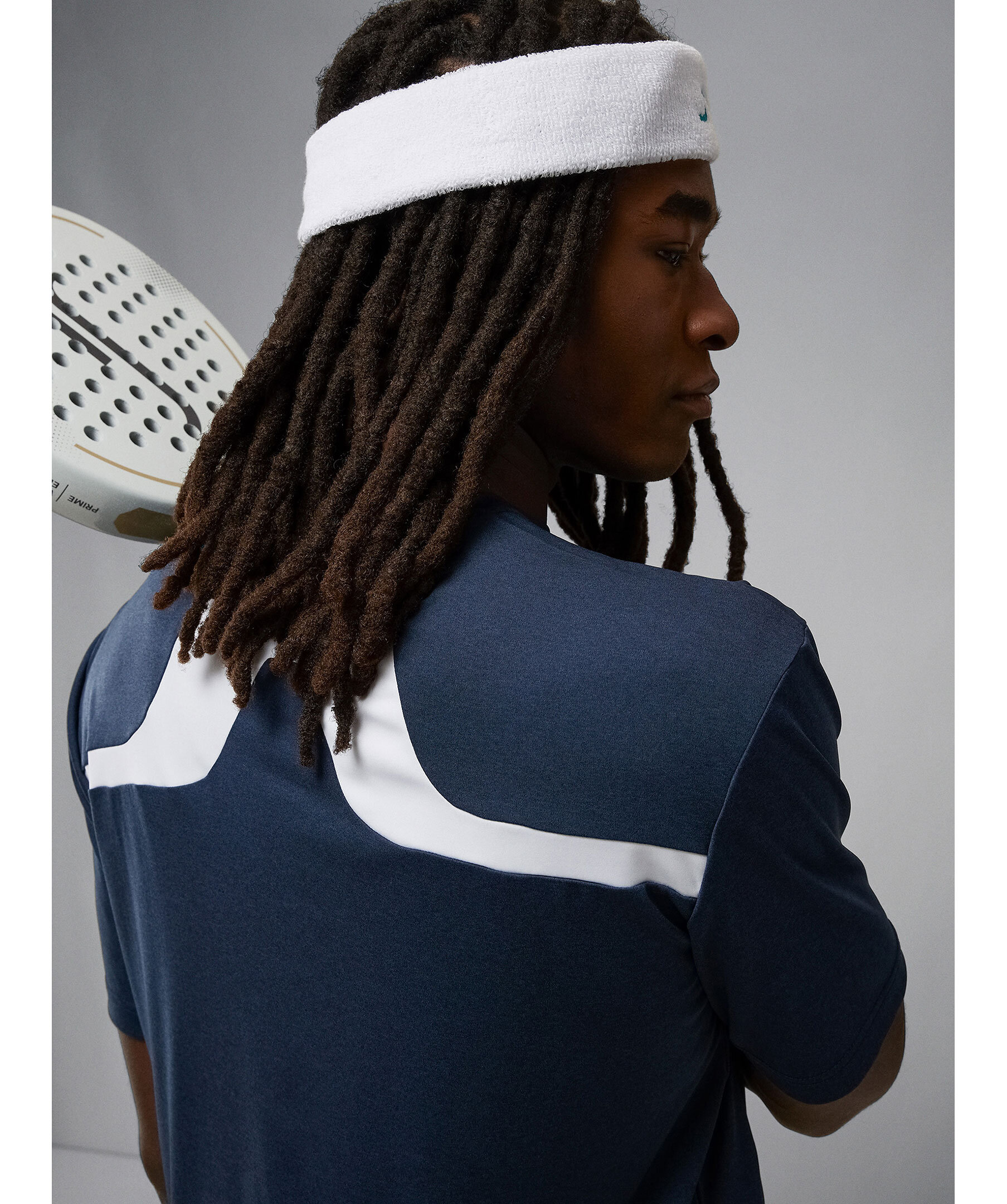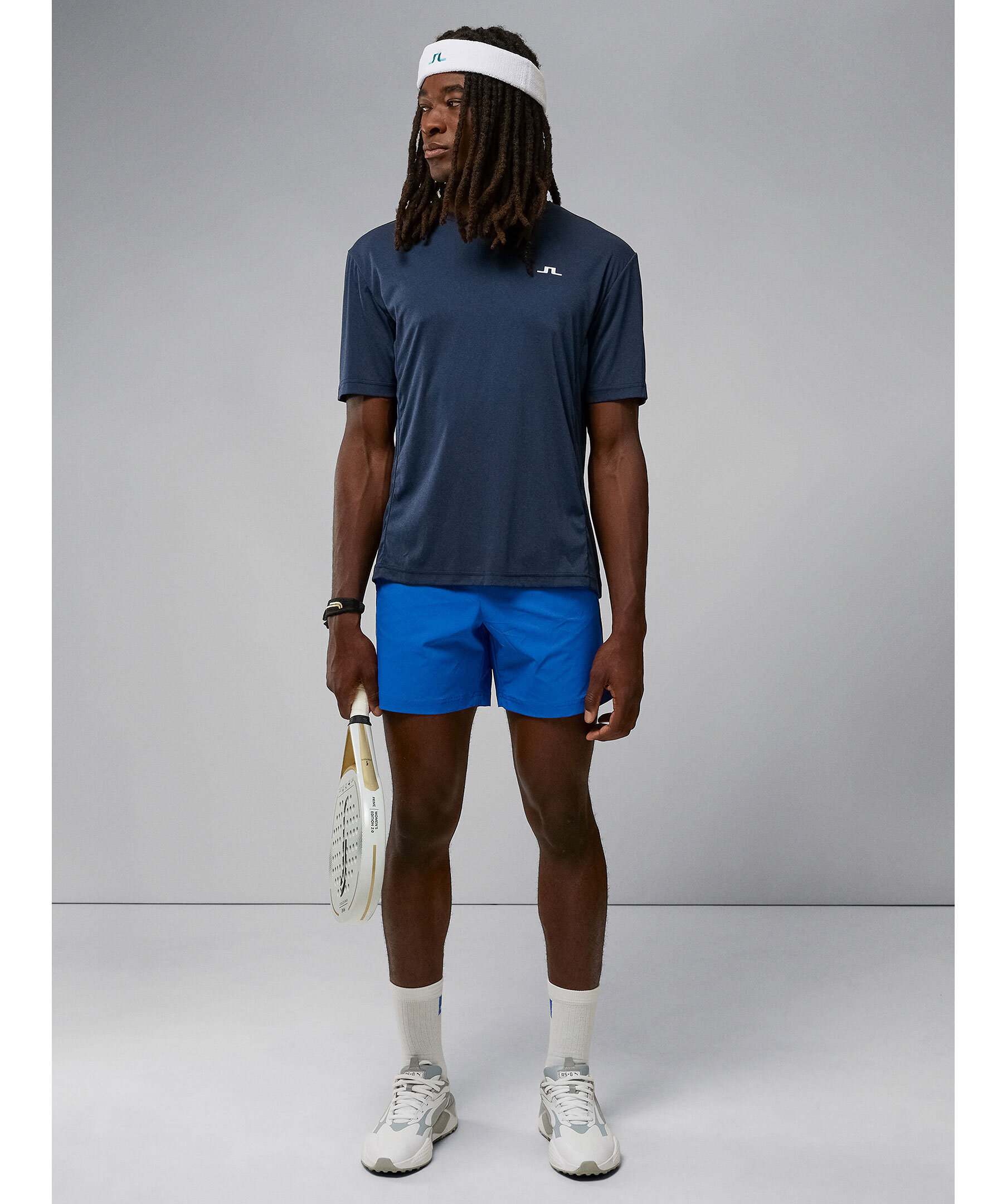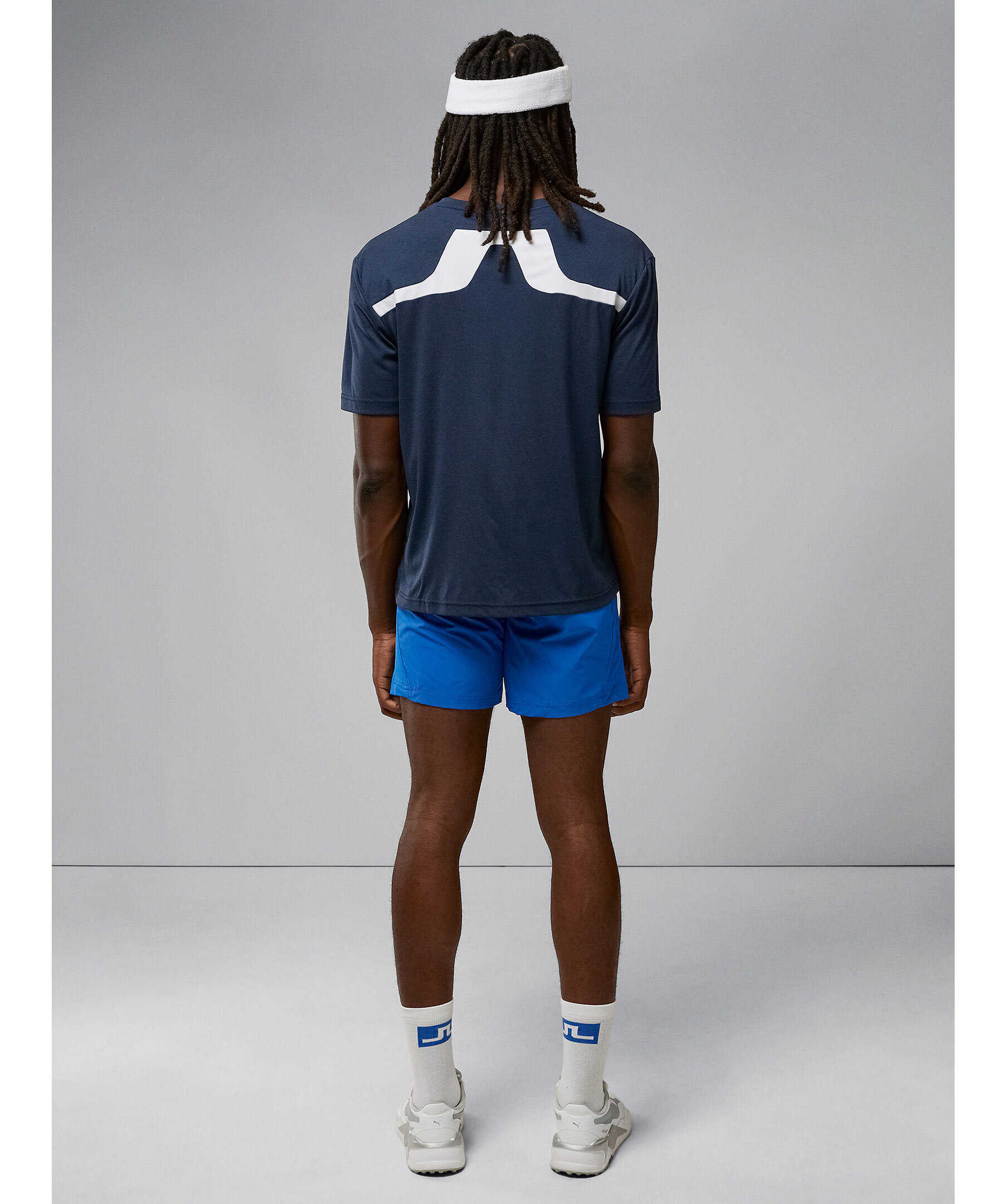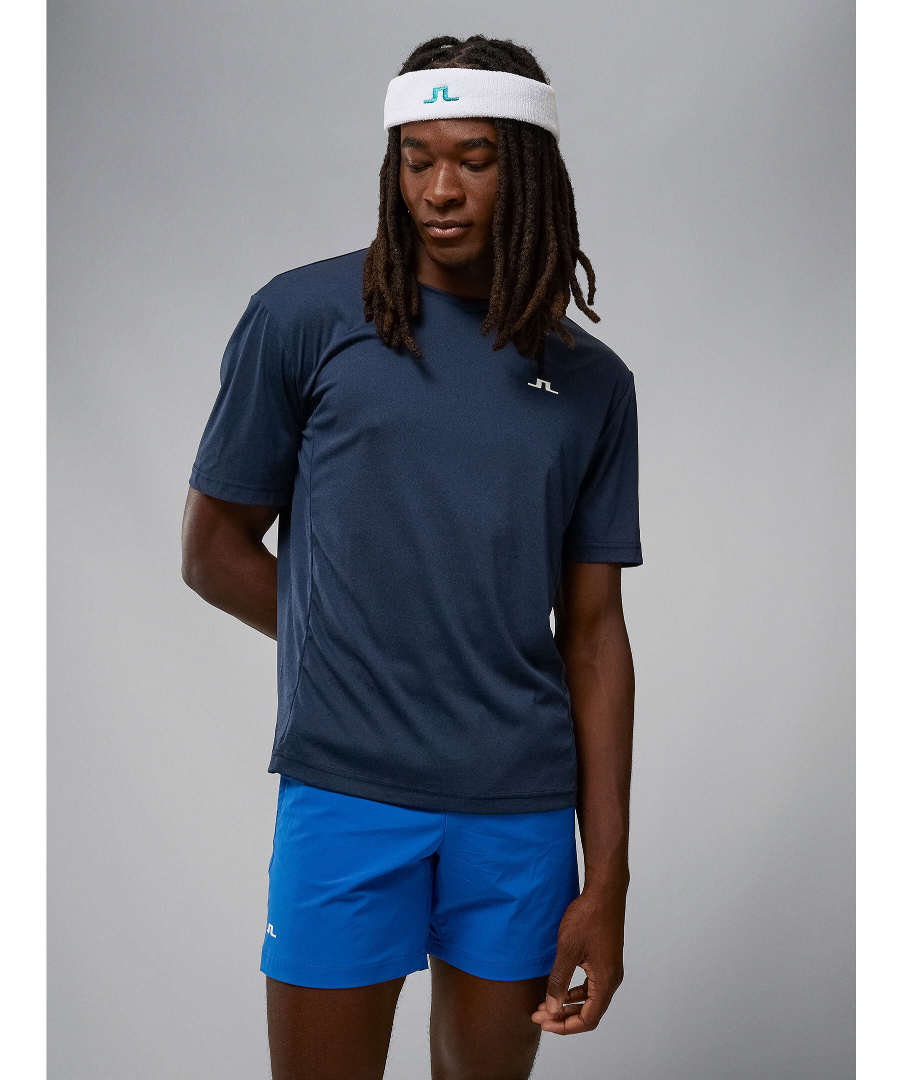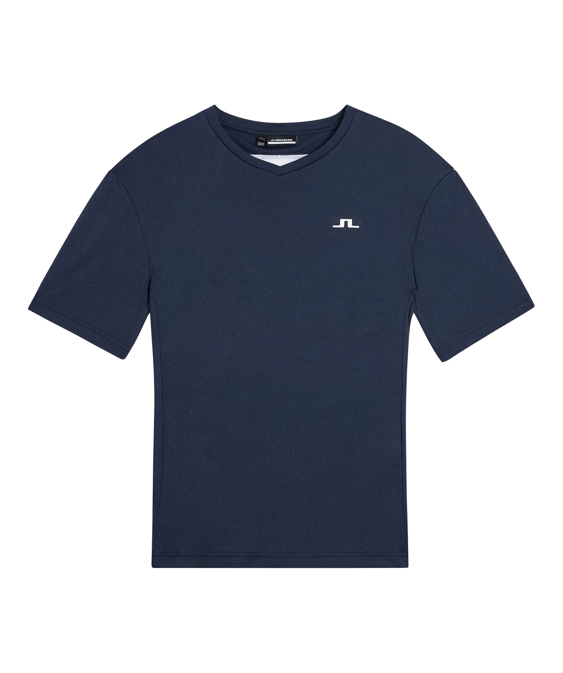 Marinblå t-shirt som är tillverkad av Featherwight Jersey från J.Lindeberg. Ett väldigt lätt material som är den ultimata sportöverdelen. Den har en v-ringad halsringning, en stor, sydd logotyp på den övre delen av baksidan och tryckt logotyp på bröstet. Fukttransporterande och snabbtorkande egenskaper, så att du kan fortsätta att se ut och känna dig så bra som möjligt under hela ditt träningspass.