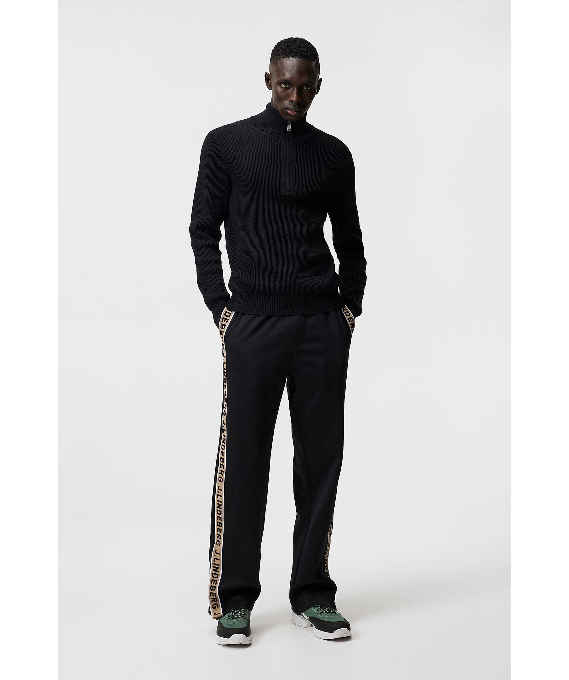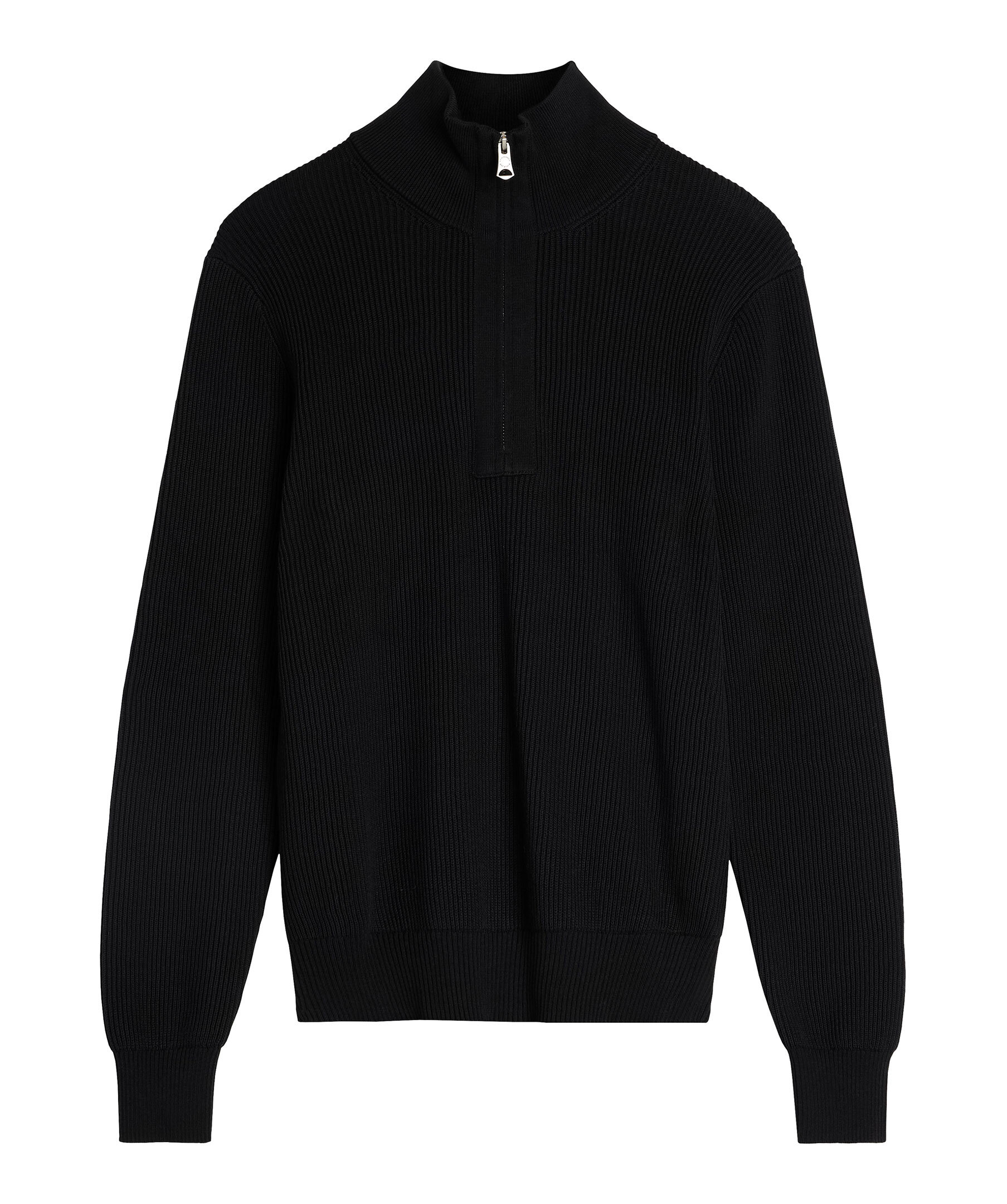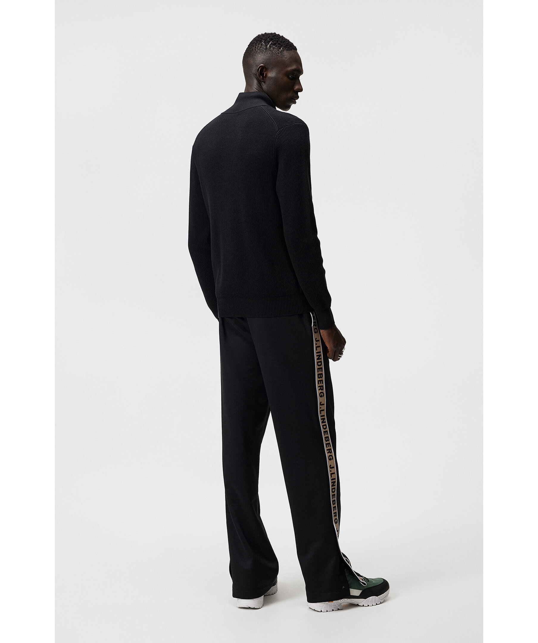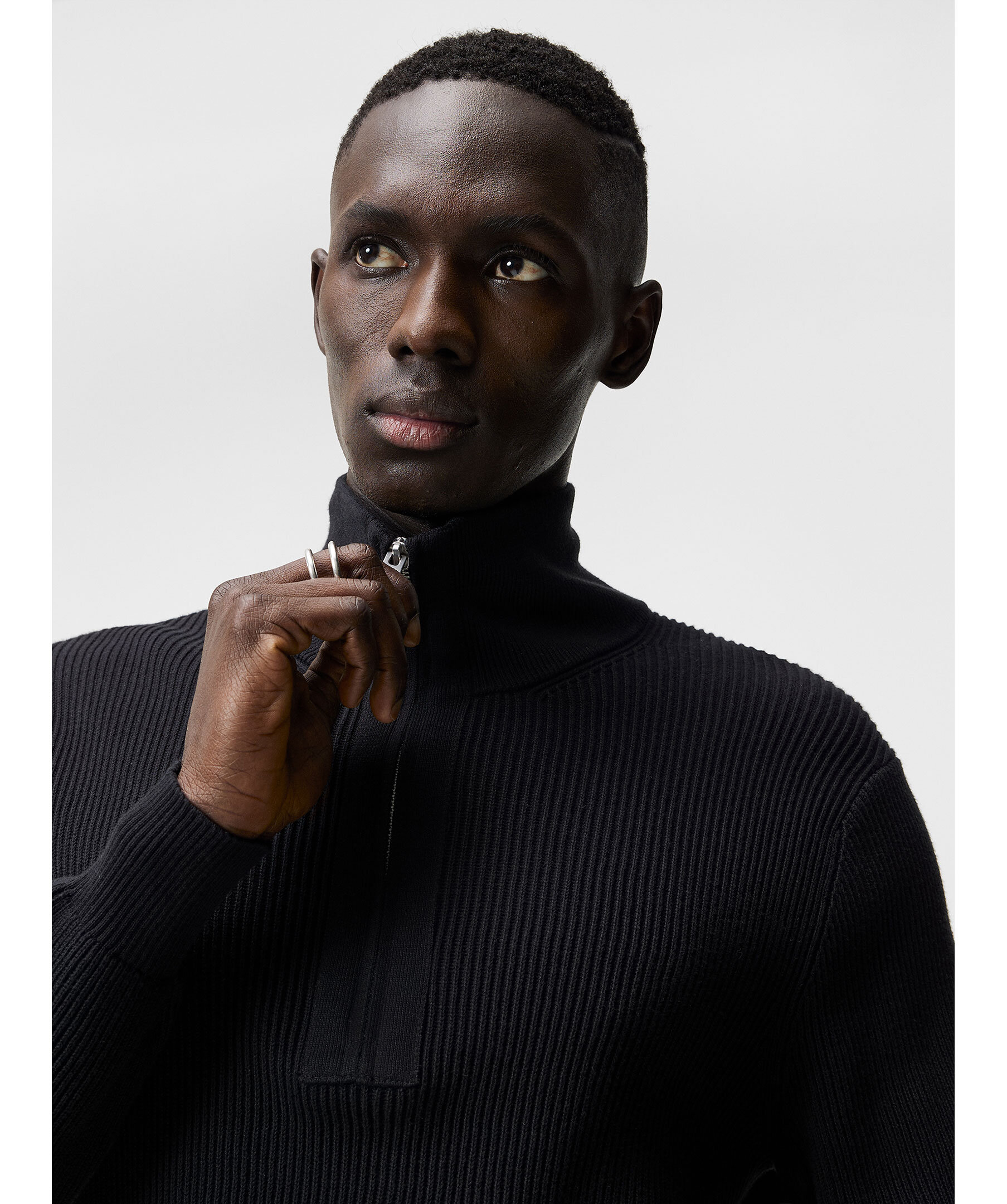 Svart ribbad half-zip från J Lindeberg. Ribbstickad krage, muddar vid ärm- och plaggslut. Tillverkad i 100% bomull. Ribbstickad krage, muddar vid ärm- och plaggslut.