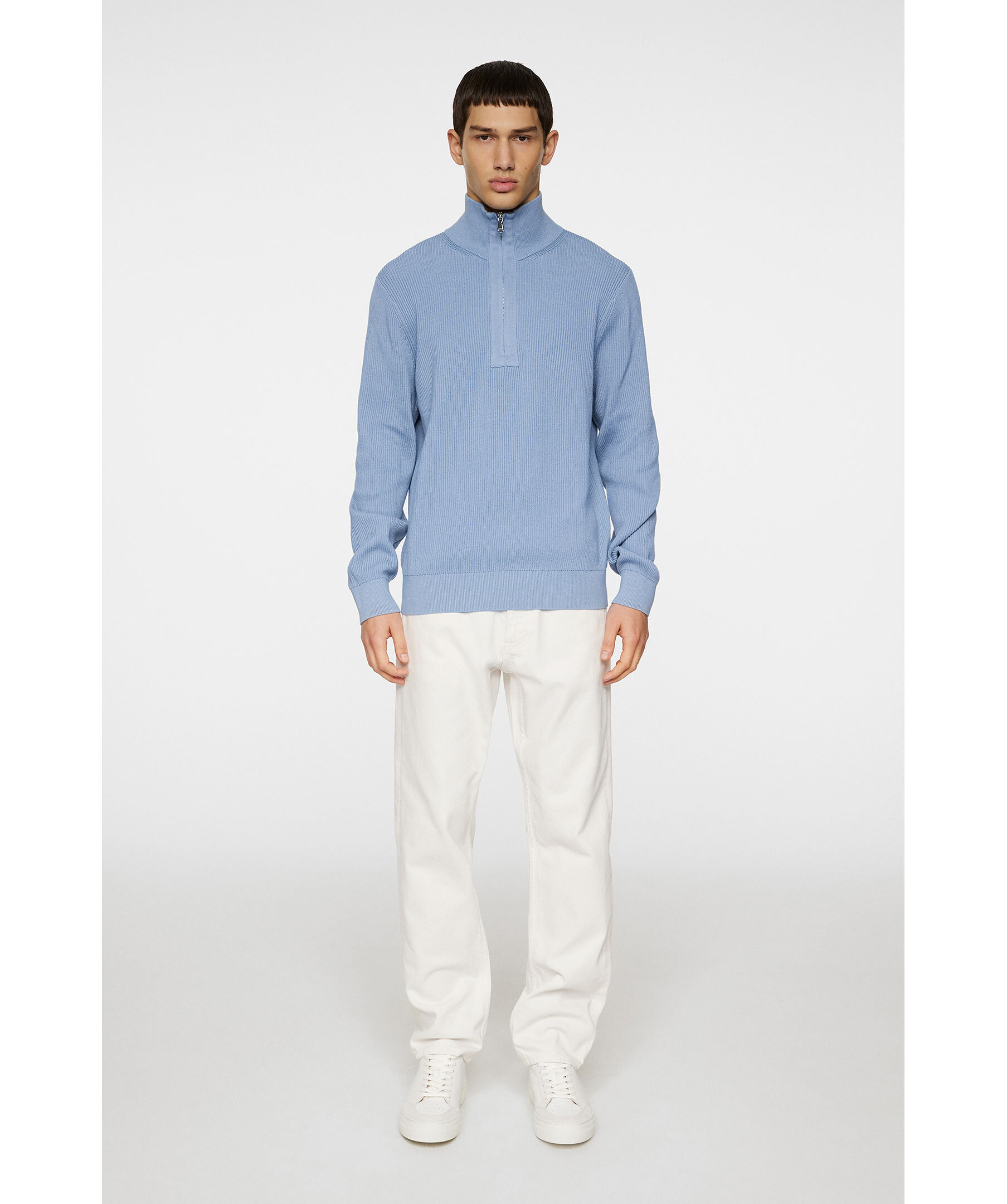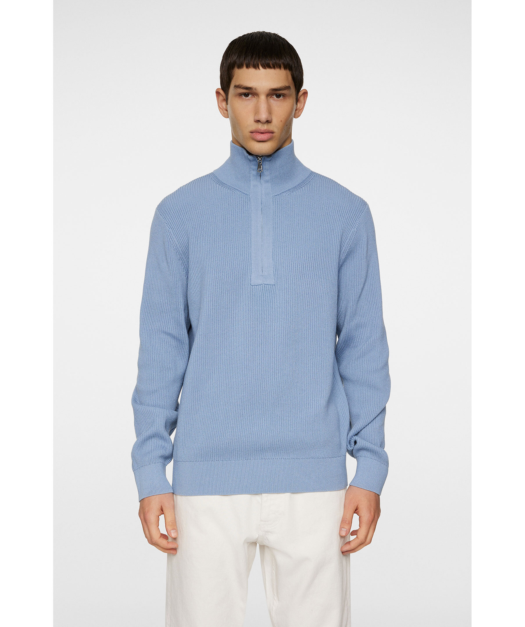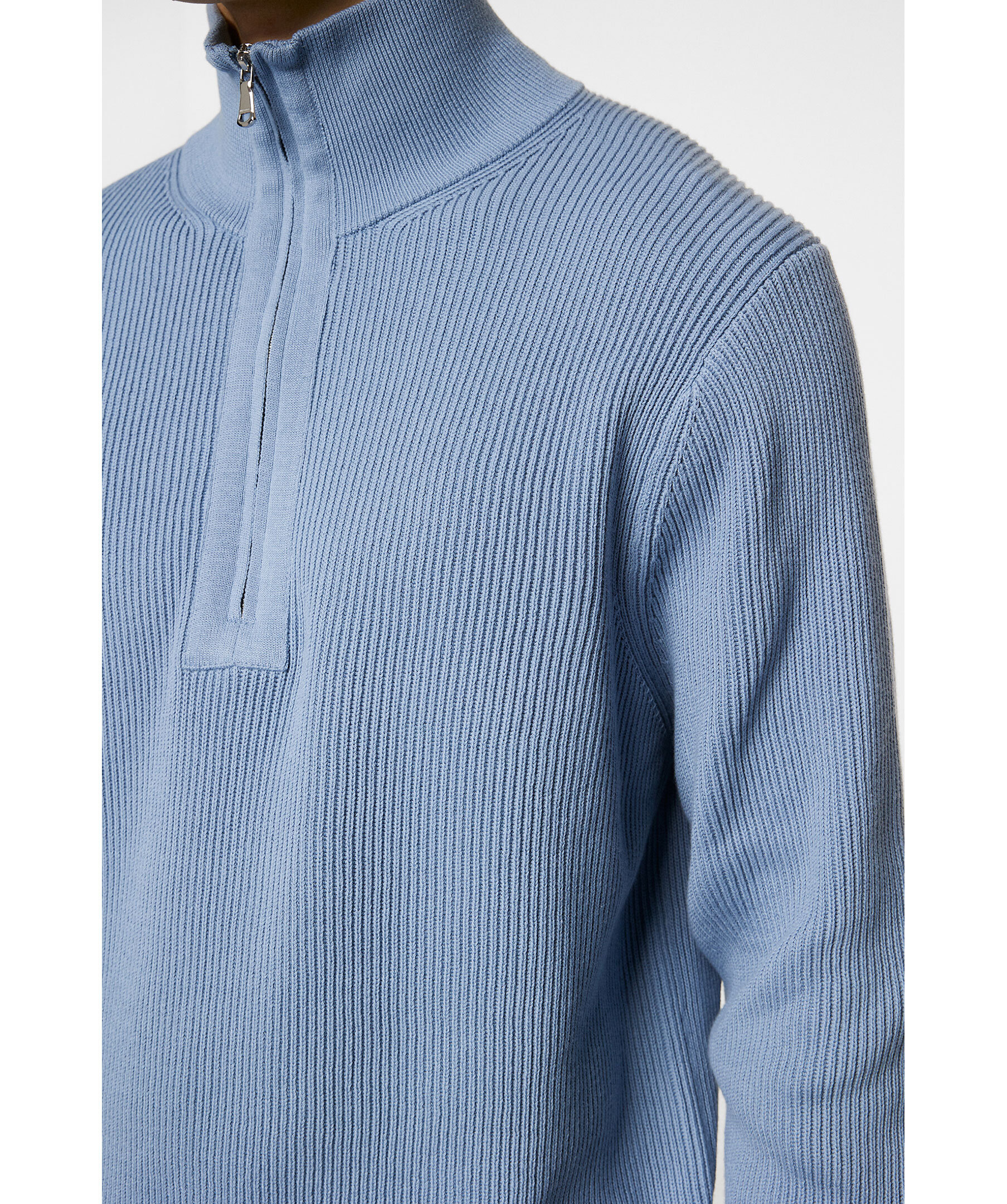 Duvblå, ribbstickad half-zip från J Lindeberg. Tillverkad i bomull.