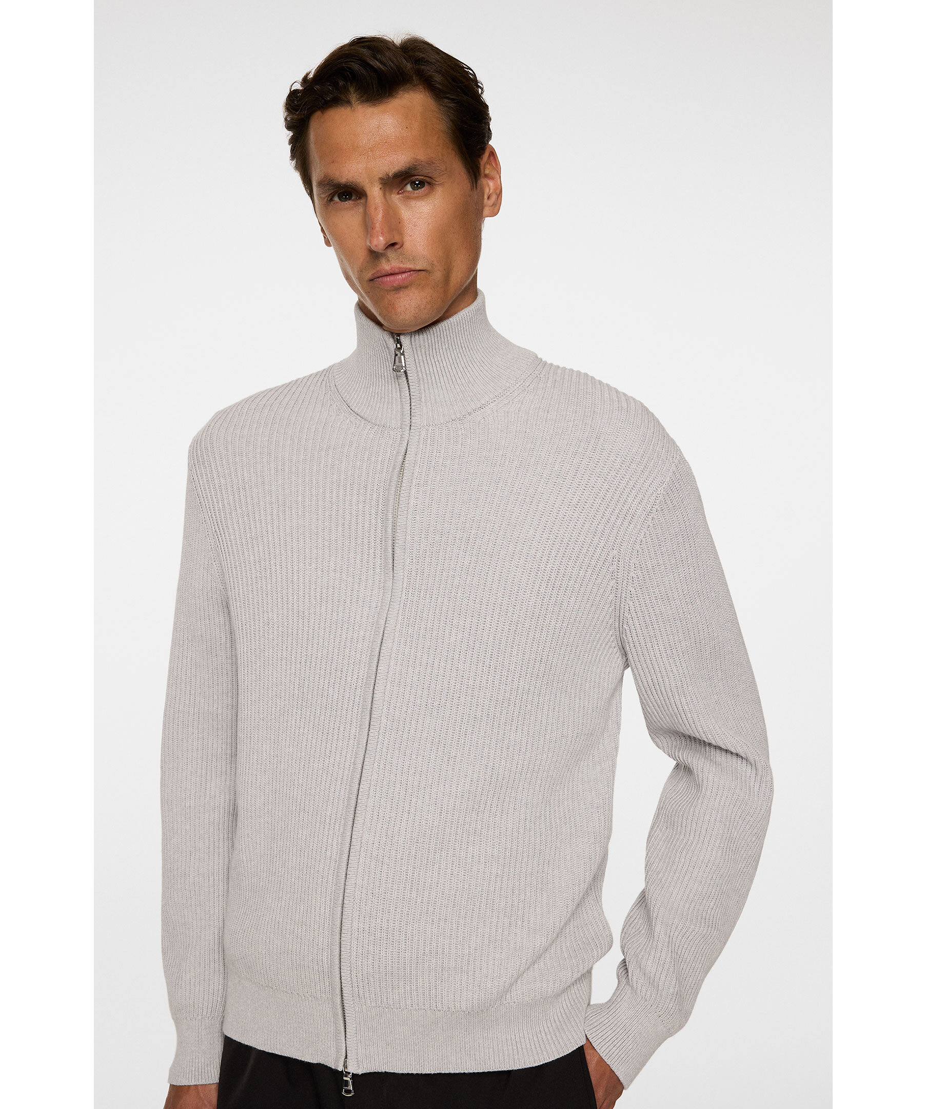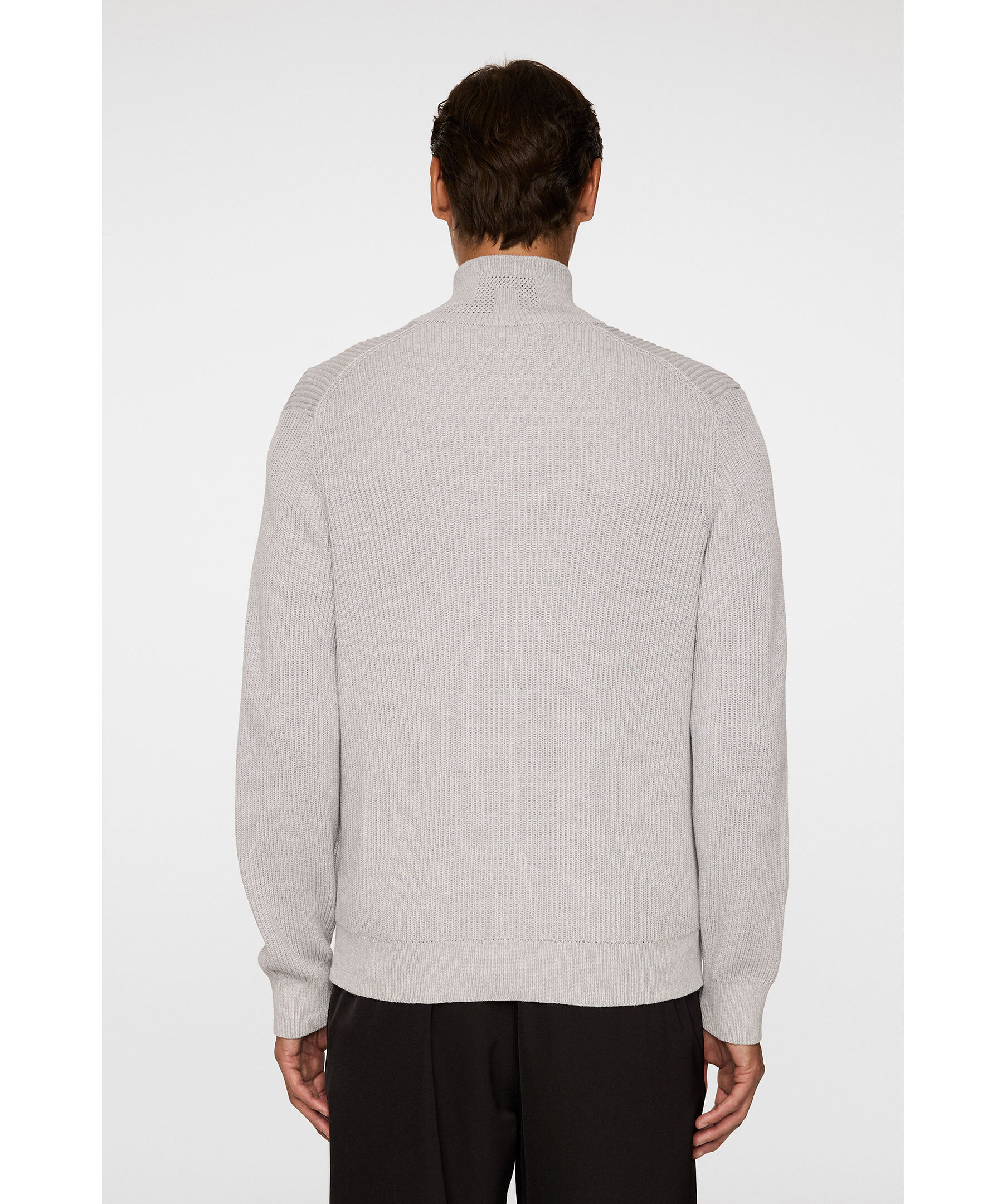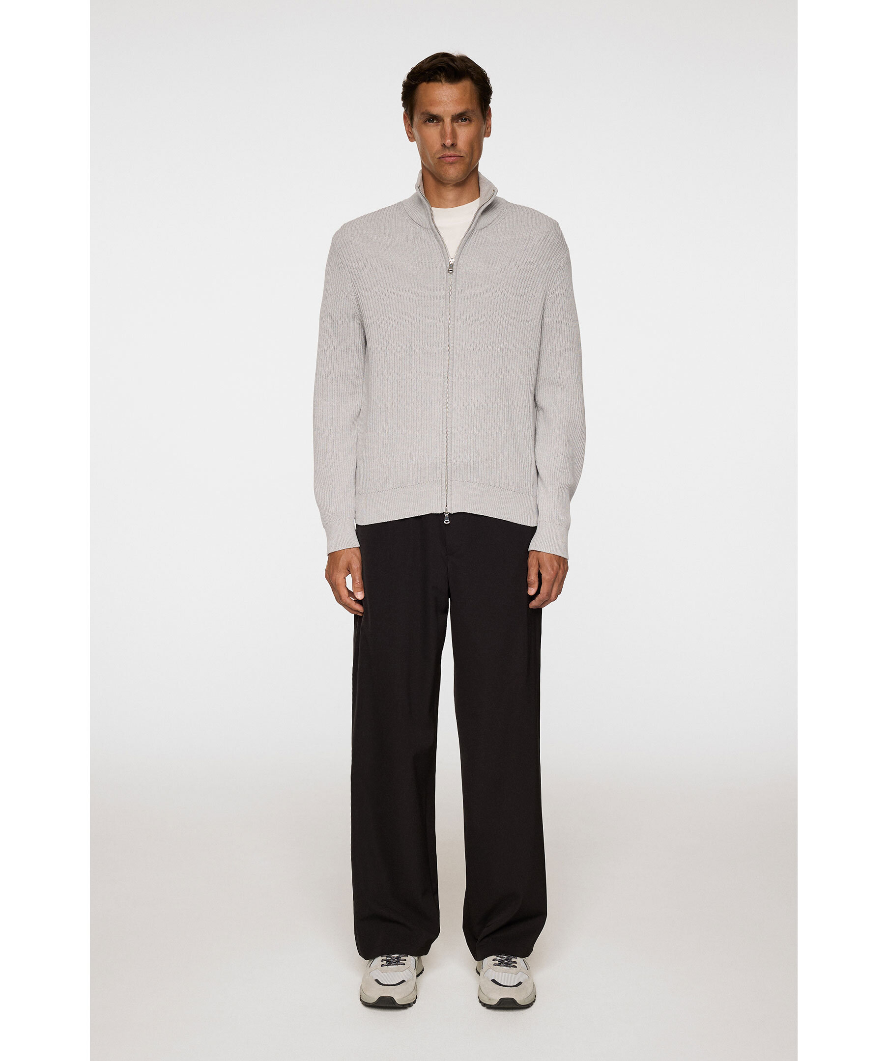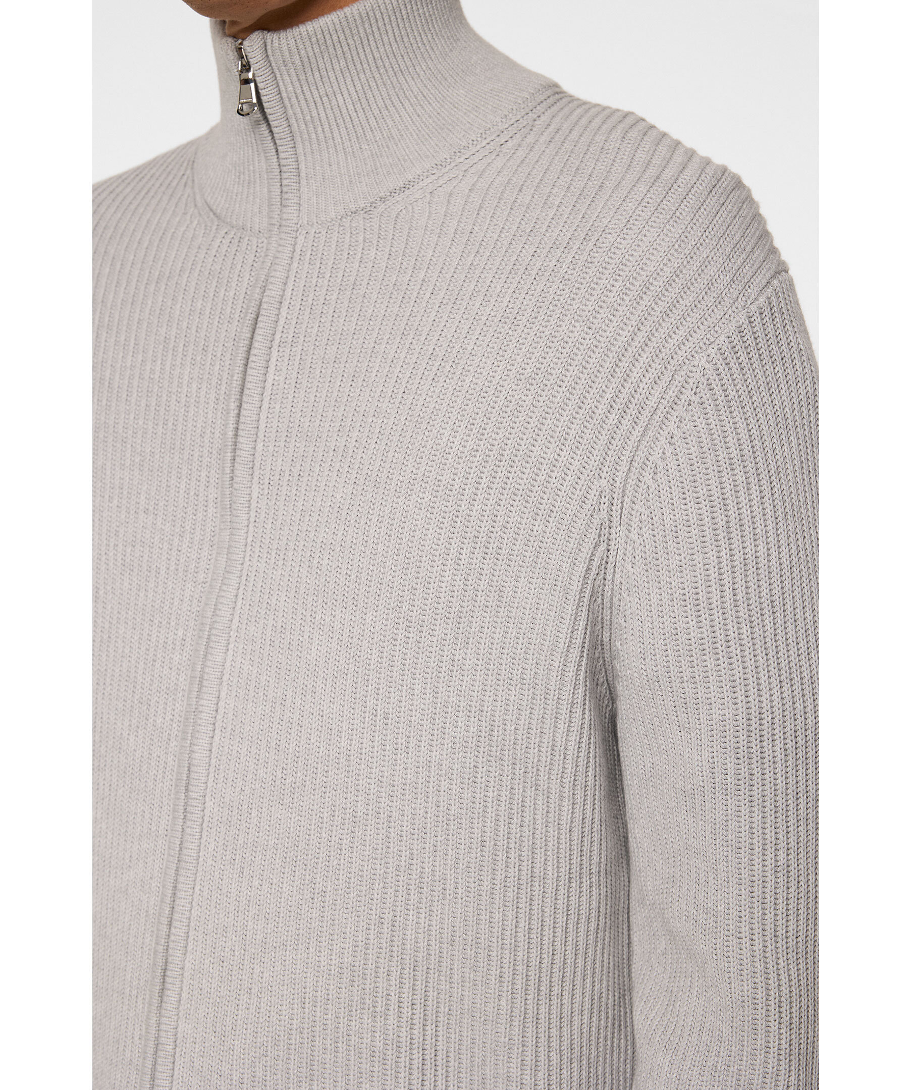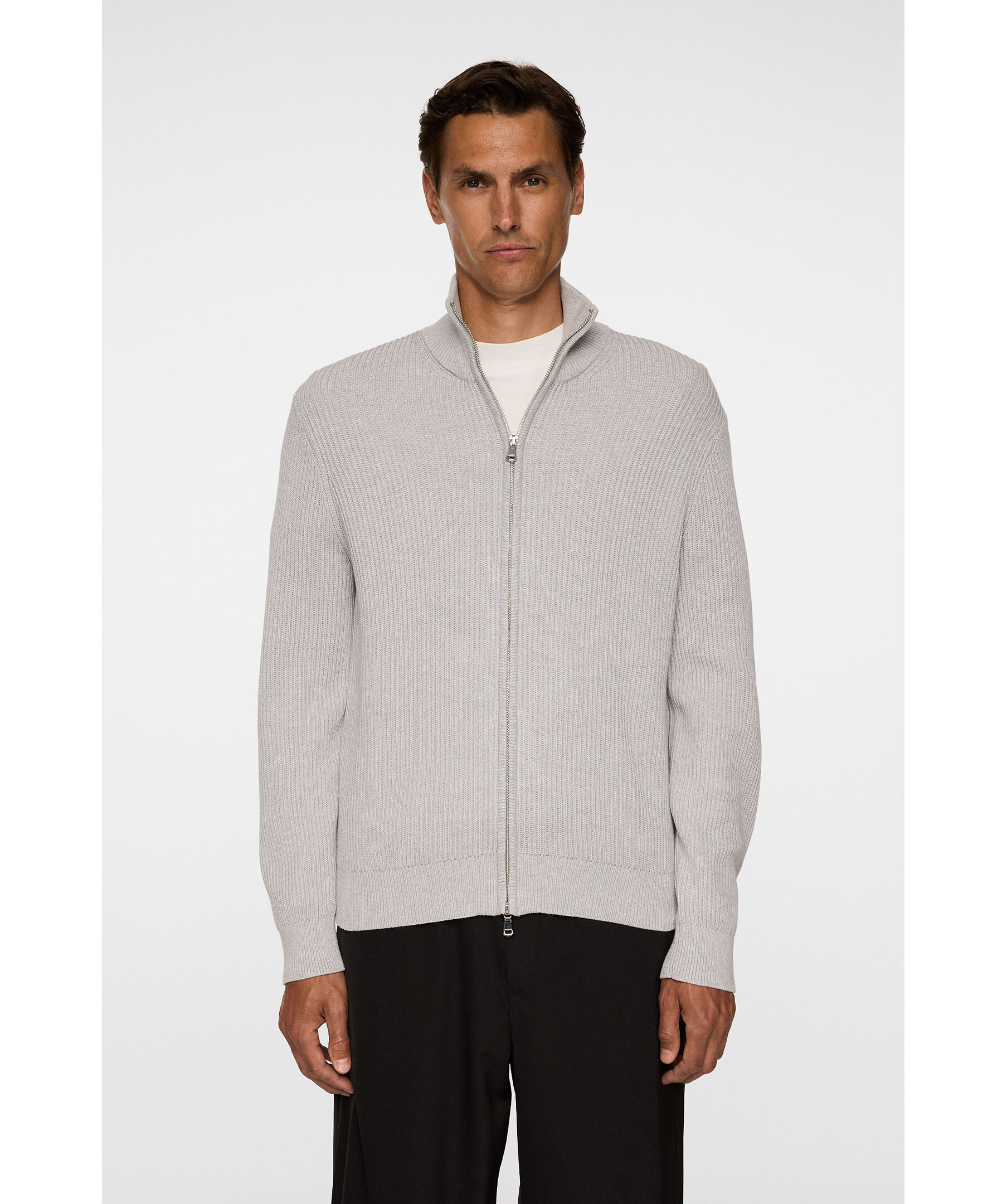 Ljusgrå stickad cardigan från J.Lindeberg. Tröjan har ribbstickade muddar, tvåvägsdragkedja och en omvänt stickad Bridge-logga baktill.