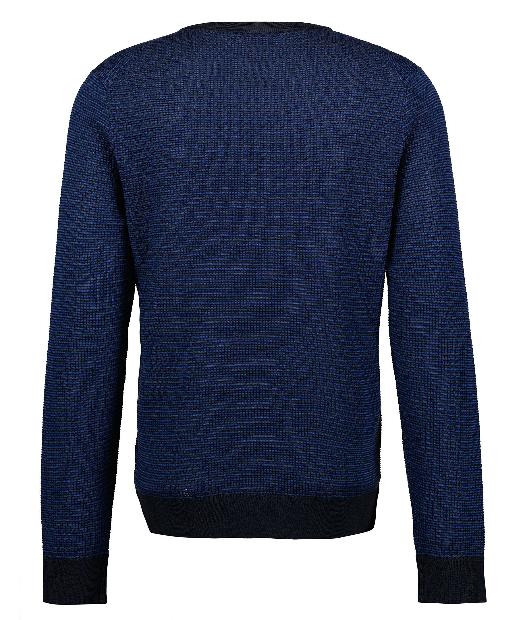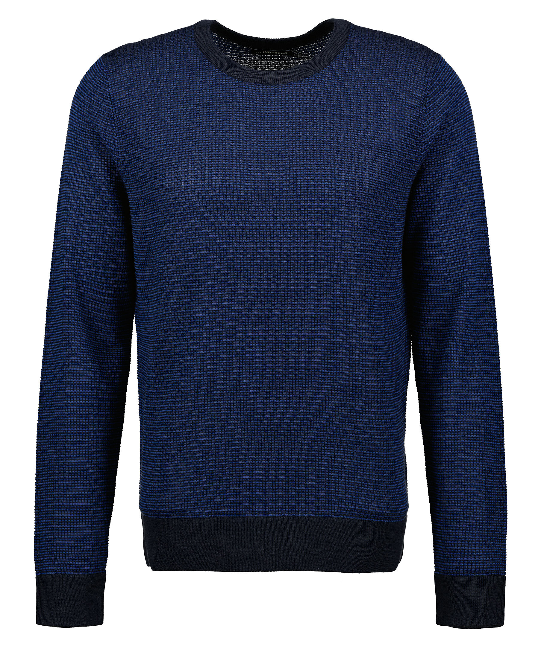 Svart och blå stickad tröja från J Lindeberg. Ribbstickade muddar i halsringning, ärm- och plaggslut. Rundad halsringning.