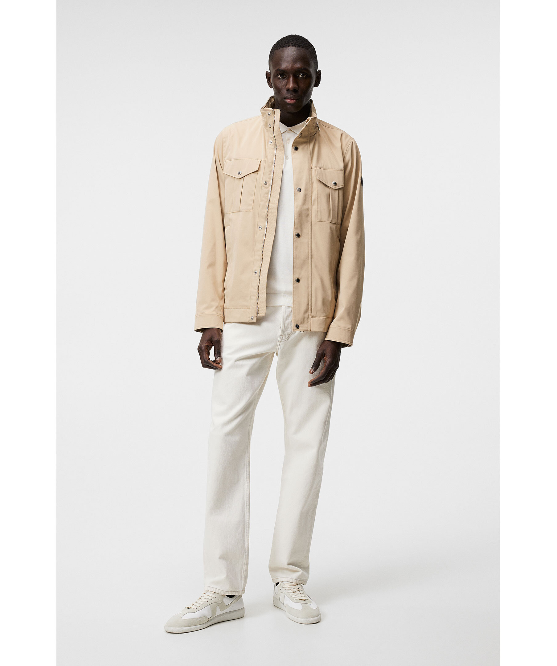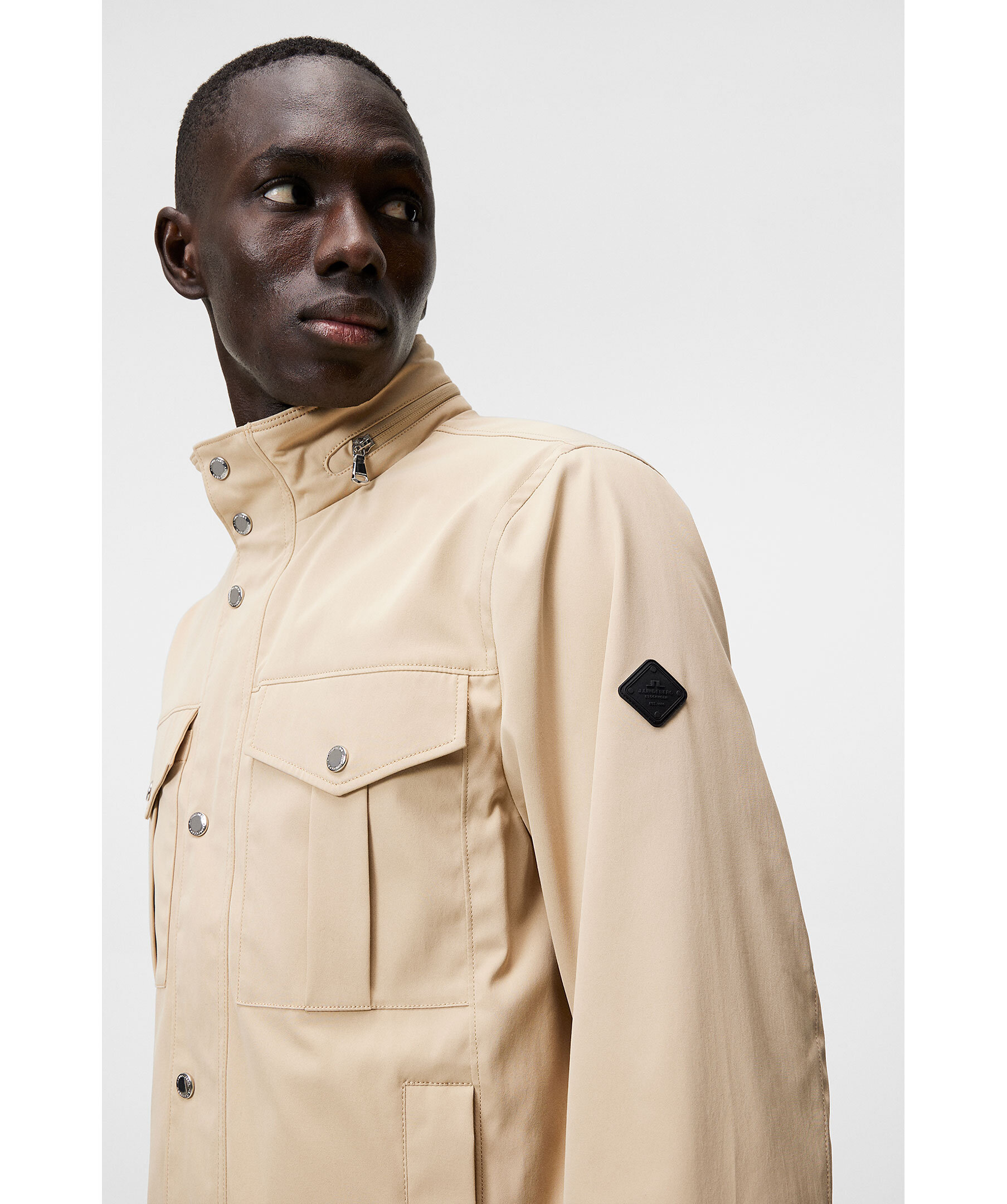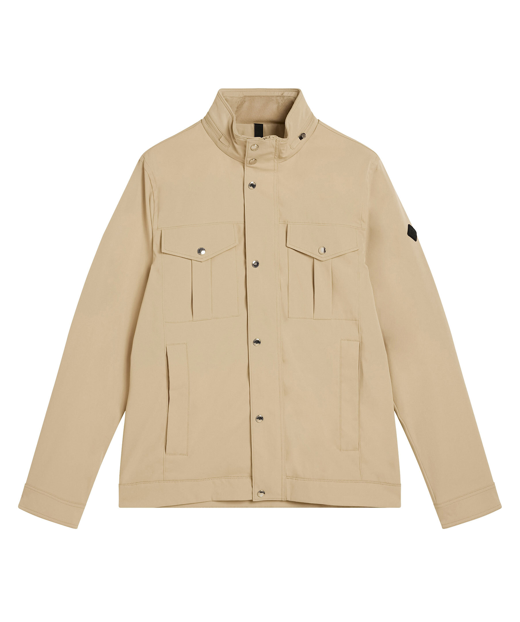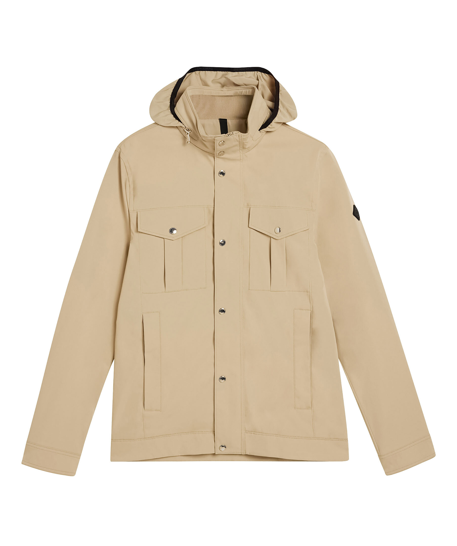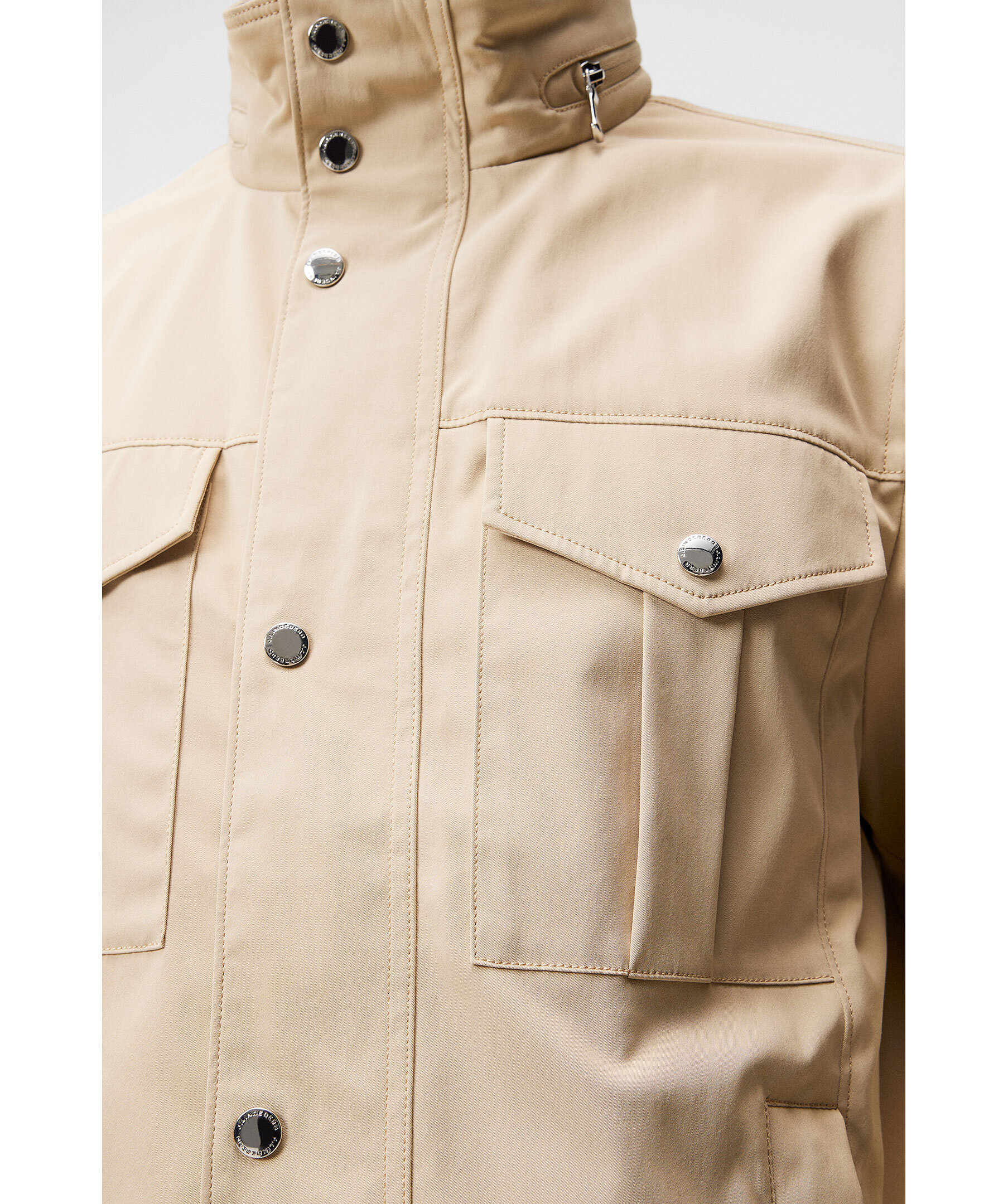 Beige jacka från J.Lindeberg med vattenavvisande yttre, tvåvägsdragkedja, knappslå och flertal praktiska fickor. Hög krage med uttagbar huva i kragen. Logotyp på ena ärmen. Tunt fodrad.