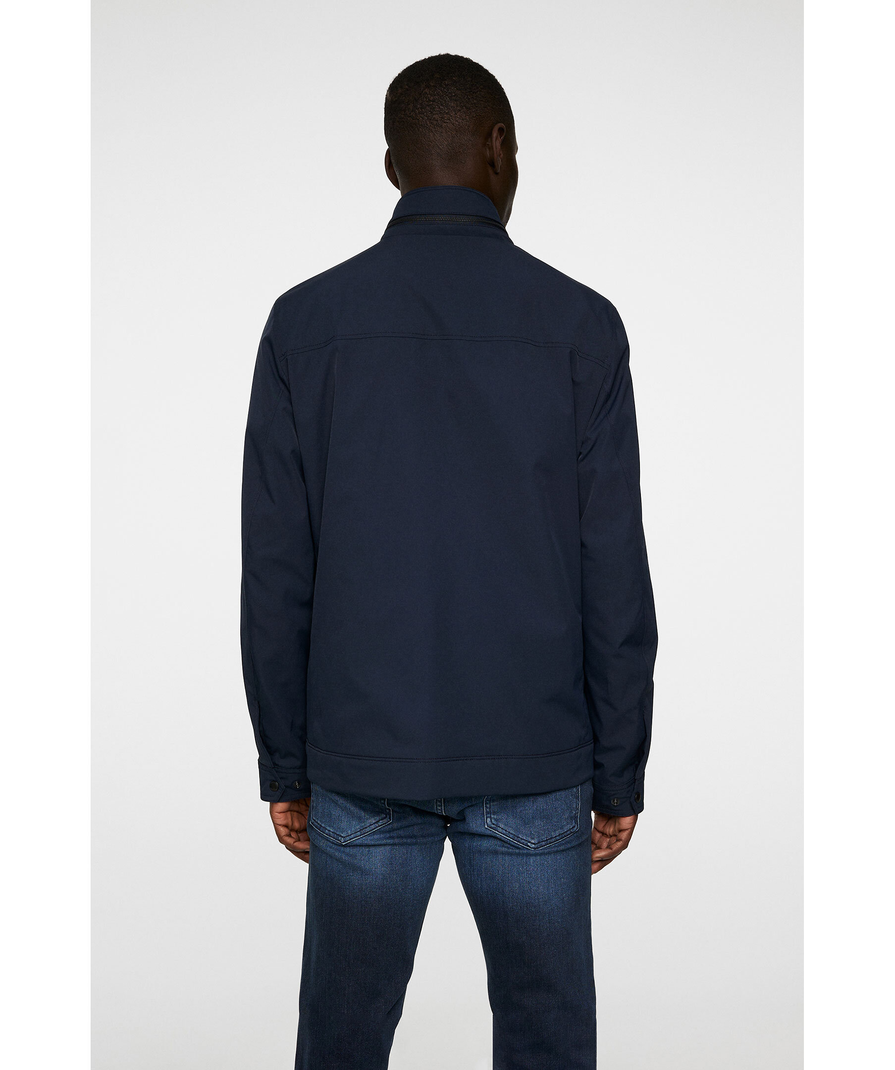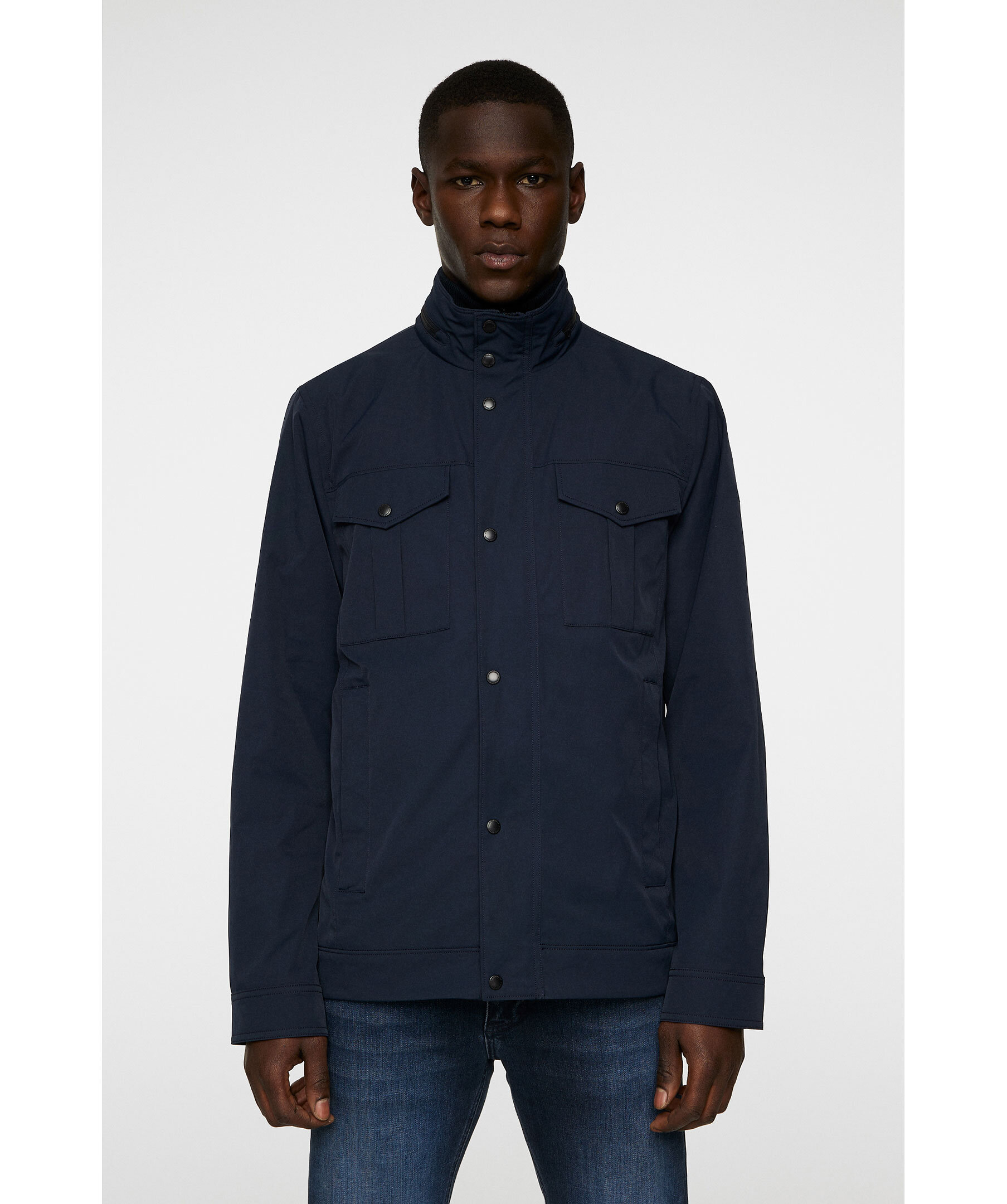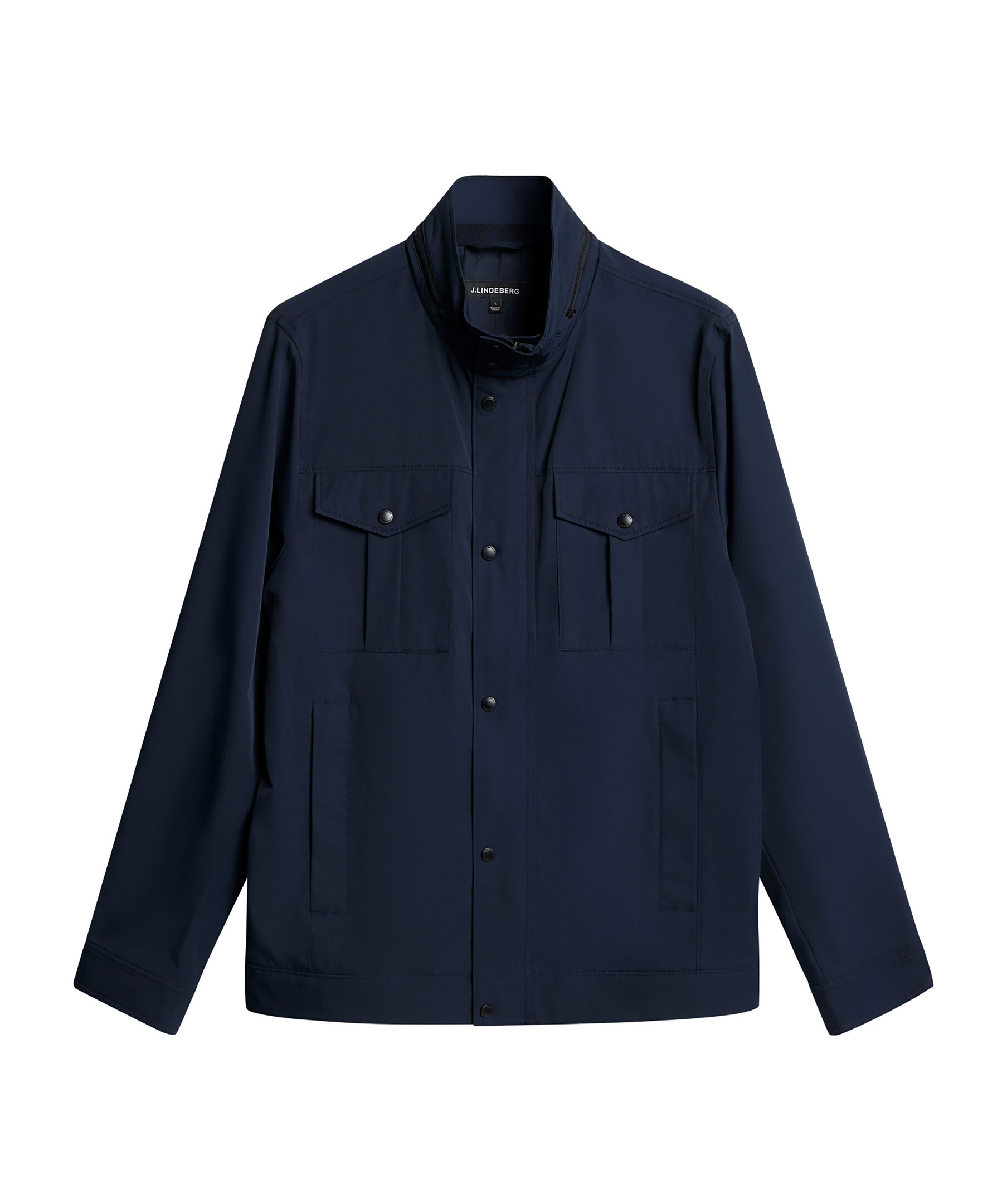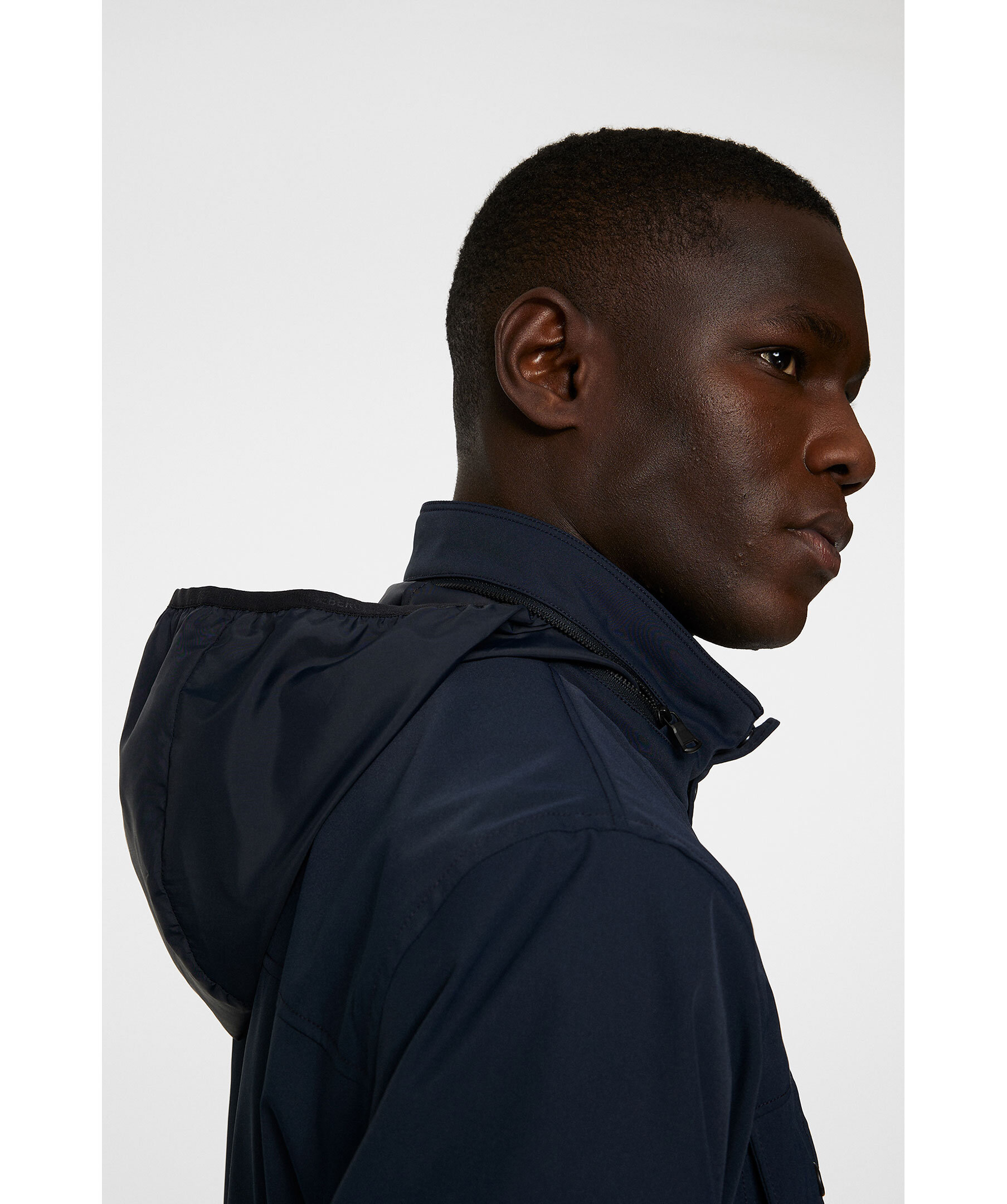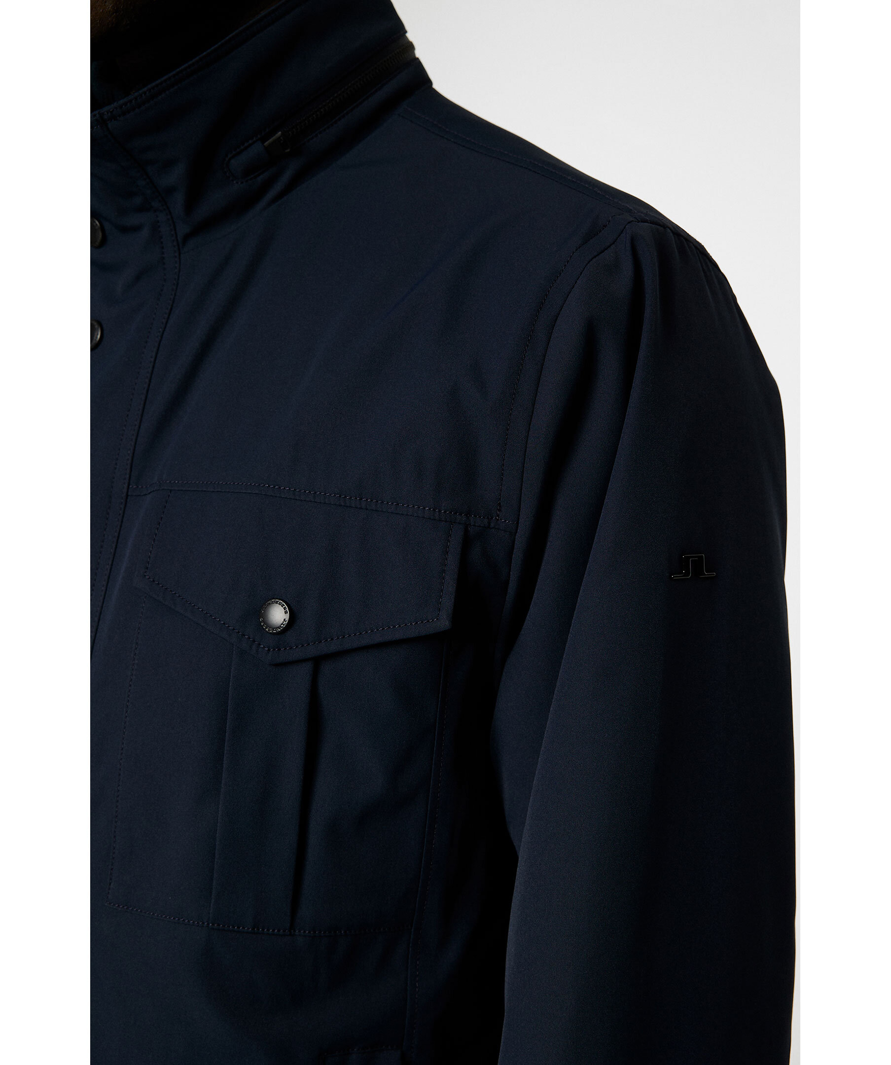 Mörkblå jacka från J Lindeberg. Jackan är vattenavvisande har bröstfickor med lock som stängs med tryckknappar, framfickor med dragkedja. Jackan har en huva som går att stoppa in i kragen. Tillverkad av polyester.