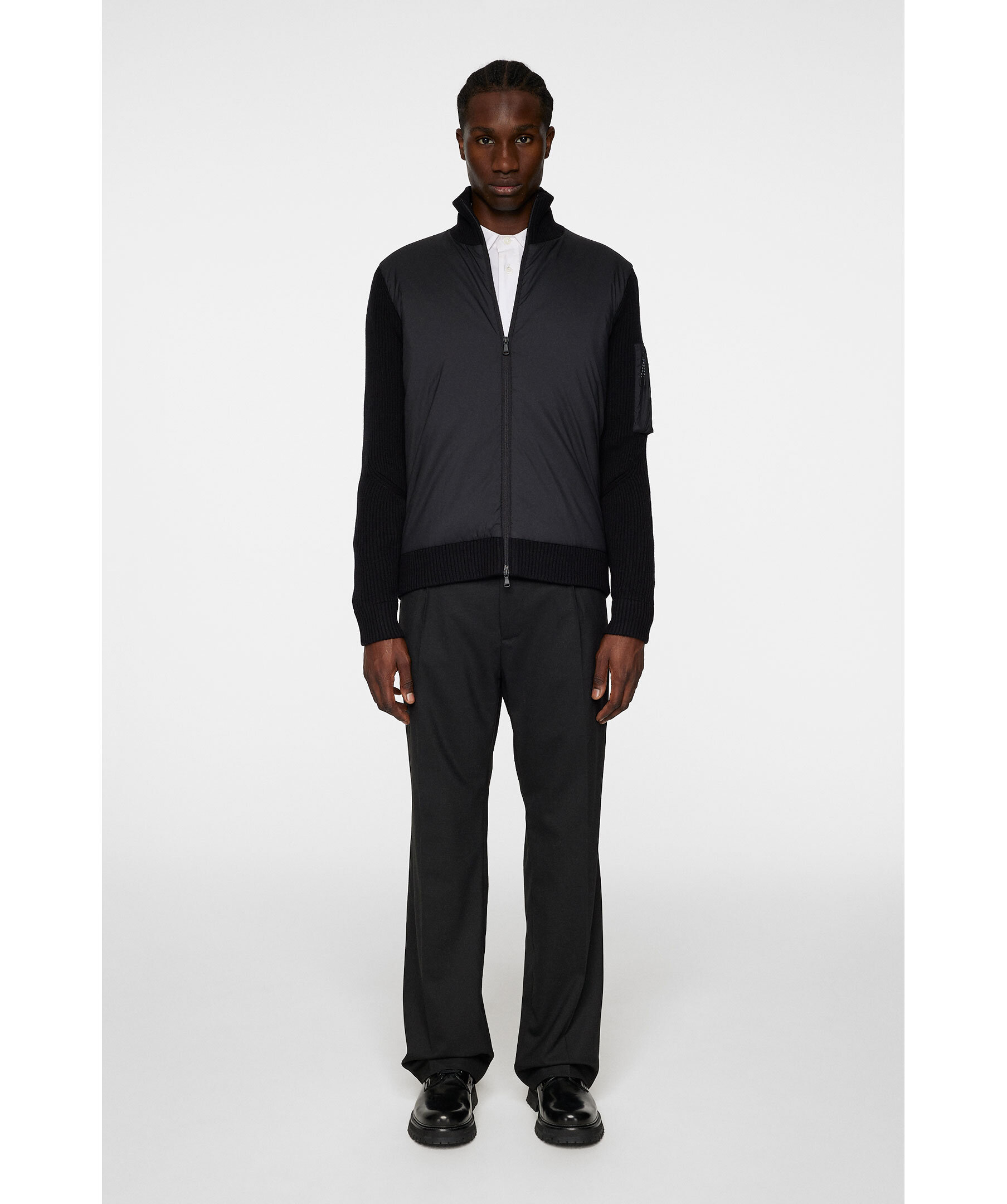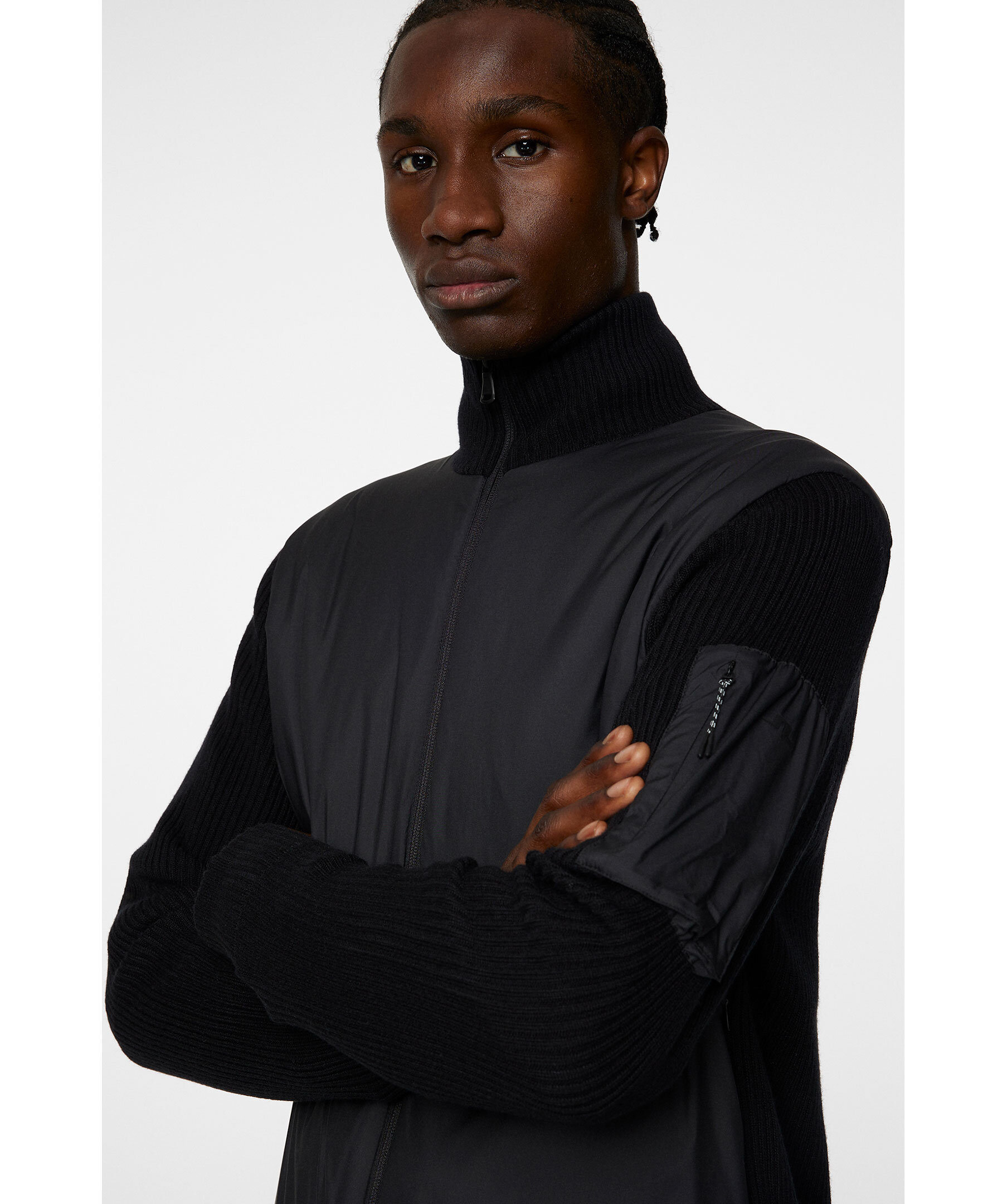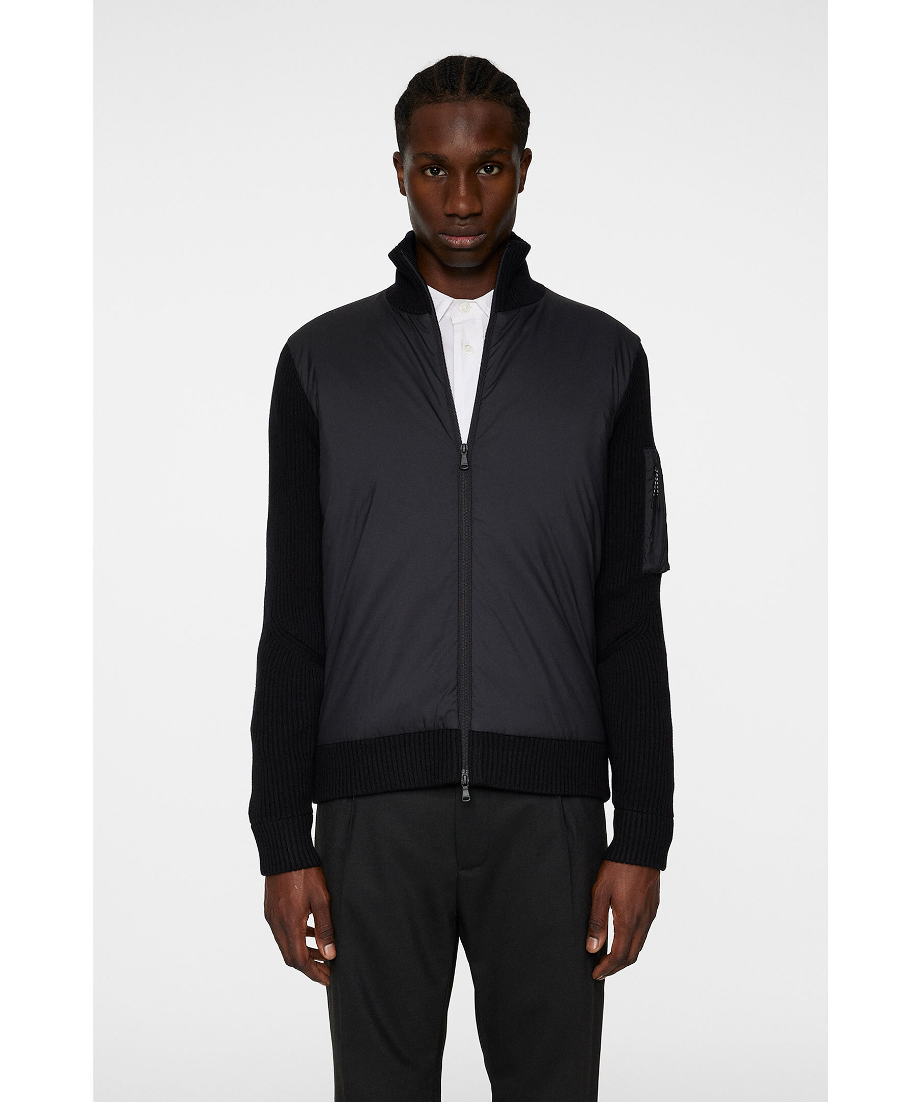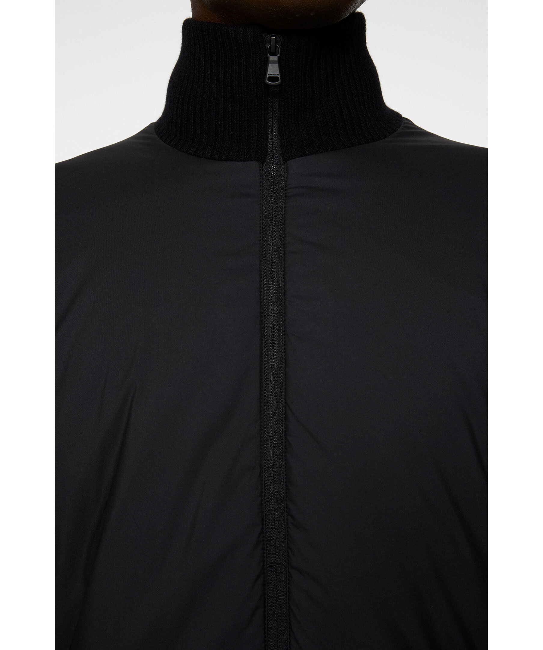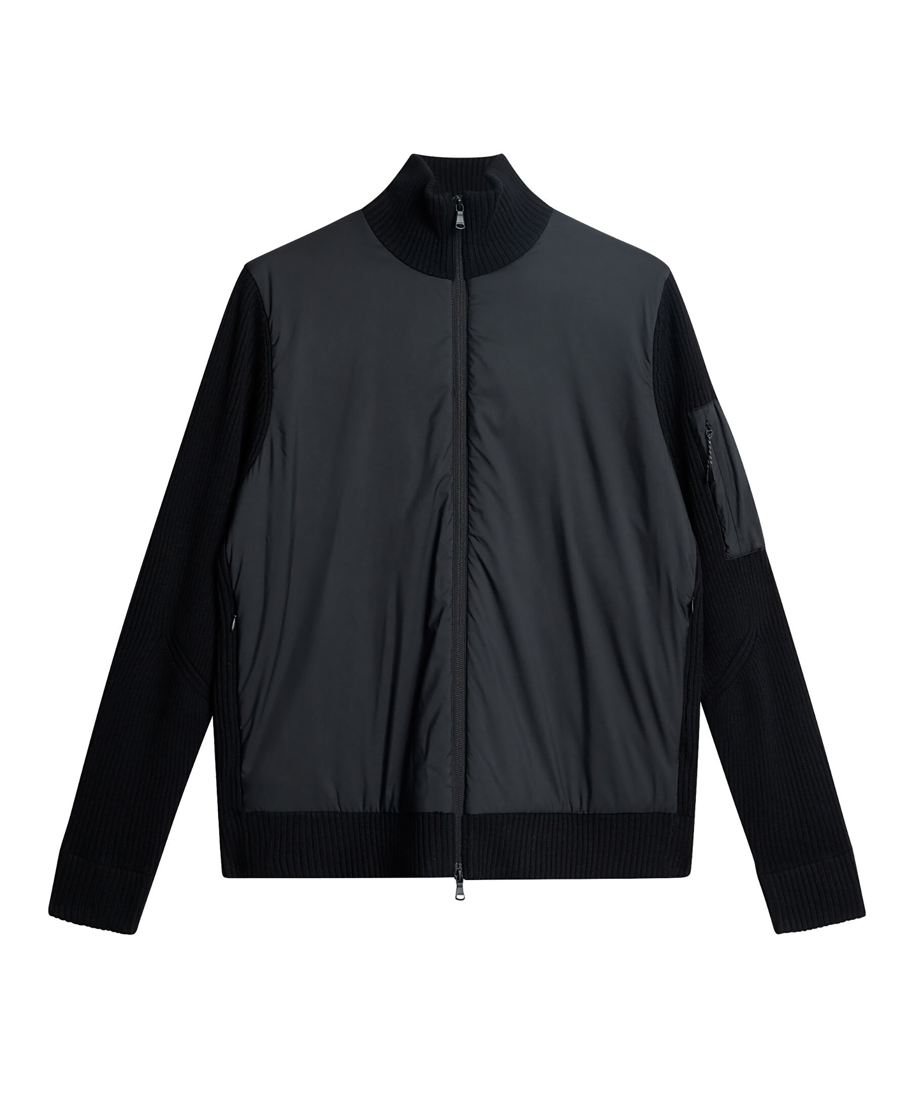 Svart hybrid jacka från J.Lindeberg. Jackan är vadderad med nylon framtill och ribbstickning i ullblandning på ärmarna och baksidan. Vänster arm pryds med en nylonficka med dragkedja och logotyp, och en tvåvägsdragkedja framtill kompletterar detaljerna.
