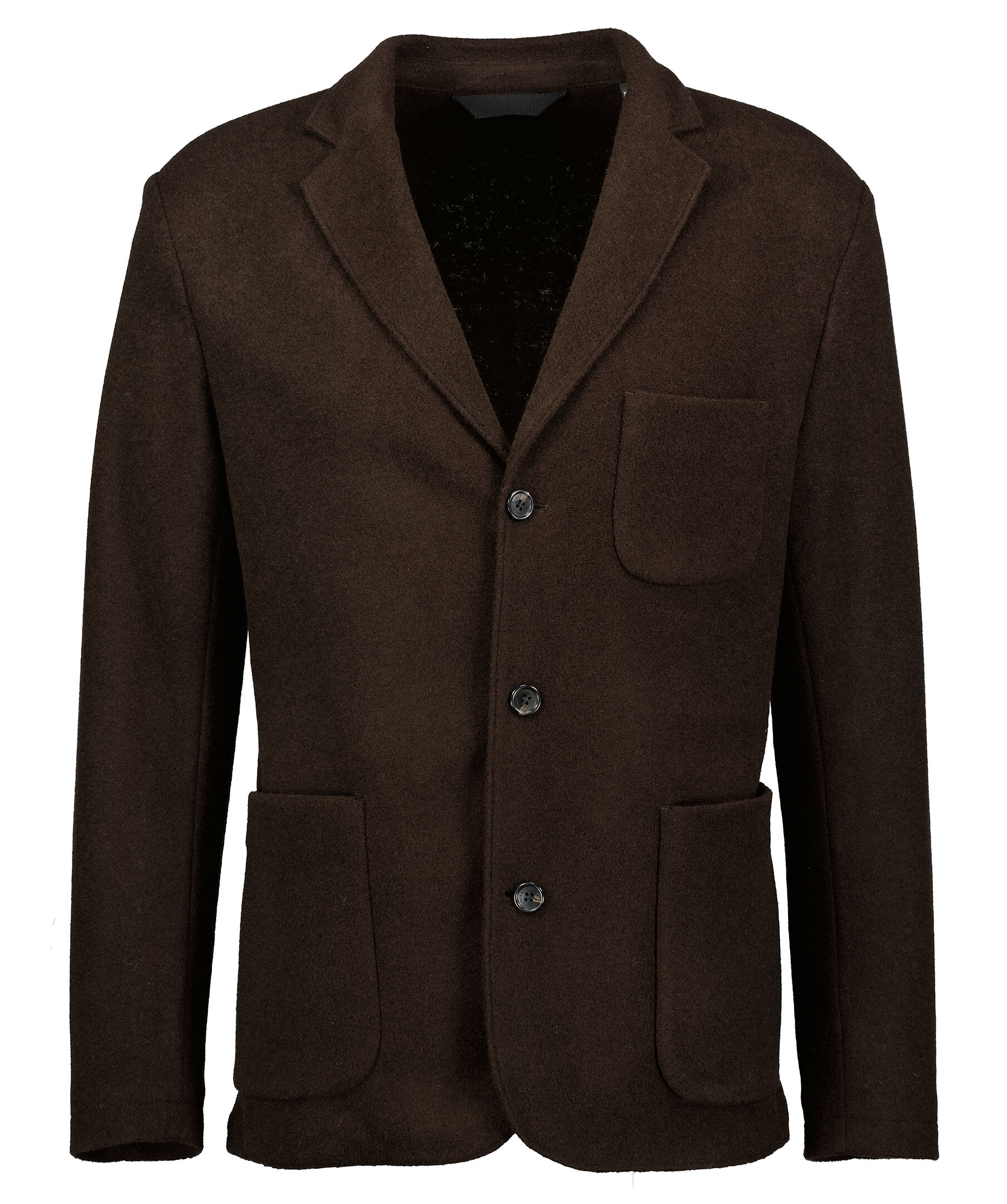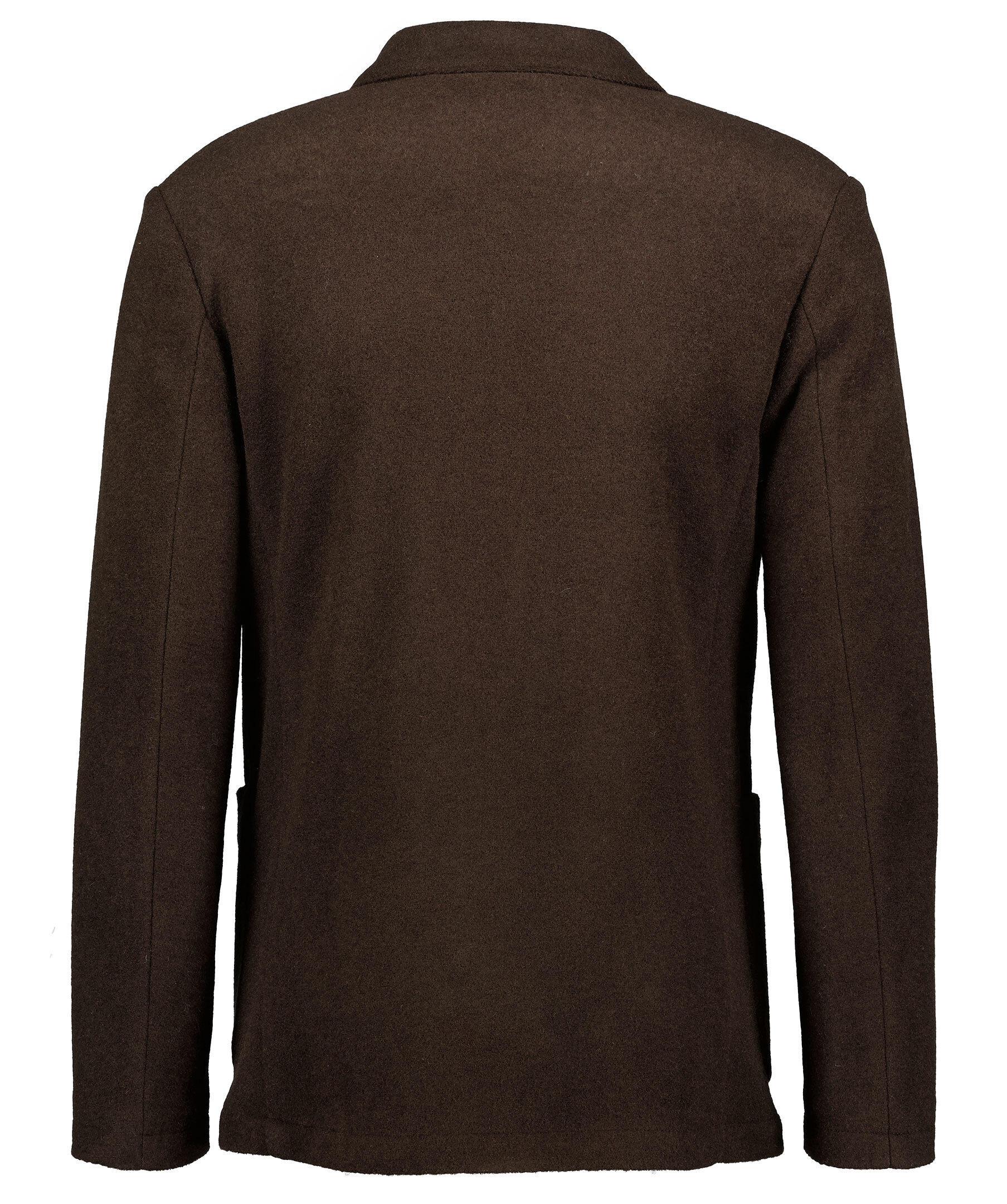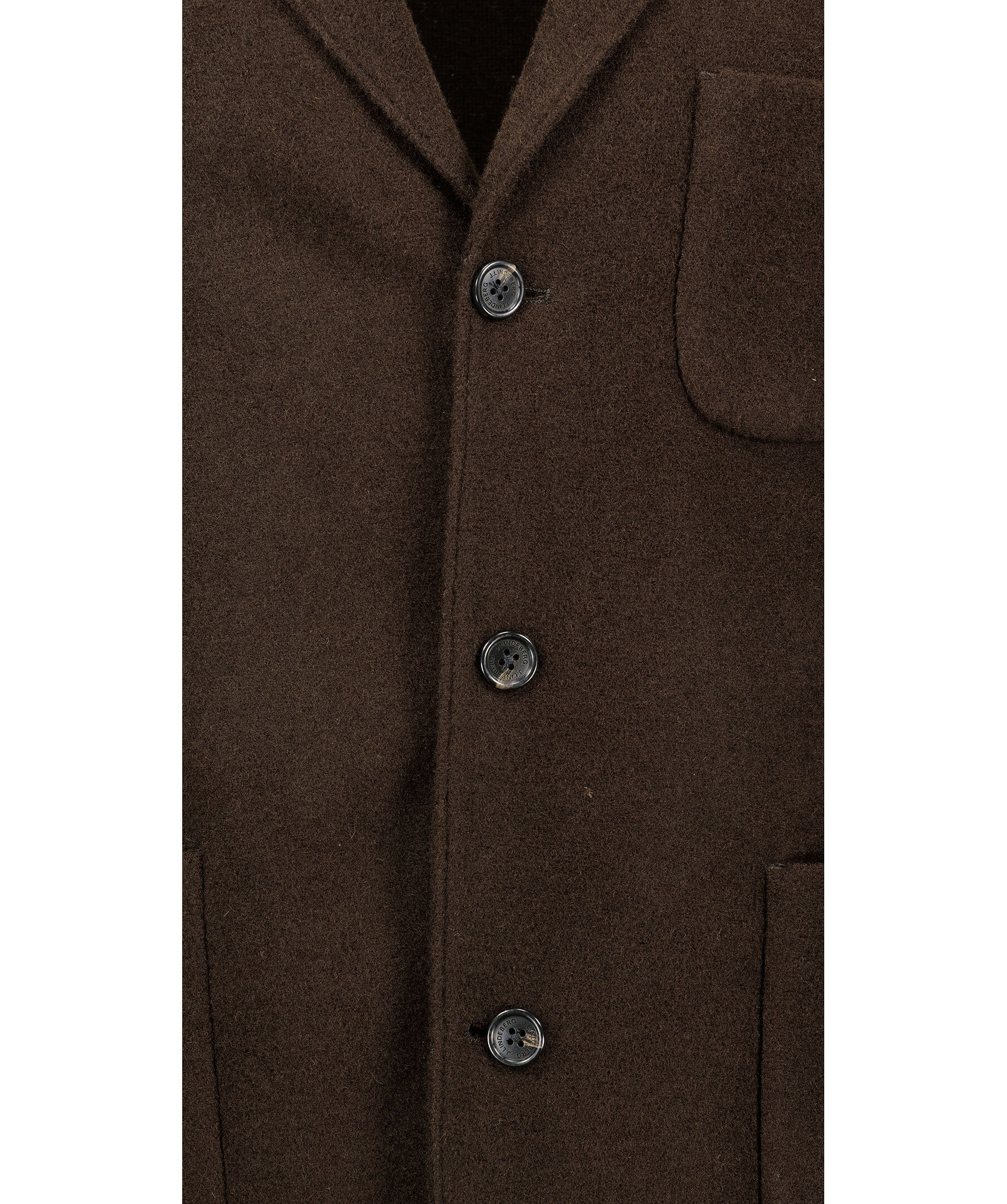 Mörkbrun kavaj från J.Lindeberg är gjord i en lättviktig ullblandning. Trubbiga slag, en innerficka, två framfickor och en bröstficka. Normal passform och knäpps med knappar framtill. Ofodrad.