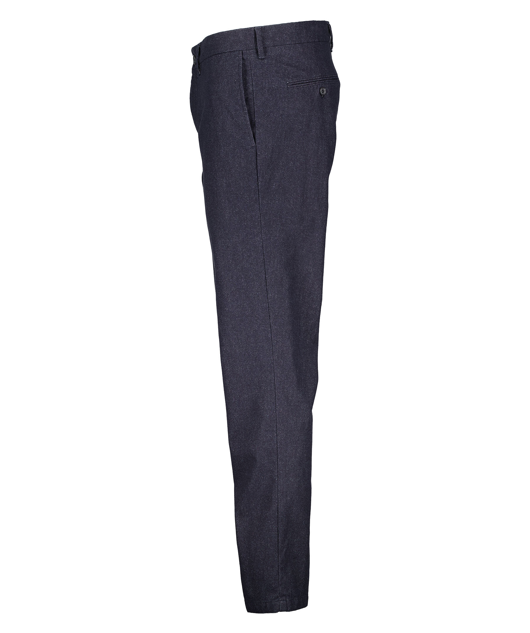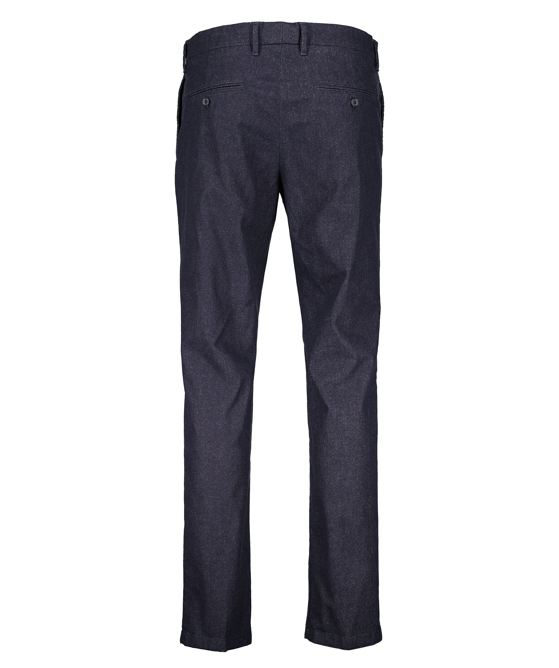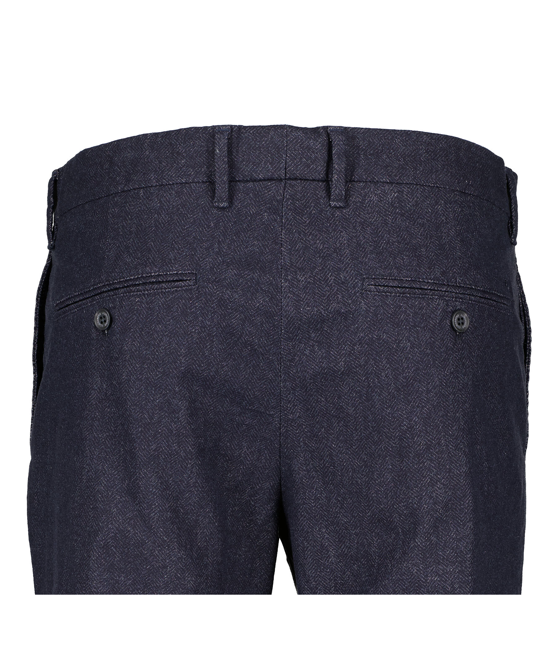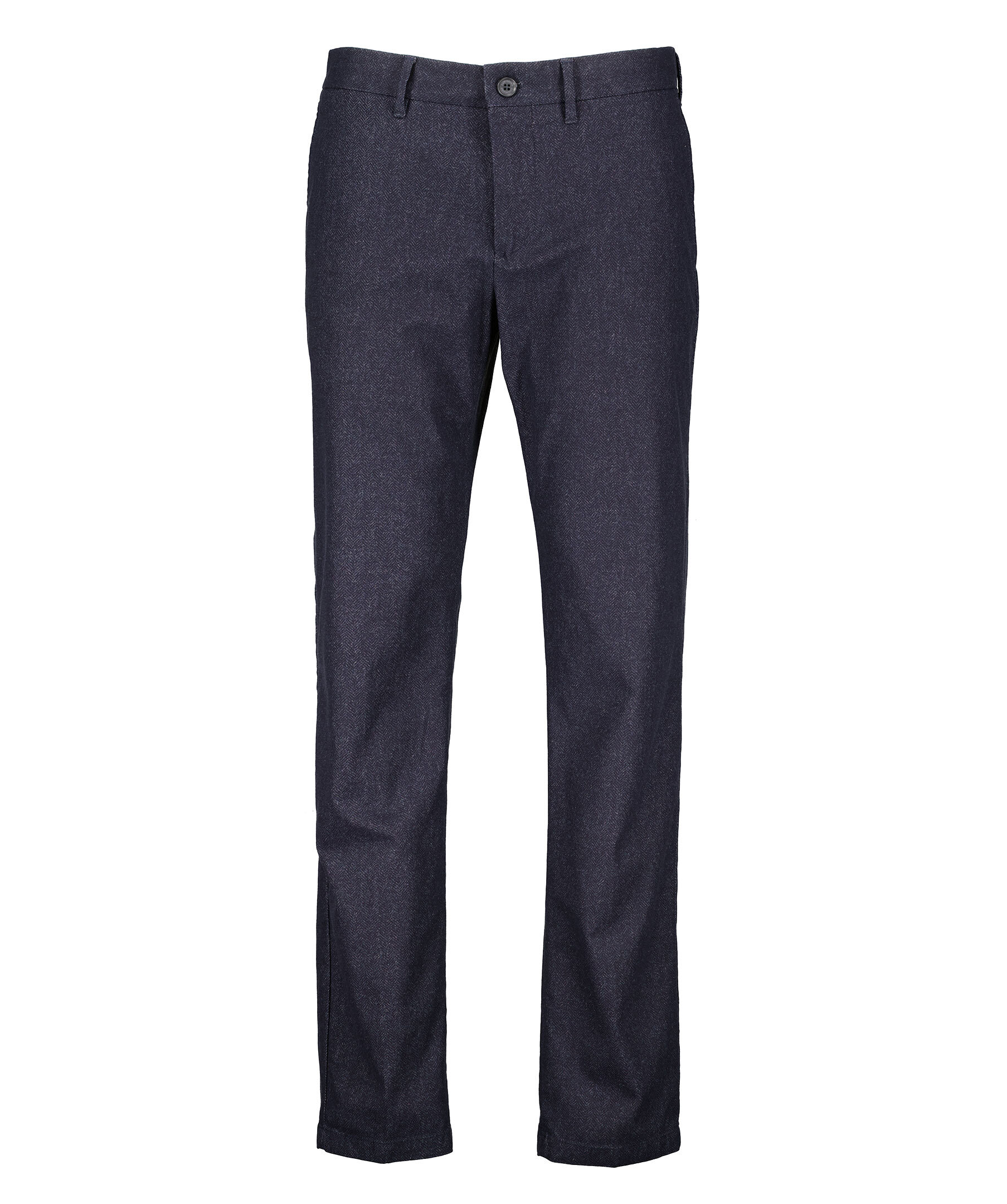 Mörkblå fiskbensmönstrade byxor från J Lindeberg. Tre fickor framtill. Passpoalerade bakfickor med knapp. Pressveck framtill. Gylf som stängs med dragkedja och knappar. Hällor för bälte. Smal passform.