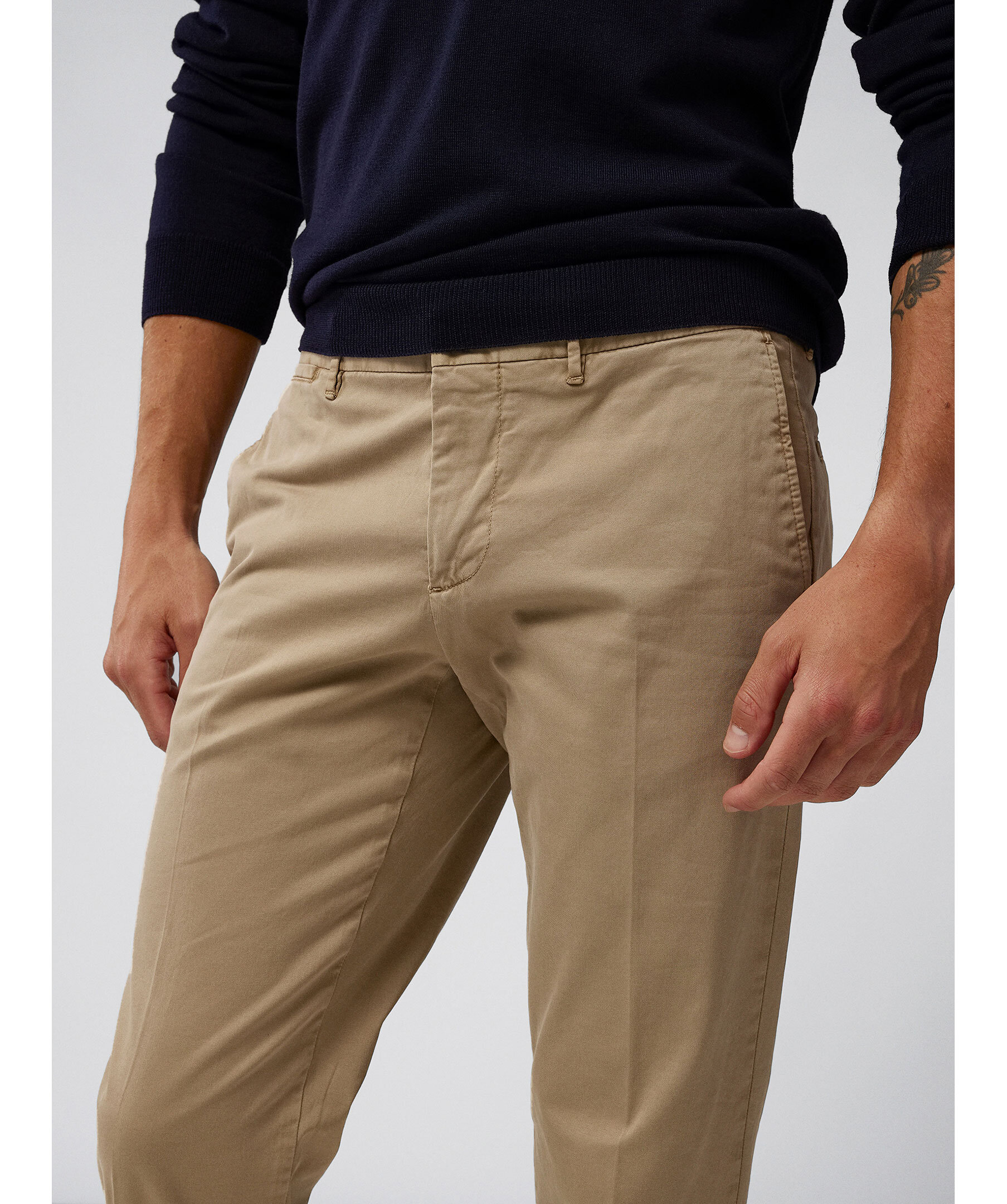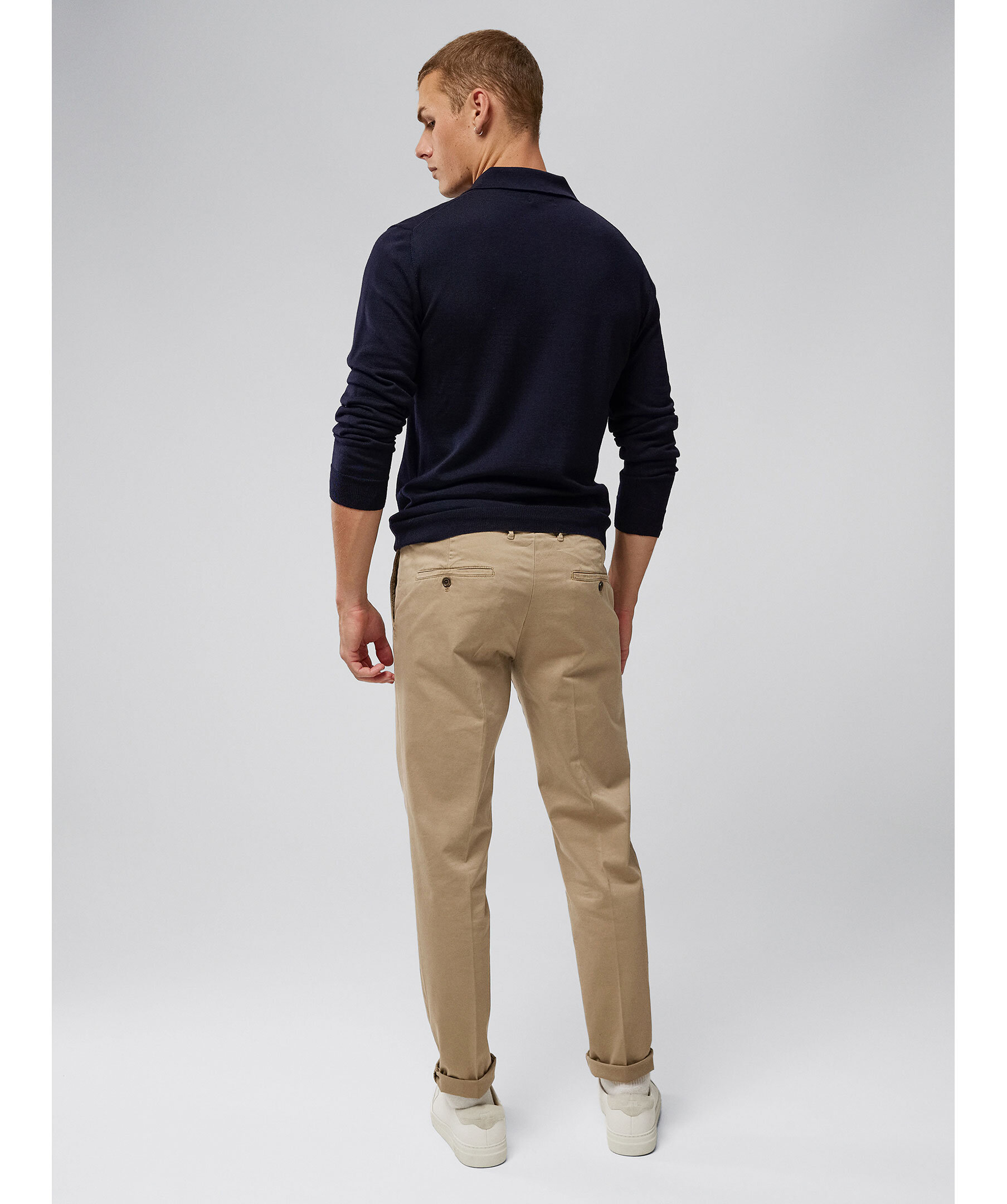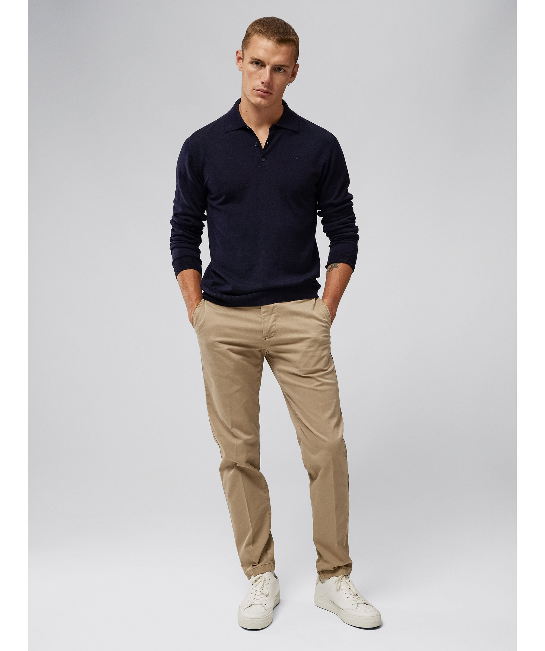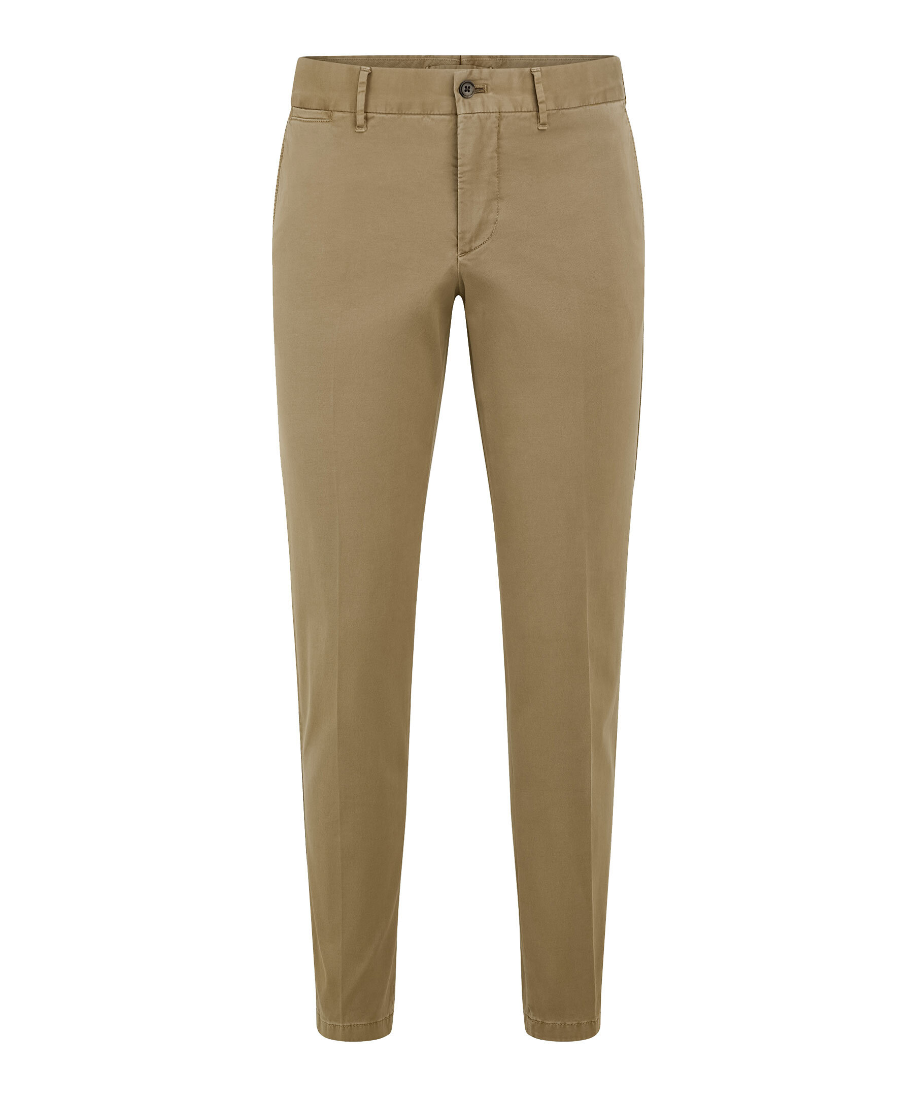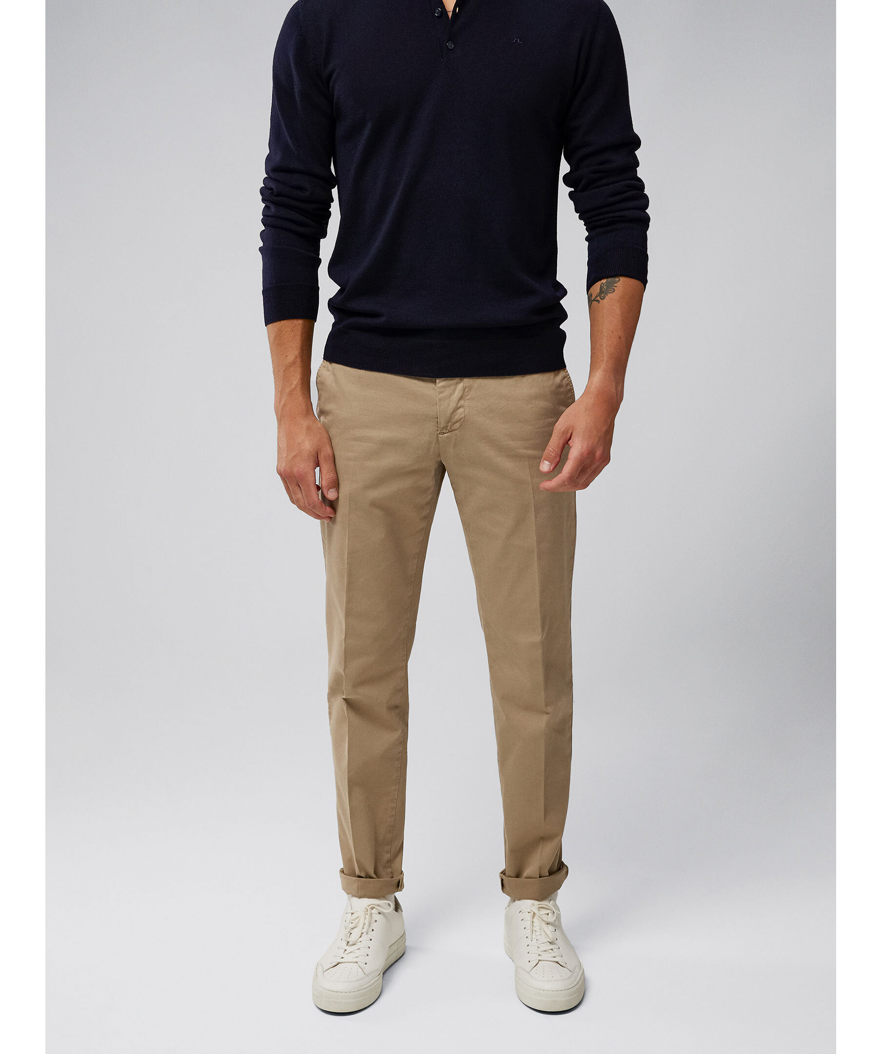 Khakifärgade, stretchiga byxor i chinostil från J Lindeberg. Byxorna har bälteshällor i midjan, två snedställda sidofickor samt två passpoalfickor med knapp baktill. Broderad logotyp på bakfickan, pressveck fram och bak samt blixtlåsgylf med en knapp. Tillverkade i en bomullsblandning.