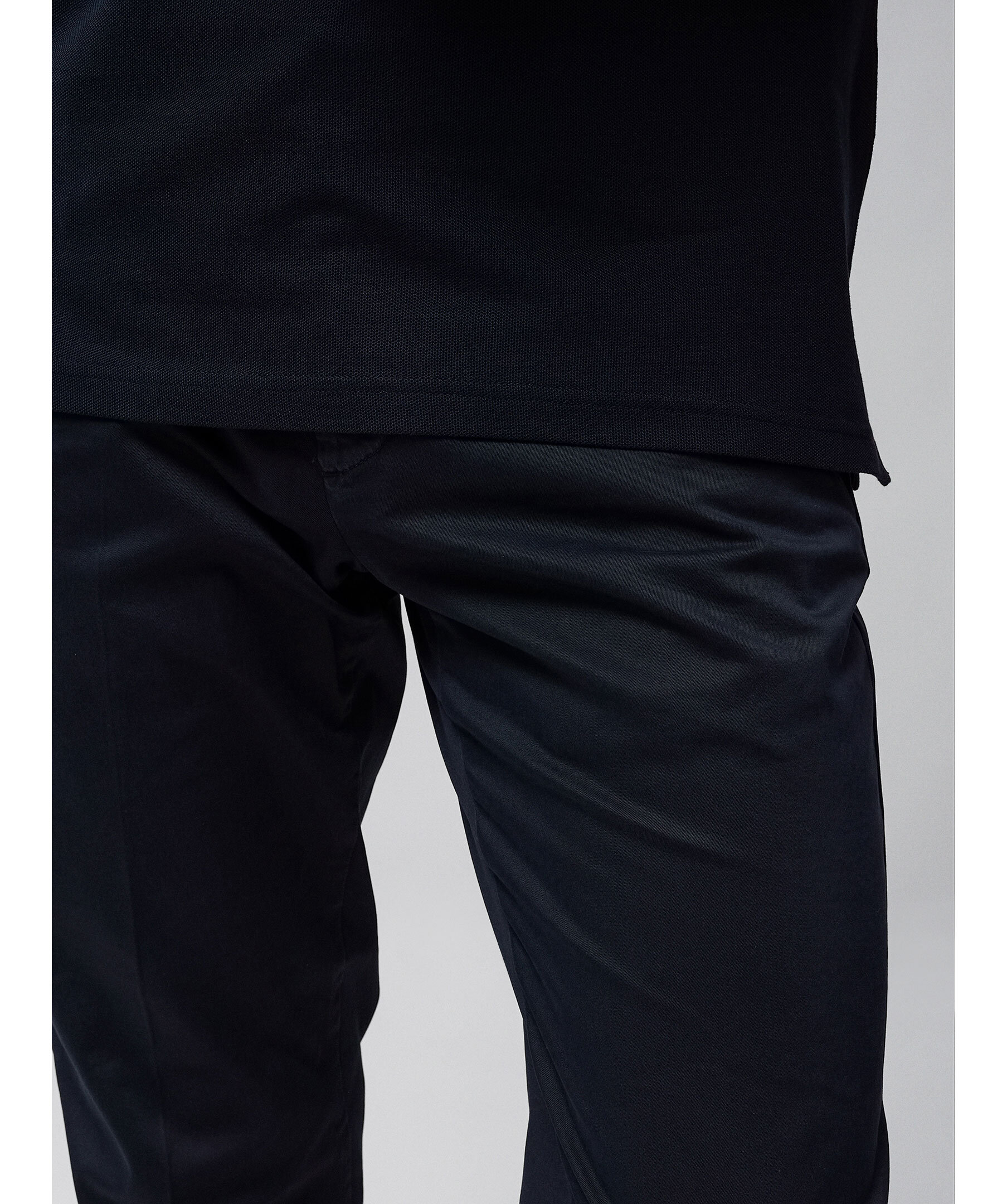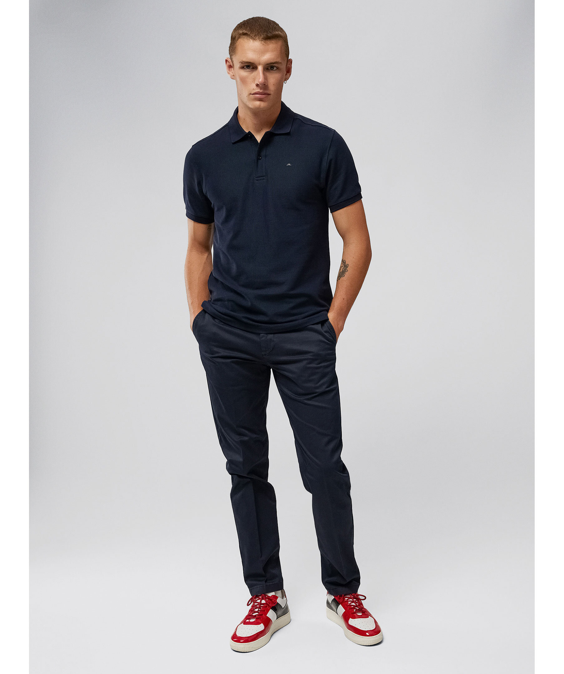 Marinblå, stretchiga byxor i chinostil från J Lindeberg. Byxorna har bälteshällor i midjan, två snedställda sidofickor samt två passpoalfickor med knapp baktill. Broderad logotyp på bakfickan, pressveck fram och bak samt blixtlåsgylf med en knapp. Tillverkade i en bomullsblandning.