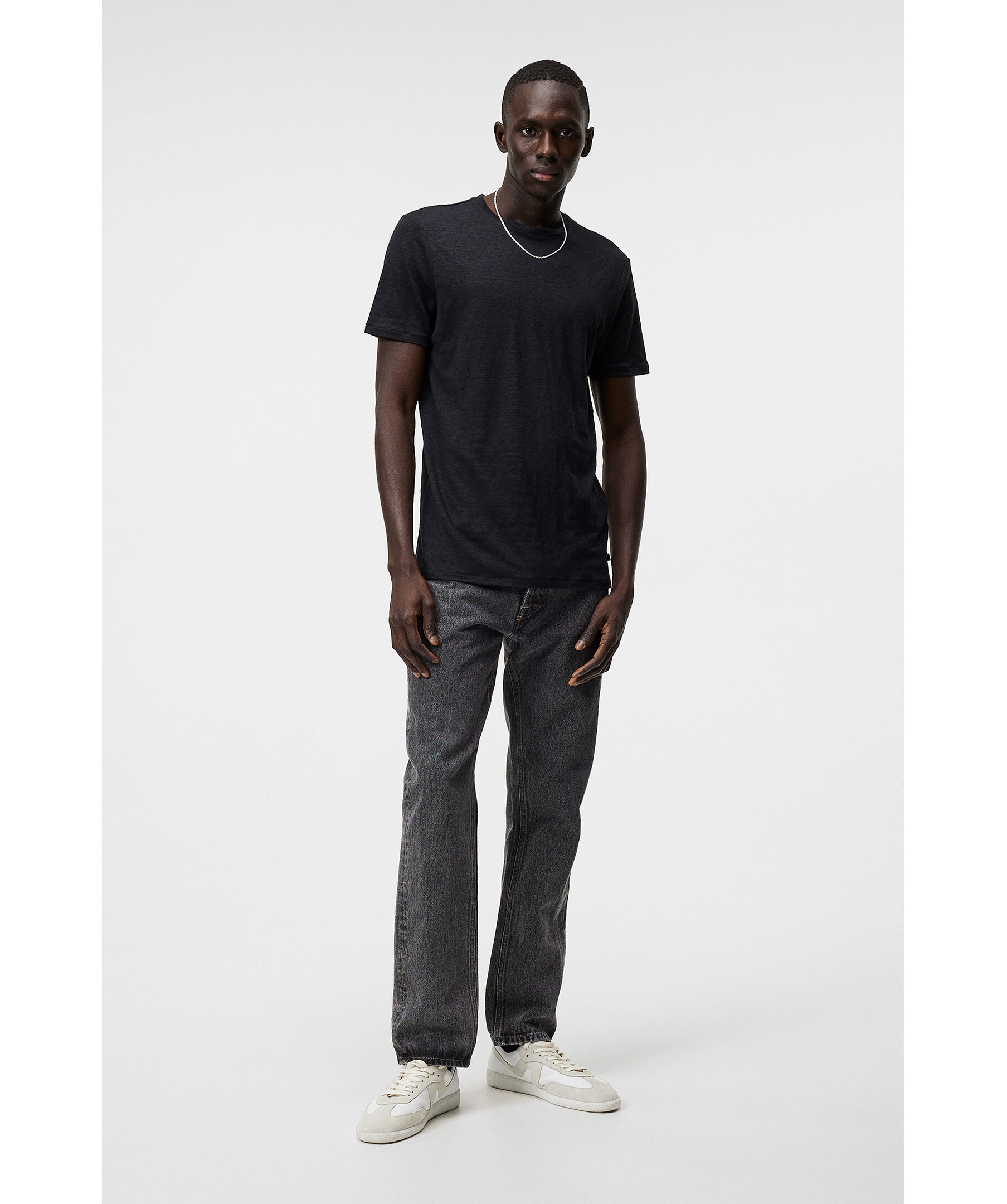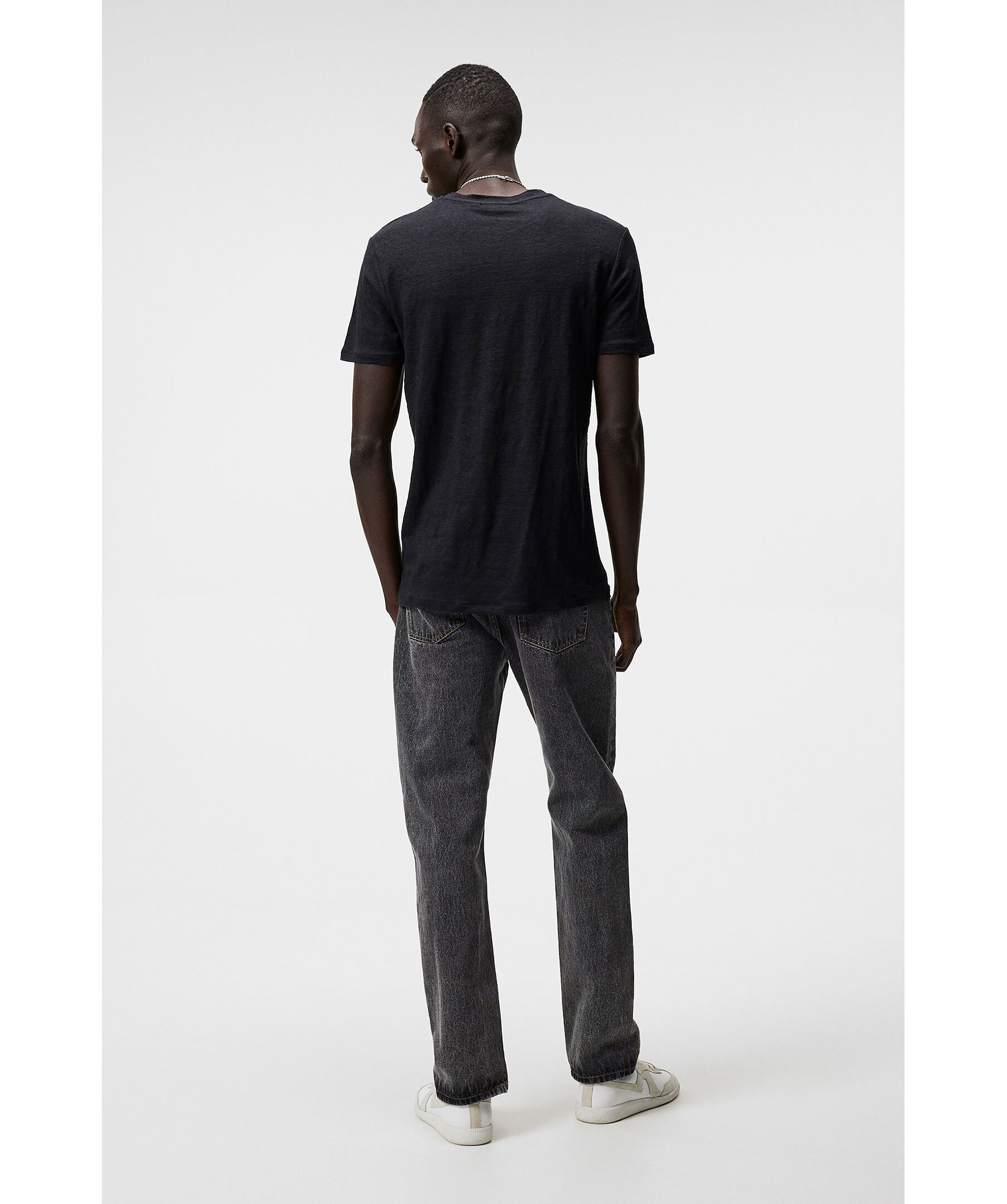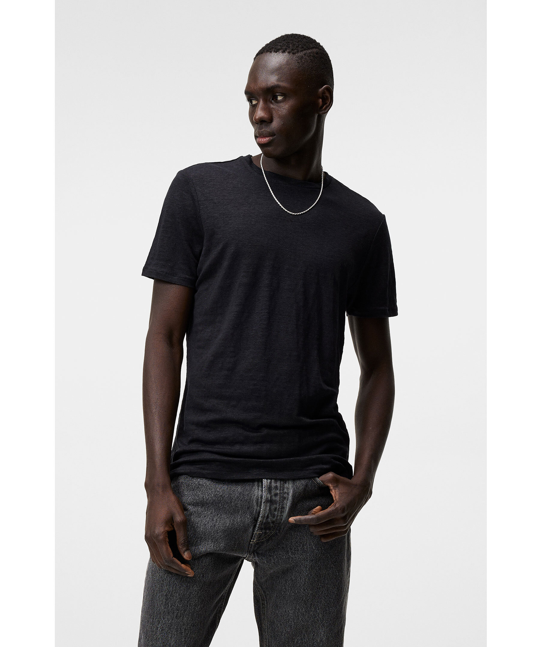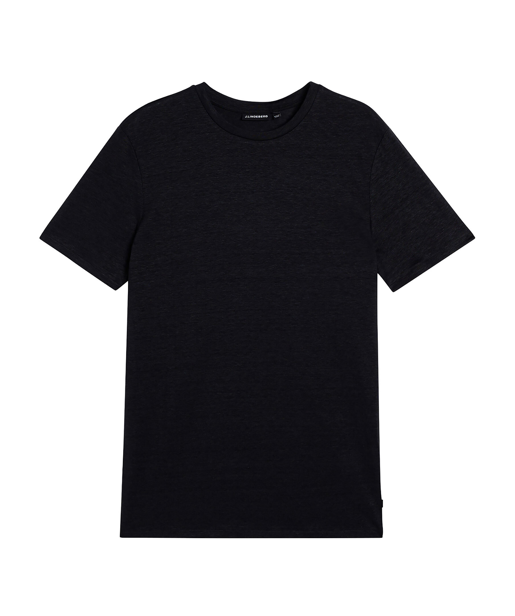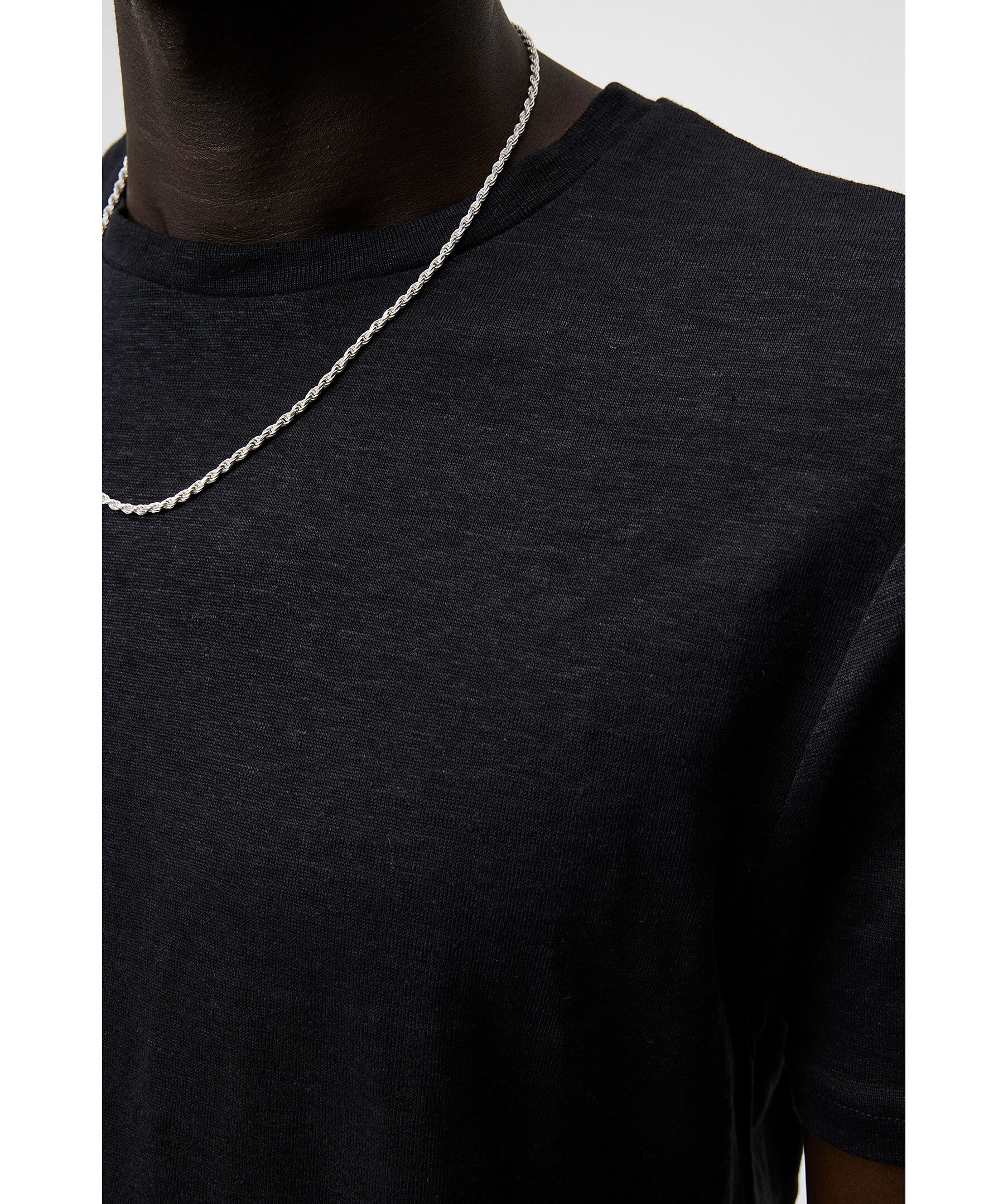Svart melerad T-shirt från J Lindeberg. Tillverkad i 100% Lin. Rundad halsringning. Avslappnad passform. JL-etikett i sidsömmen.
