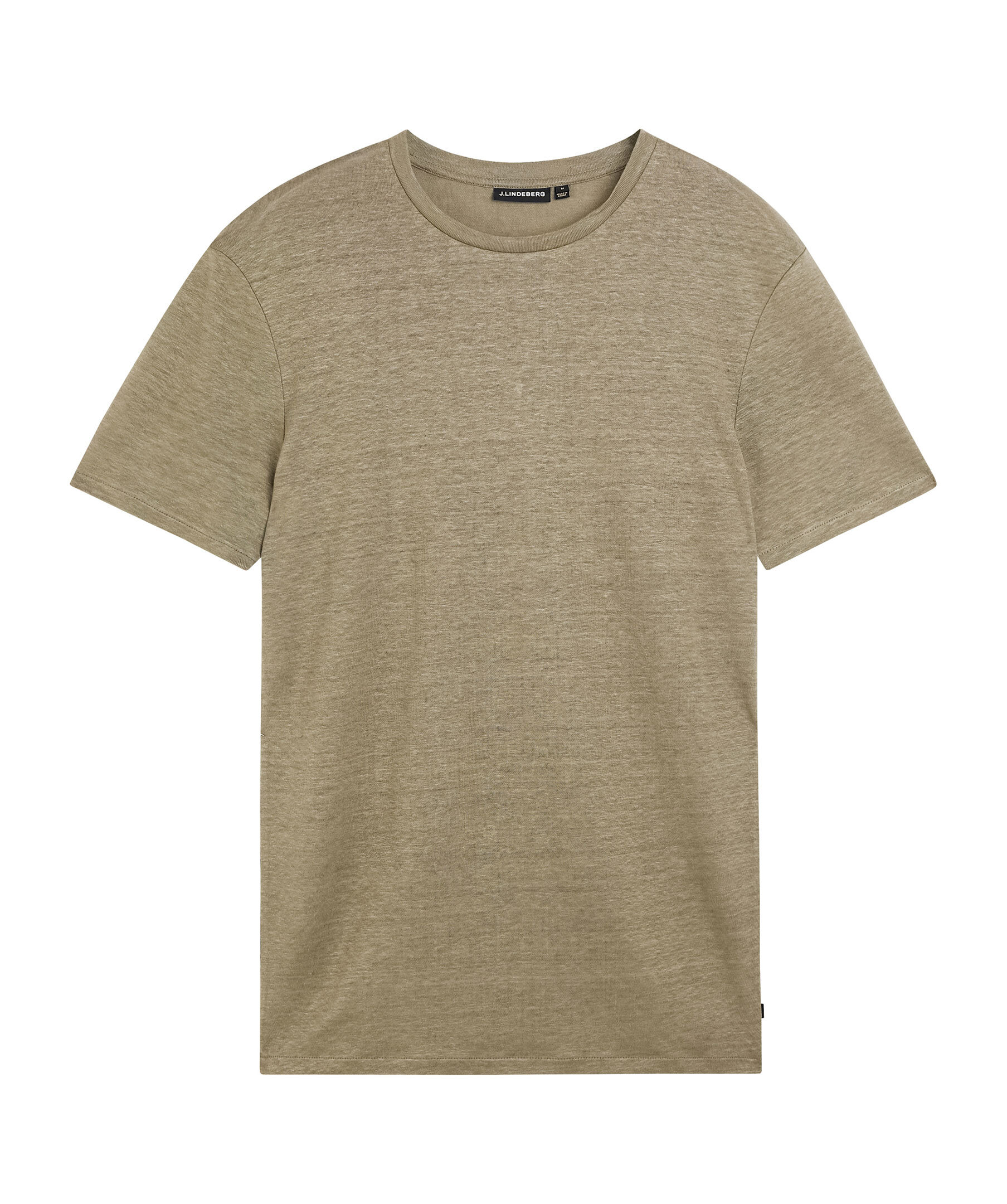 Grönbeige melerad T-shirt från J Lindeberg. Tillverkad i 100% Lin. Rundad halsringning. Avslappnad passform. JL-etikett i sidsömmen.