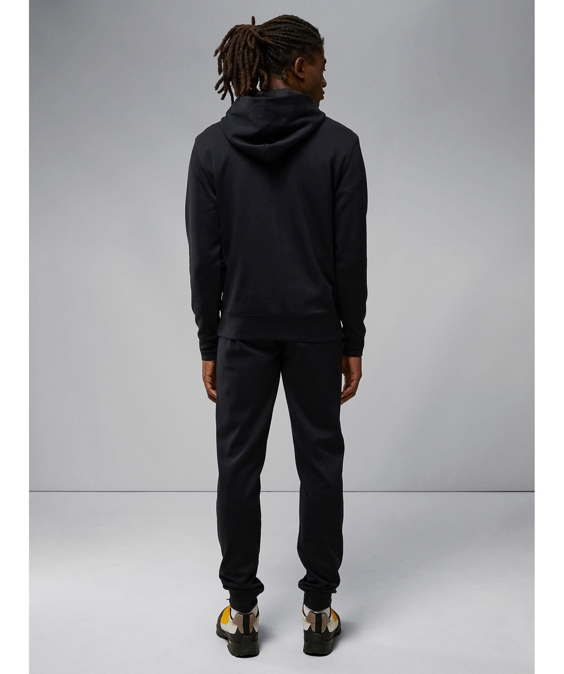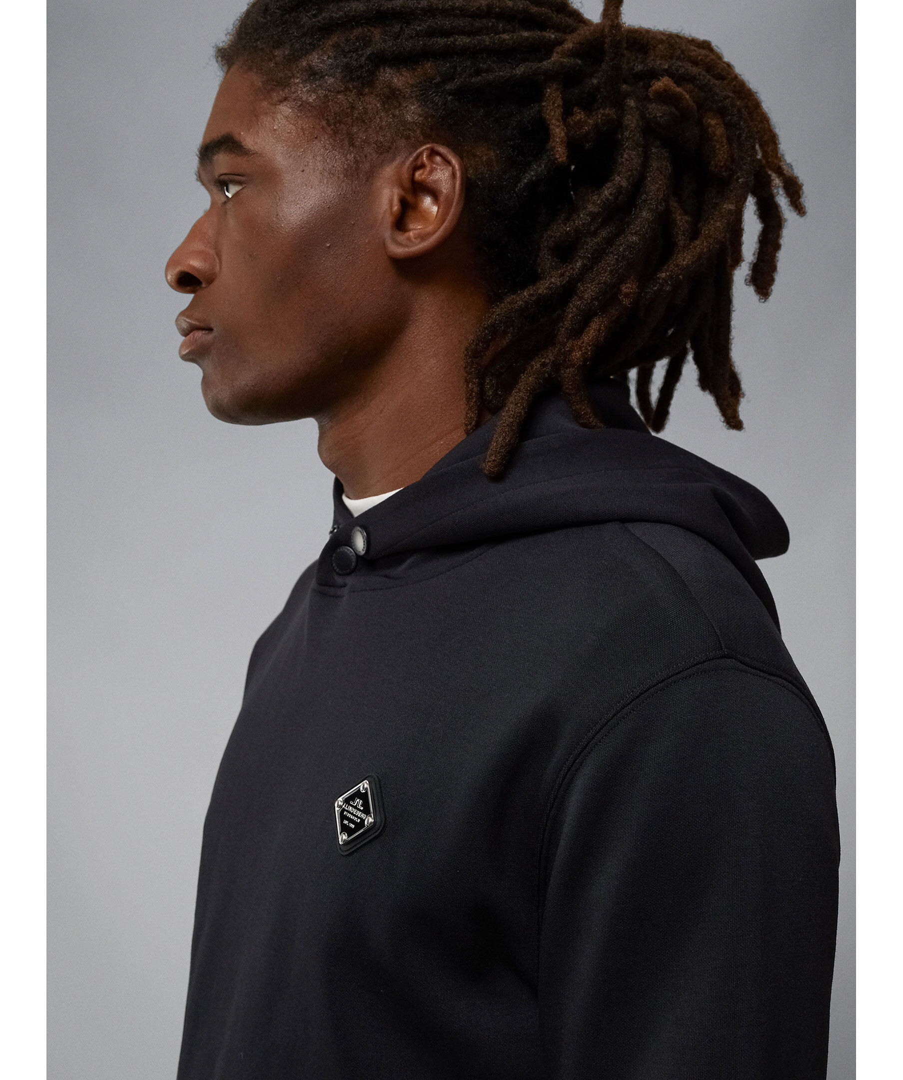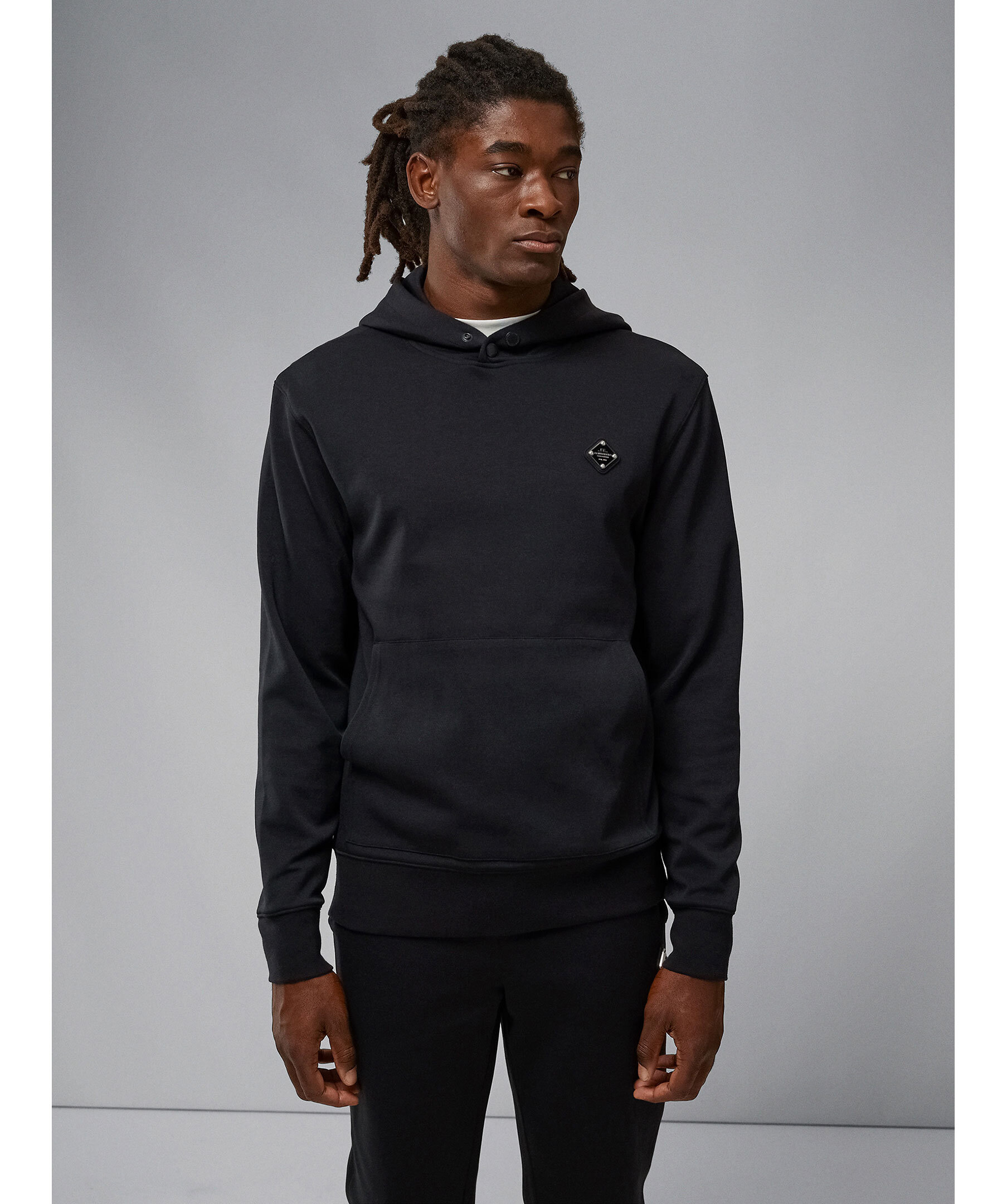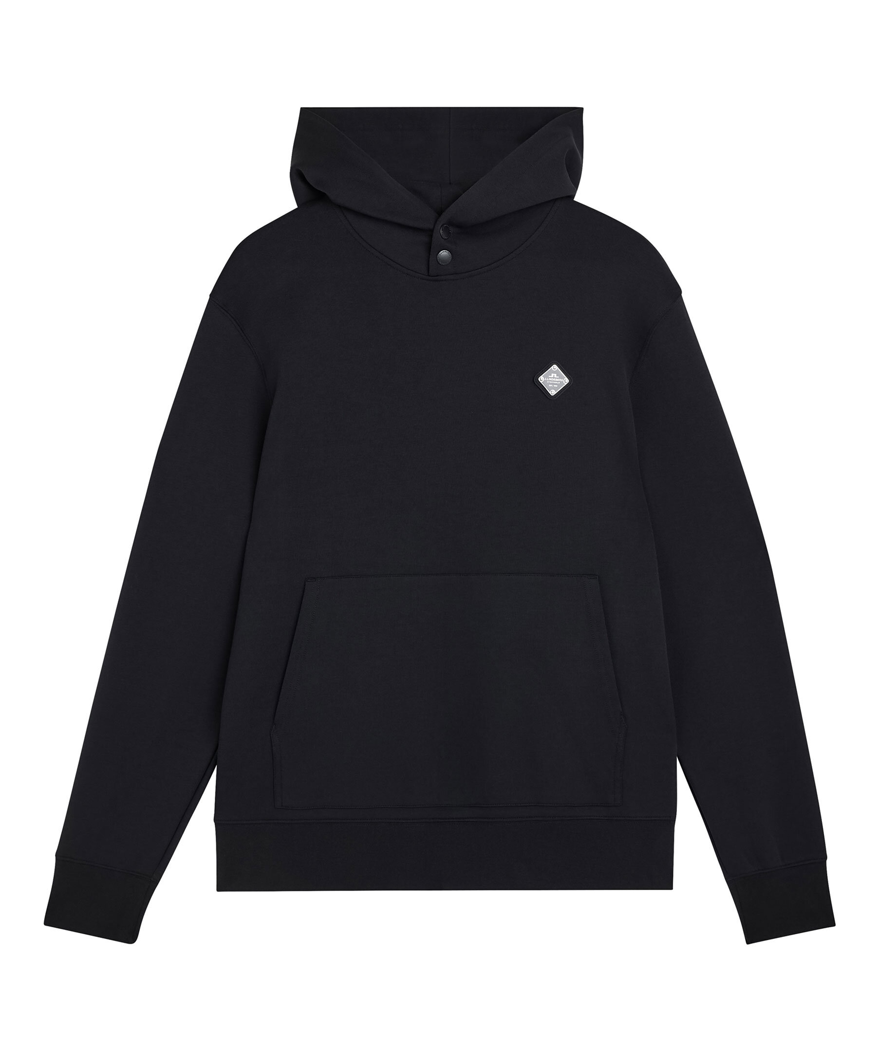 Svart hoodie från J.Lindeberg. Diamantformat logotypeblem i metall på vänster sida av bröstet, samt en stor känguruficka på magen. Fast huva med två tryckknappar fram, långa ärmar med muddar i ärmslut och i plaggslut. Slät, dubbelsidig jerseykvalitet och normal passform.