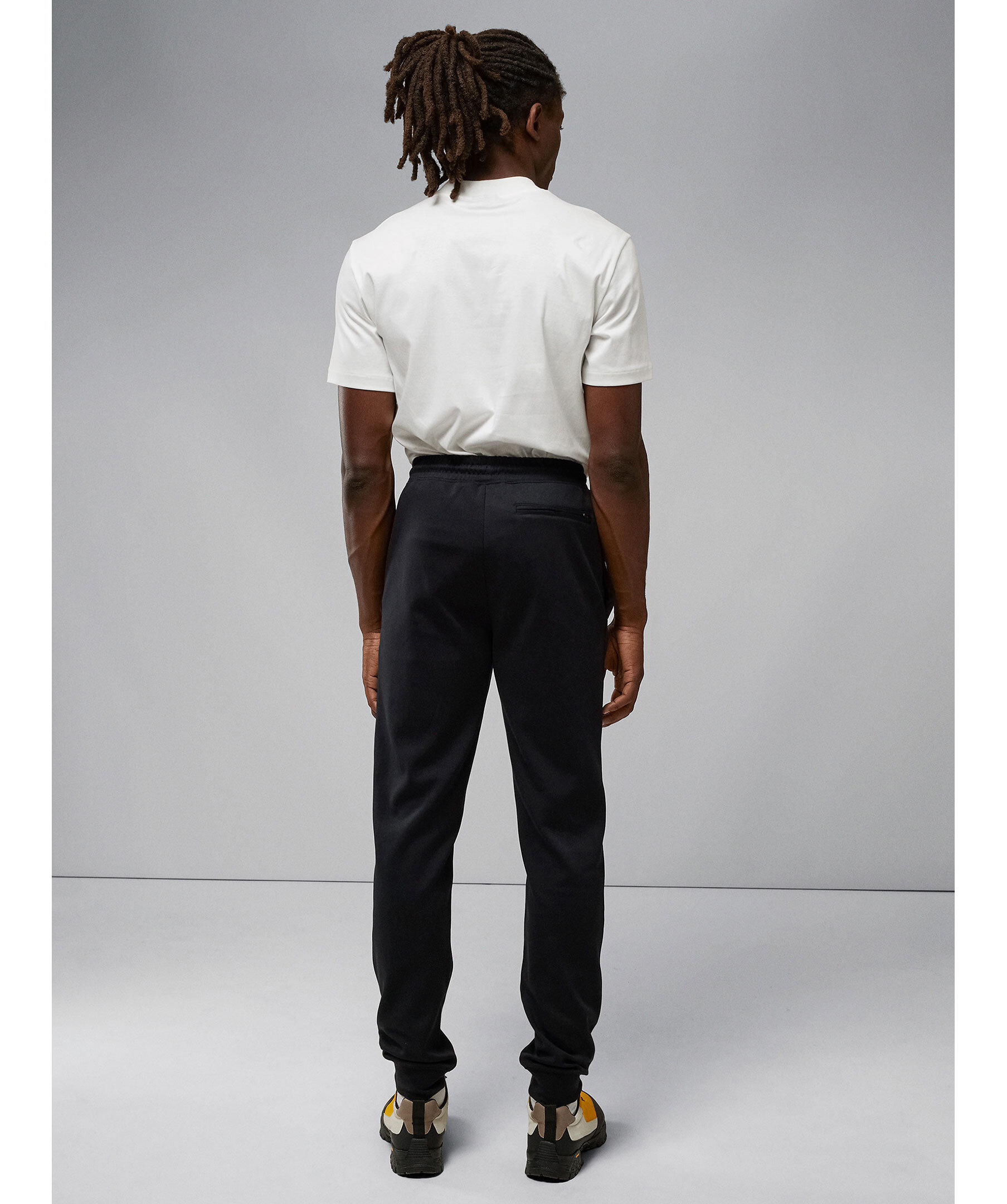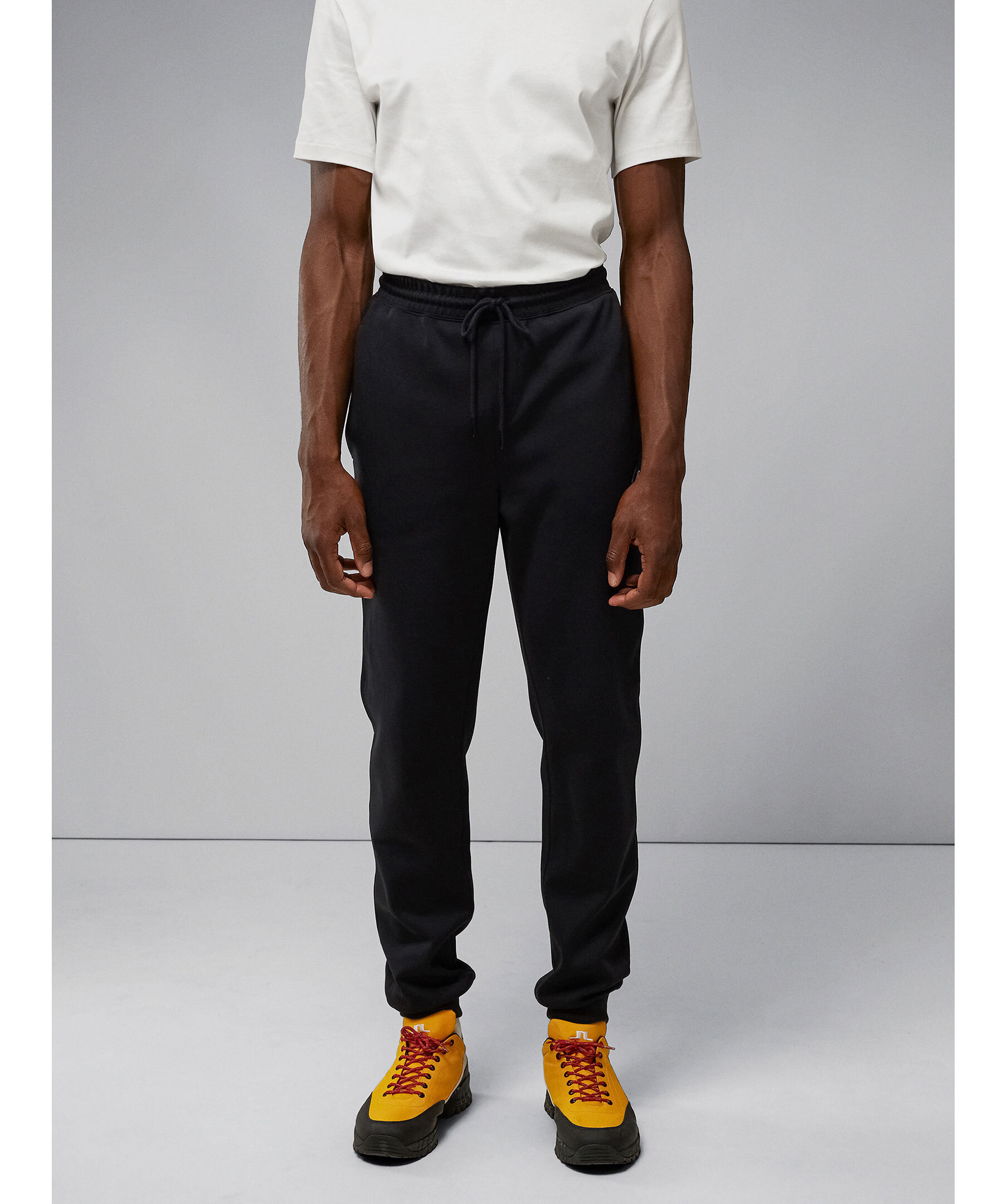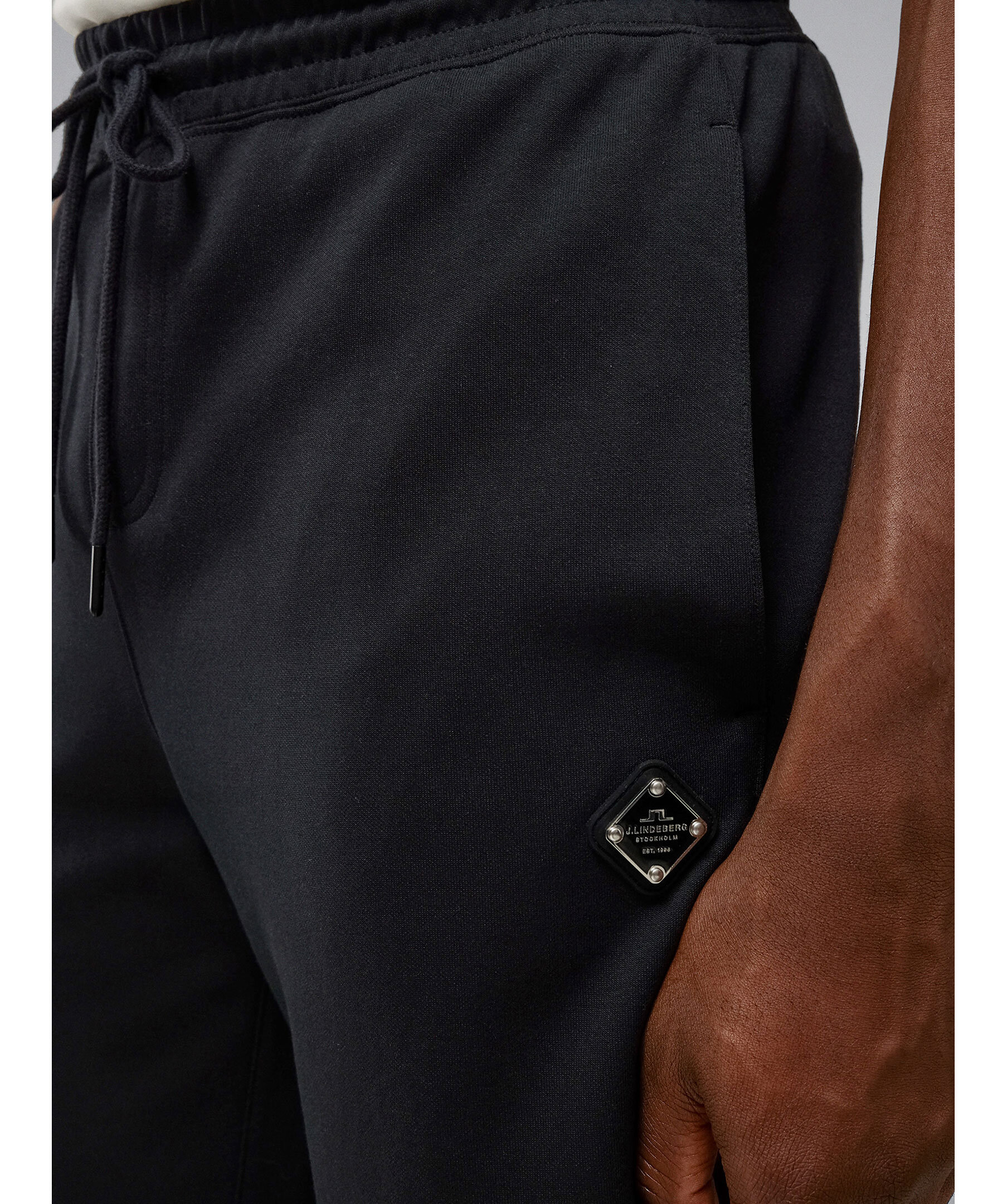 Svarta mjukisbyxor i bomullsblandning från J.Lindeberg. Två fickor i sidorna samt muddar och snörning i midjan samt muddar i benslut. Logotyp på vänster ben i gummi och metall.