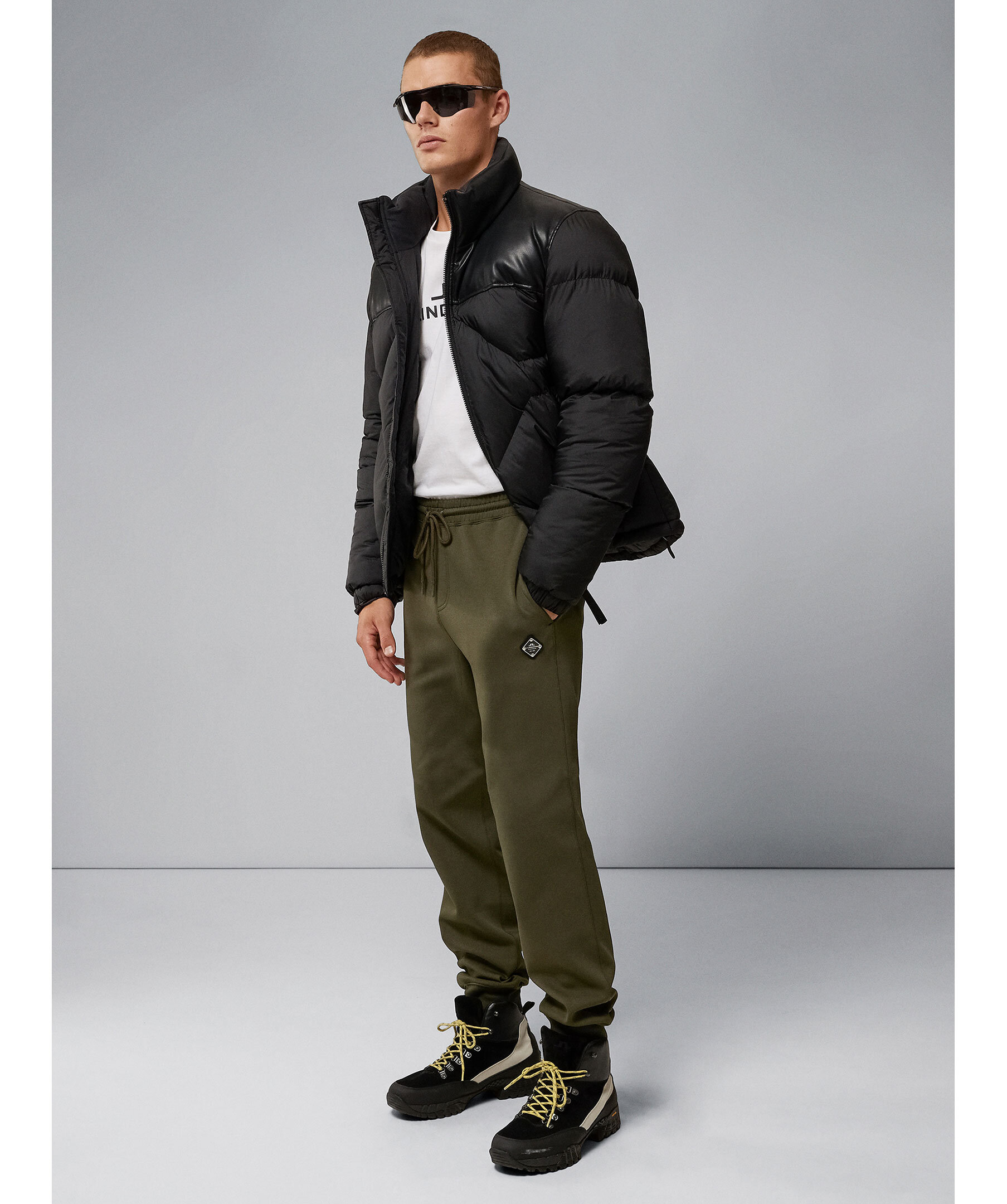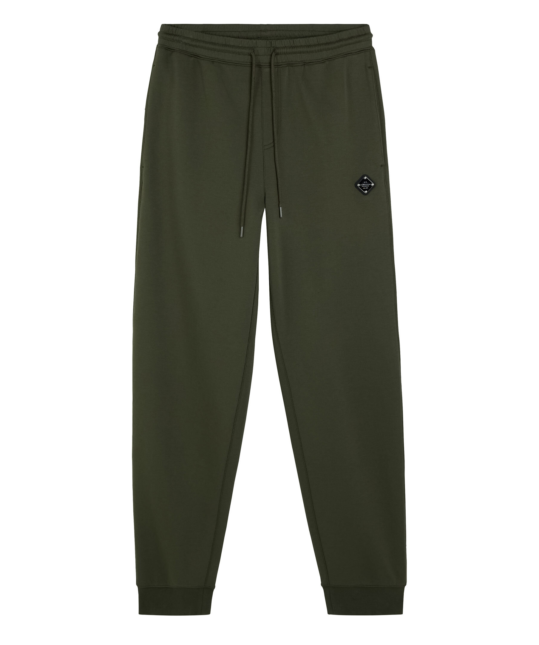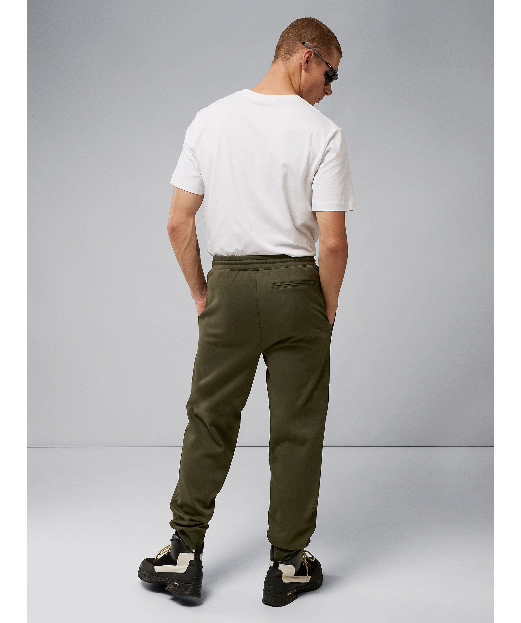 Mossgröna mjukisbyxor i bumollsblandning från J.Lindeberg. J.Lindeberg-logotypmärke i metall framtill på det vänstra benet samt ribbade avsmalnande muddar vid benslutet. Elastiskt mudd i midjan med snörning och bakficka med dold dragkedja samt öppna fickor fram.