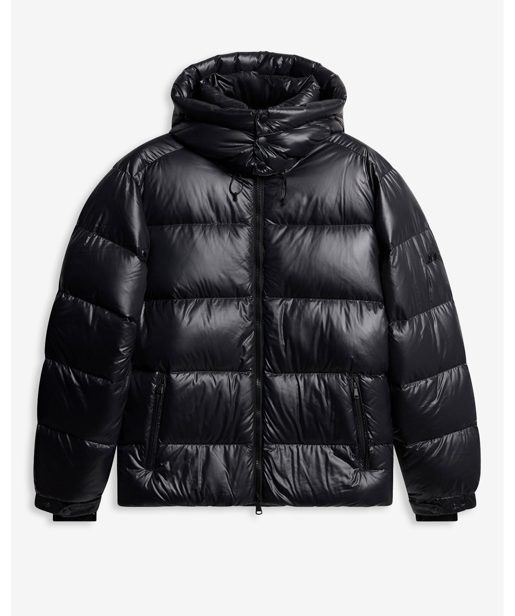 Svart, glansig pufferjacka från J Lindeberg. Jackan stängs med tvåvägsdragkedja och har fleecefodrade fickor med dragkedja, huva med justerbar dragsko samt en innerficka och logotyp på vänster ärm. Tillverkad i PFC-fritt, vattentåligt, behandlat tyg och fylld med 800fp 90/10 ankdun.
