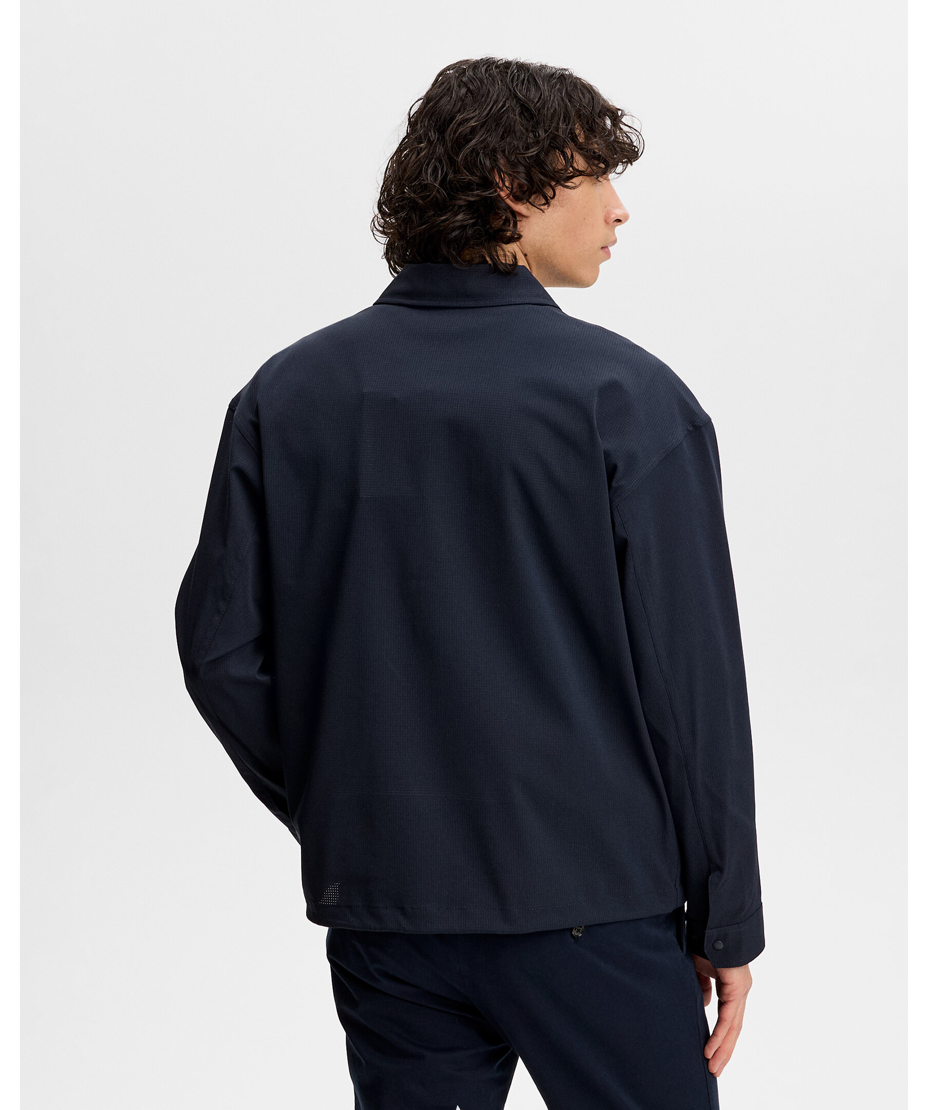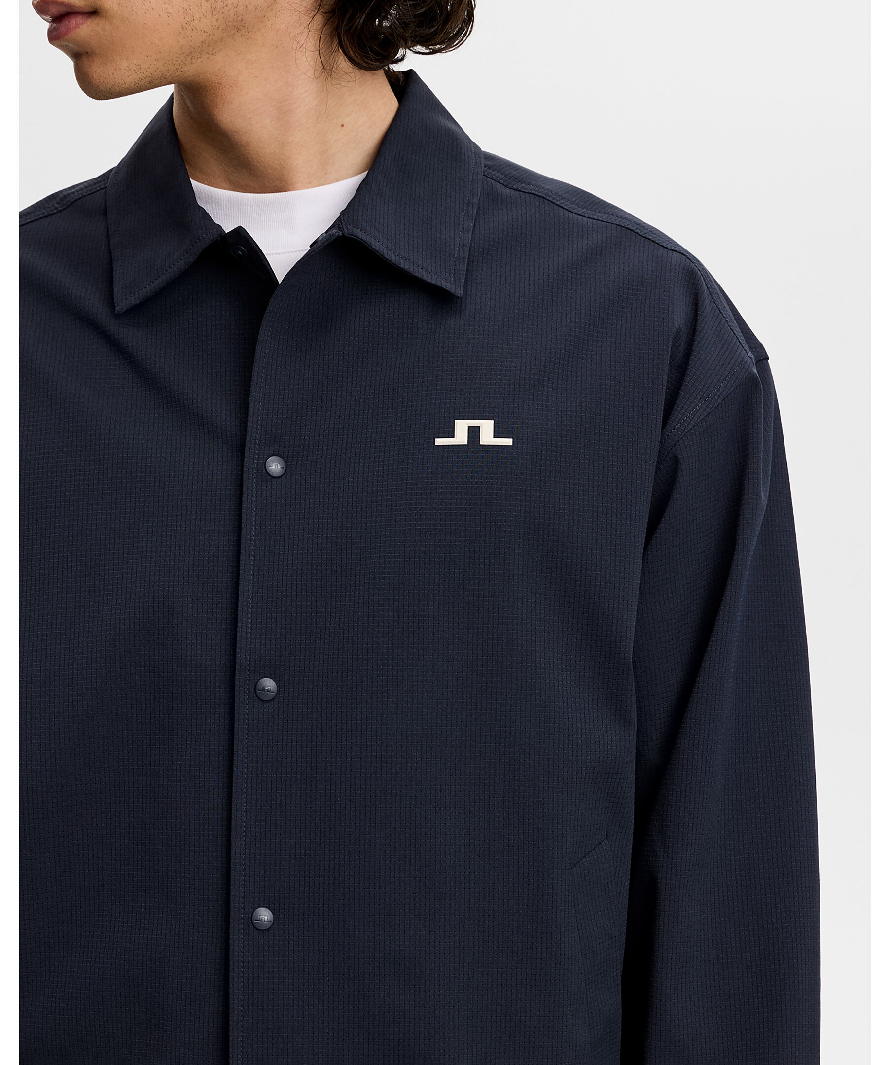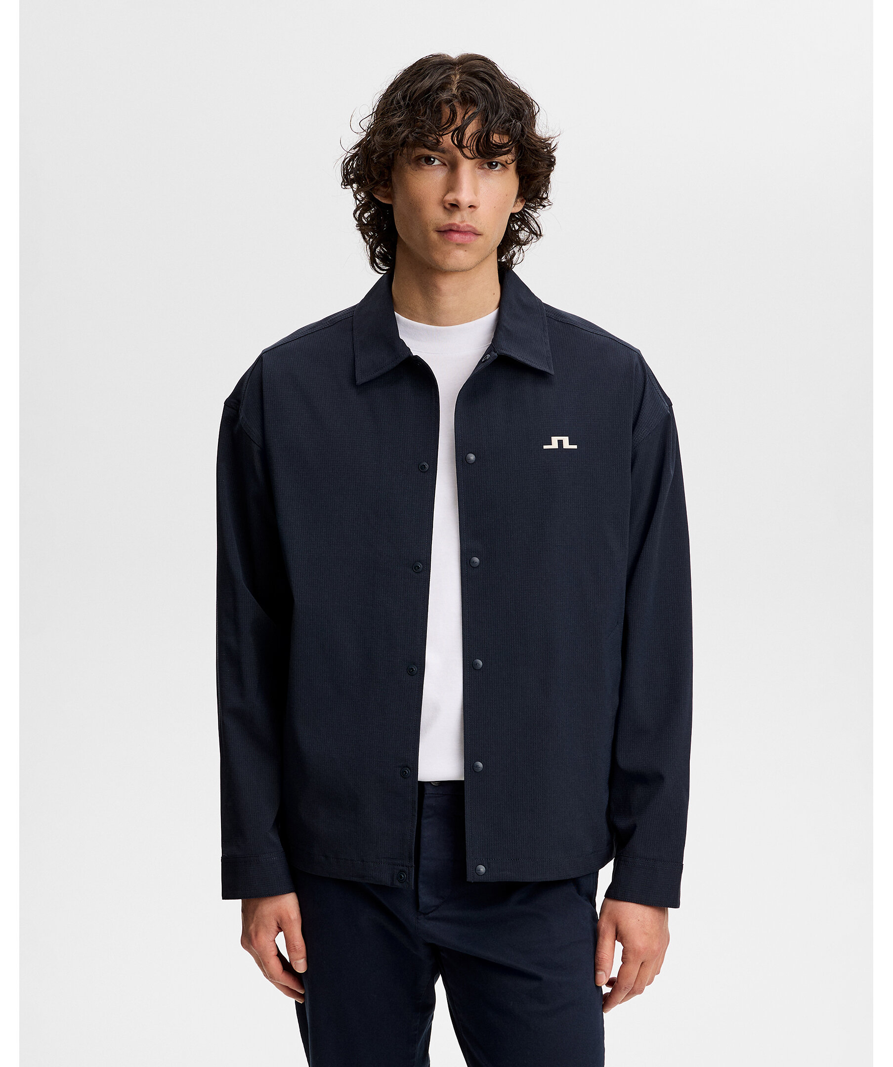 Blå overshirt från J.Lindeberg. Overshirten är skuren i lätt stretchtyg med vattenavvisande behandling och har pressknappar fram och justerbar nederkant muddar.