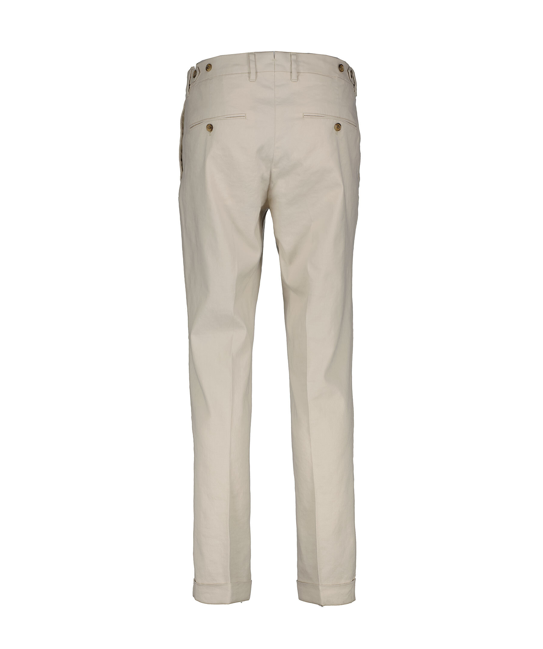 Sandfärgade linnebyxor i en chinosstil från J Lindeberg. Byxorna har bälteshällor i midjan, två sidfickor, en diskret myntficka samttvå passpoalfickor baktill med knapp. Pressveck och uppvikta ben. Tillverkade i en linne- och bomullsblandning.