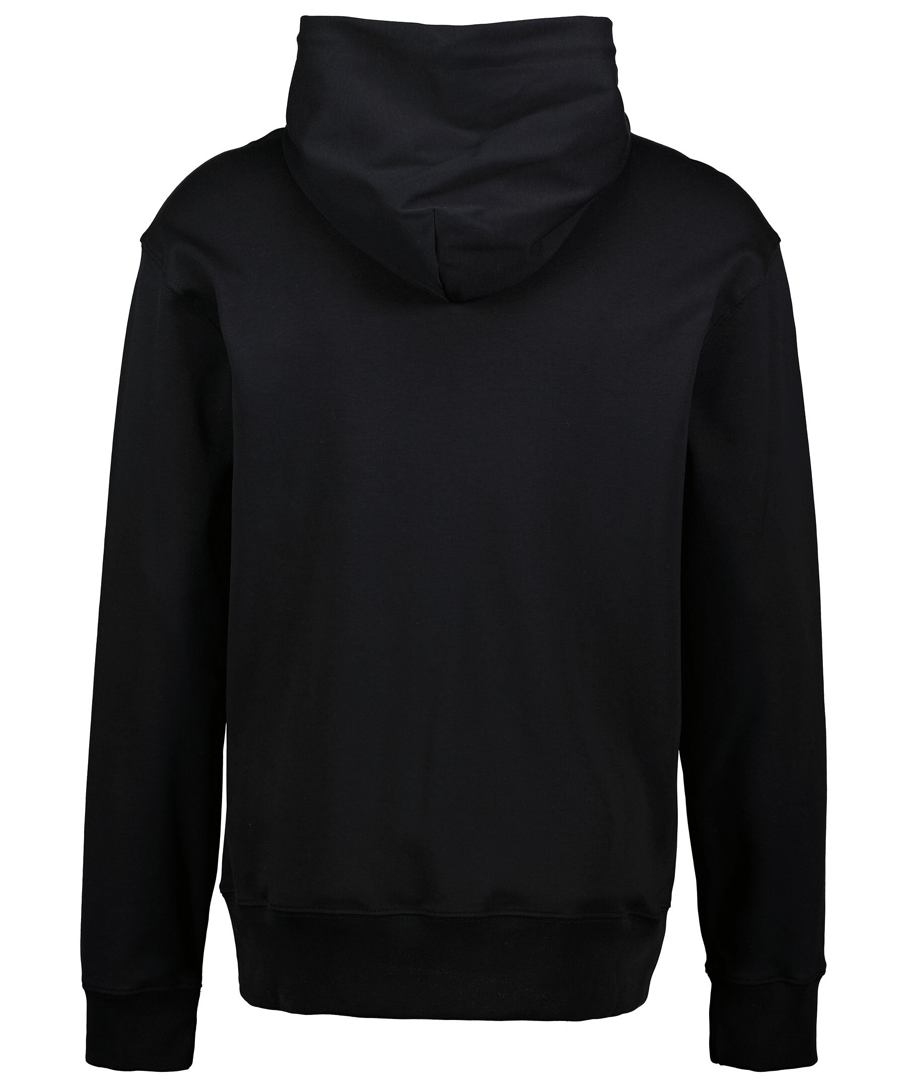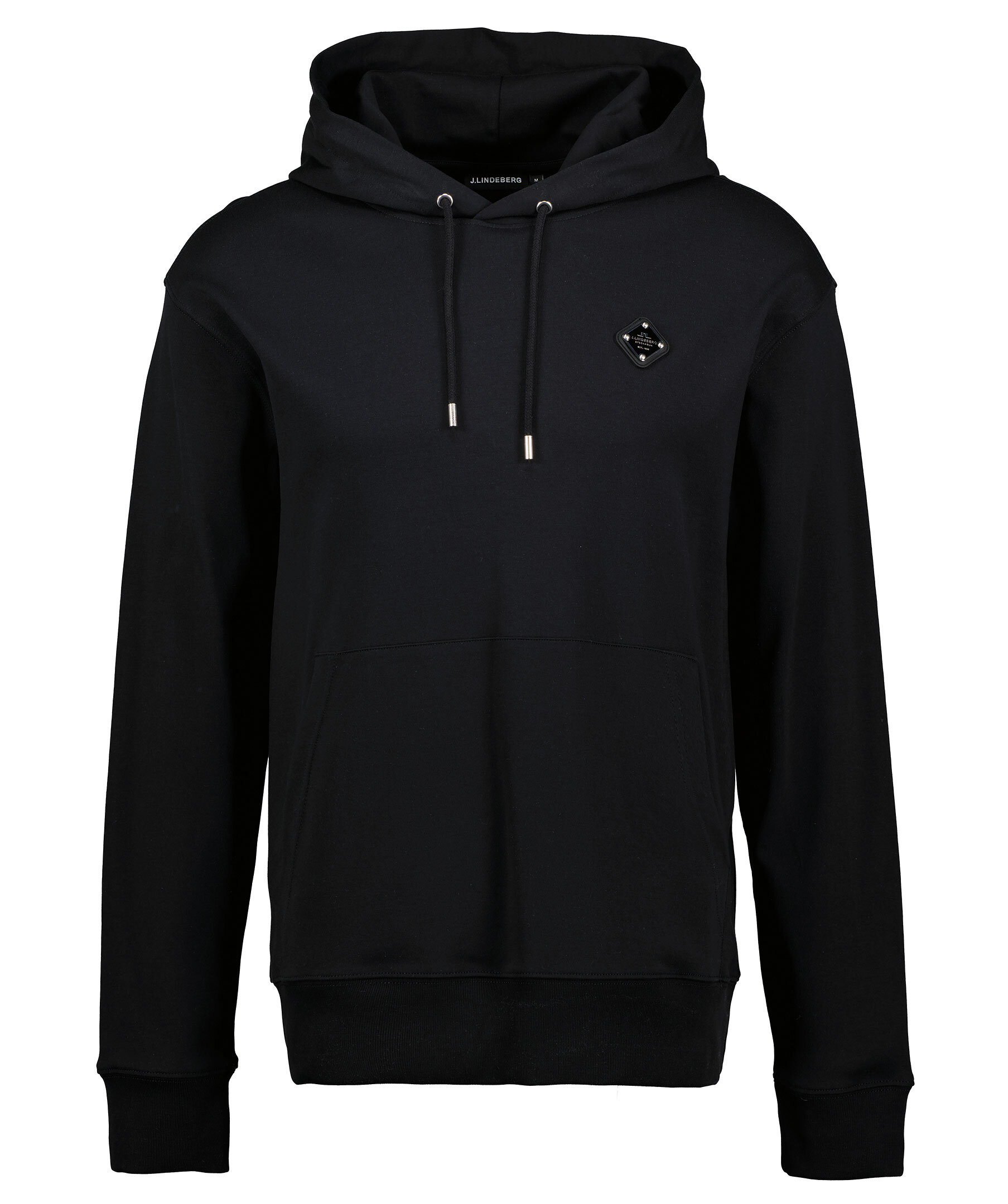 Svart hoodie från J Lindeberg. Tillverkad i 100% Bomull. Luva med dragsko och känguruficka på magen. Ribbstickade muddar i ärm och plaggslut. Patch i metall på vänster bröst.