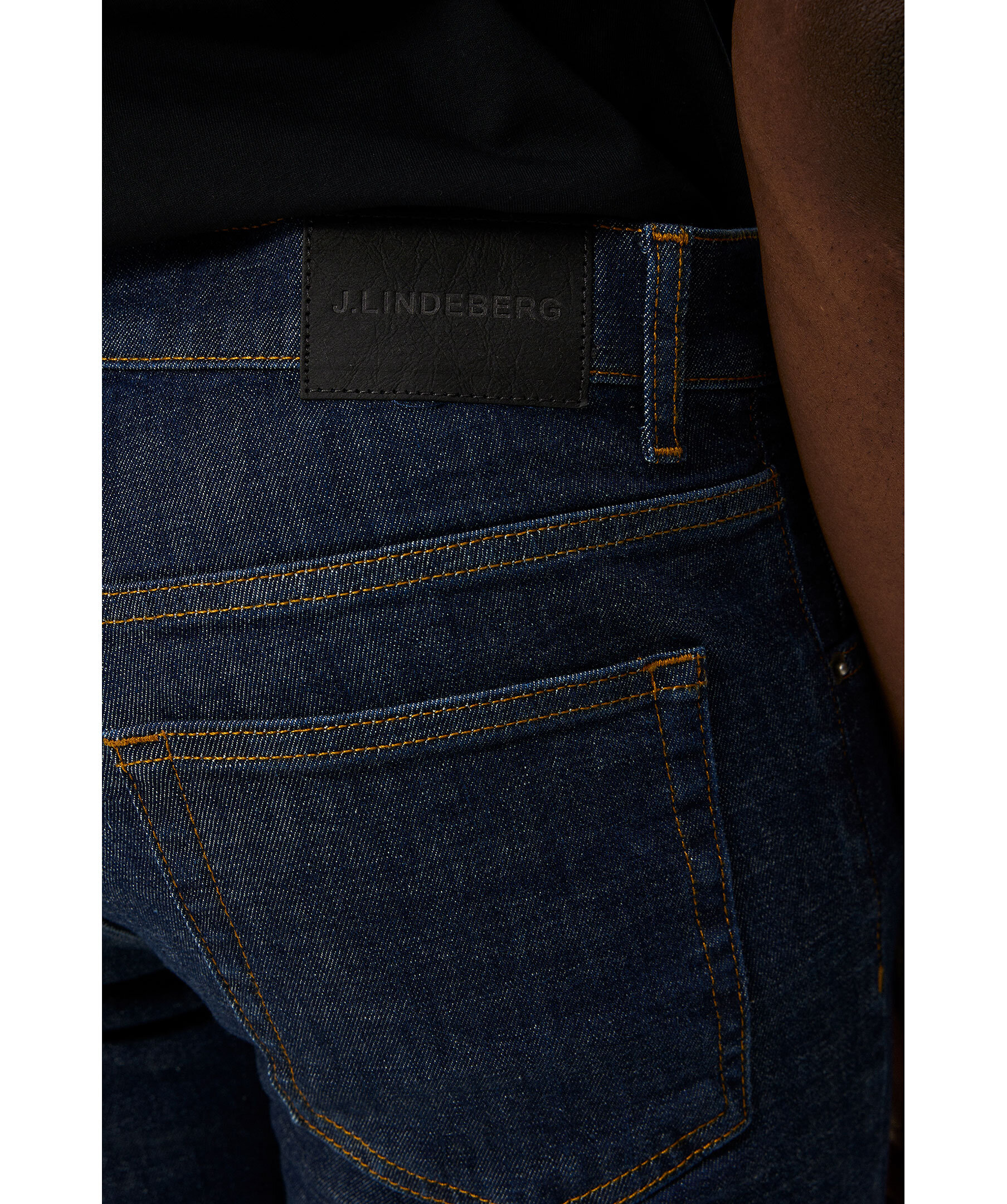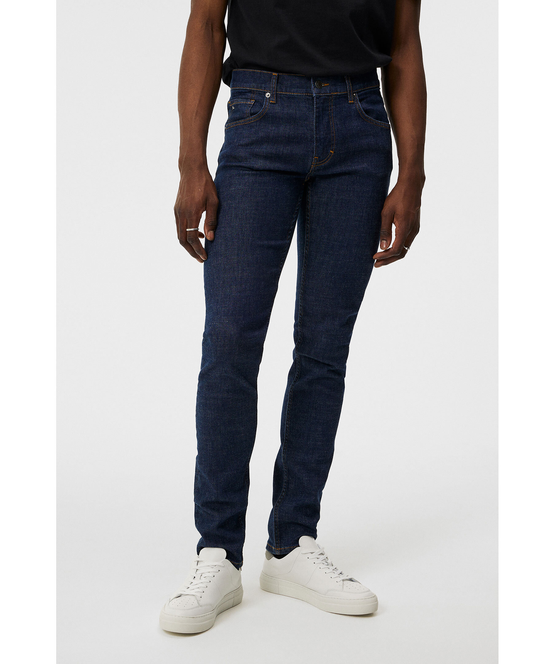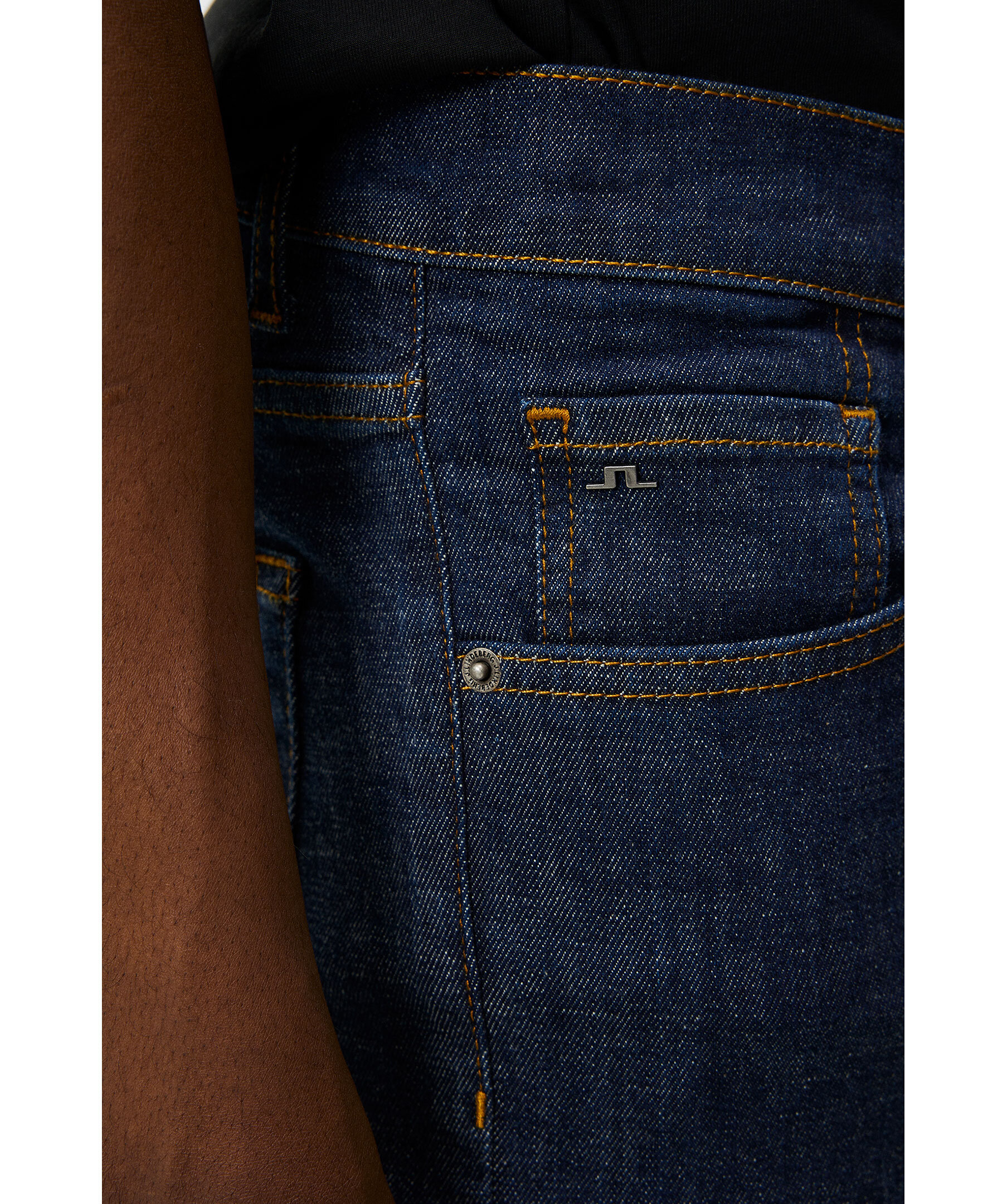 Mörkblåa jeans från J Lindeberg. Jeansen har fem fickor, gylf med dragkedja, en Jacron-lapp på baksidan och litet logotyp i metall på myntfickan. Tillverkade i en bomullsblandning.