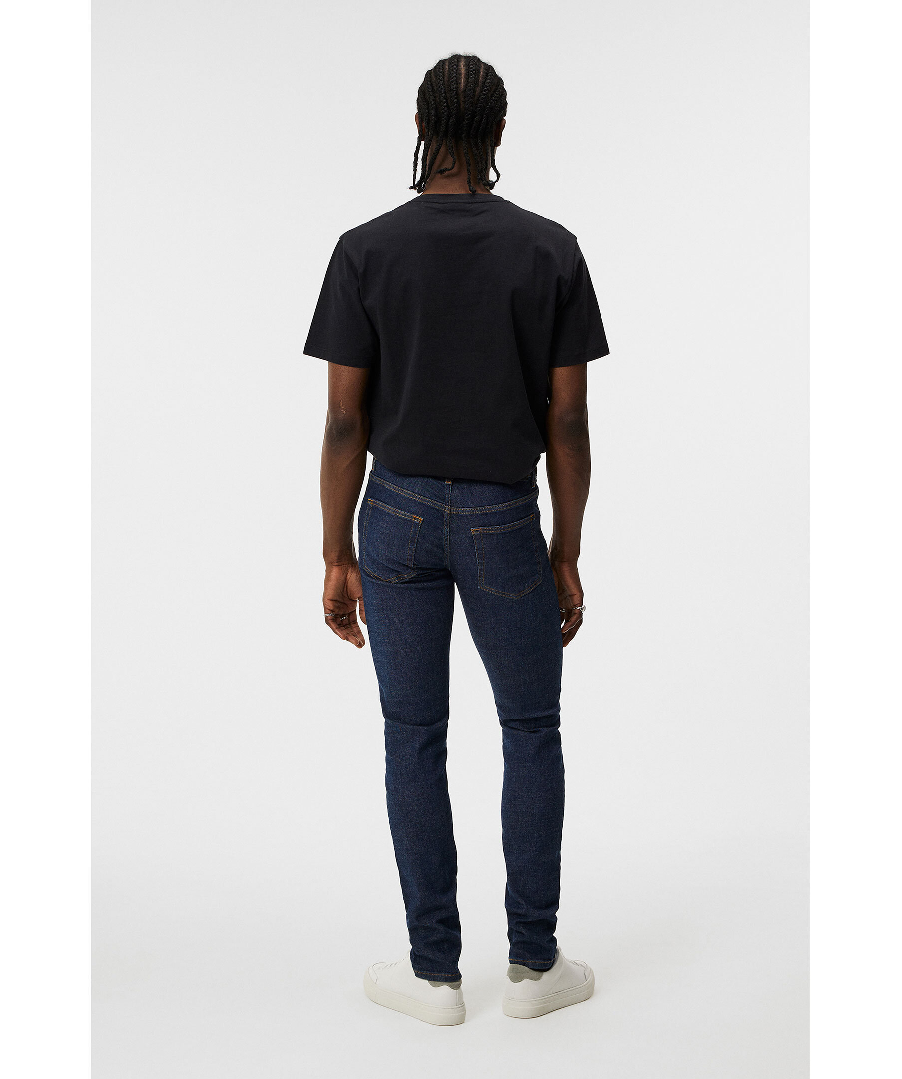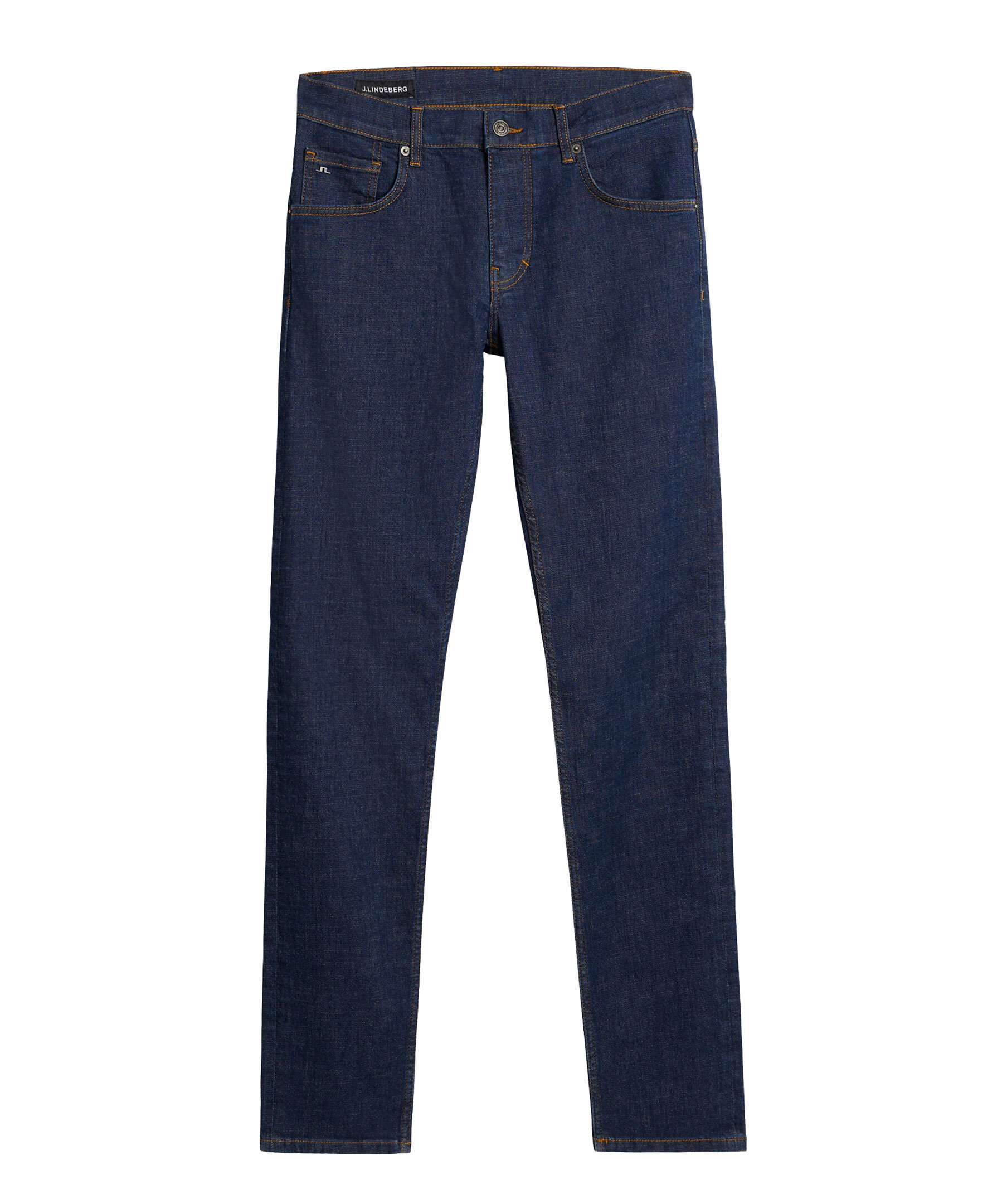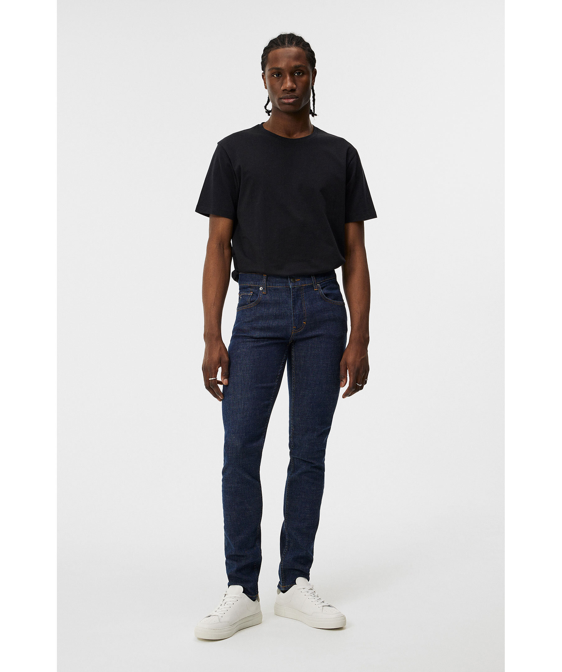 Mörkblåa jeans från J Lindeberg. Jeansen har fem fickor, gylf med dragkedja, en Jacron-lapp på baksidan och litet logotyp i metall på myntfickan. Tillverkade i en bomullsblandning.